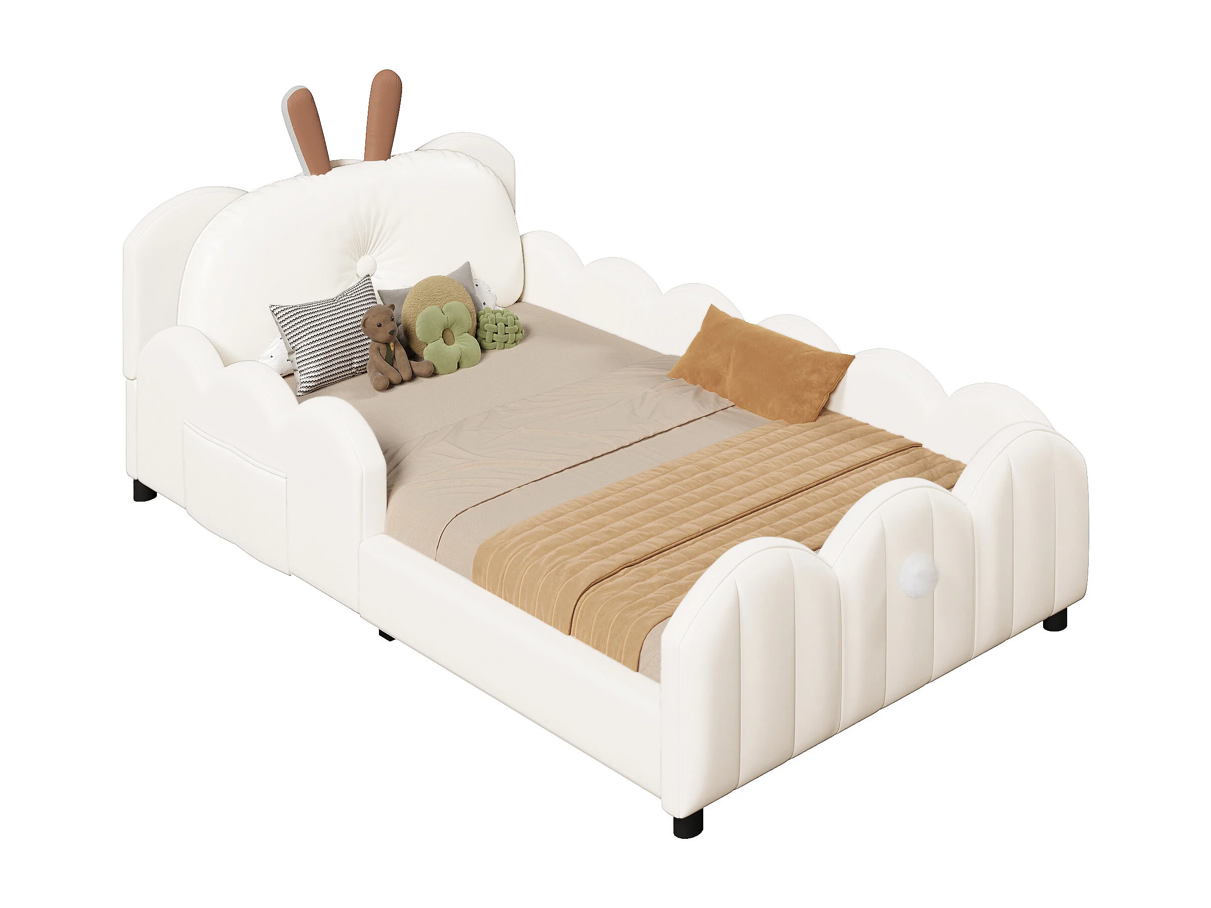 Lit enfant rembourré 90x200 cm - coussins en forme de lapin - avec sommier à lattes - MDF + velours - Beige (Matelas non inclus)