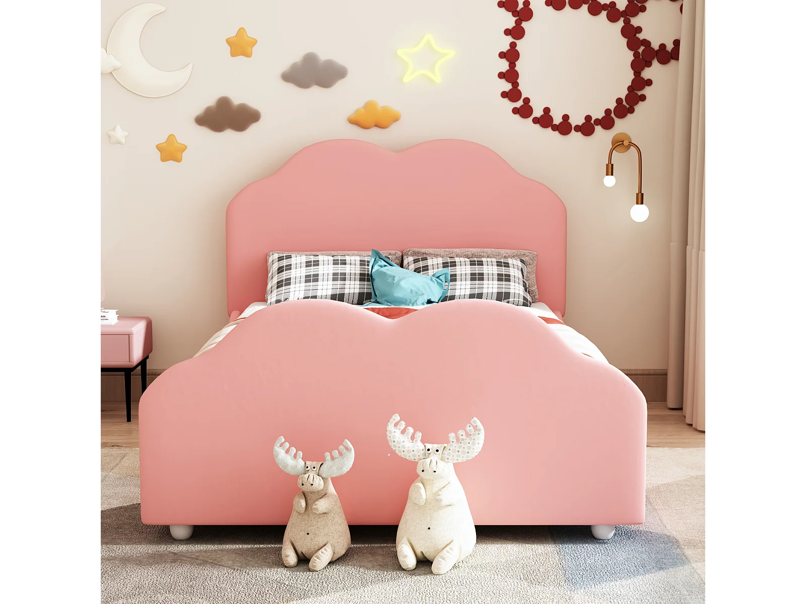 Lit enfant rembourré 90x200 cm en velours rose, tête et pied de lit en forme de nuage, cadre sécurisé avec barrière haute