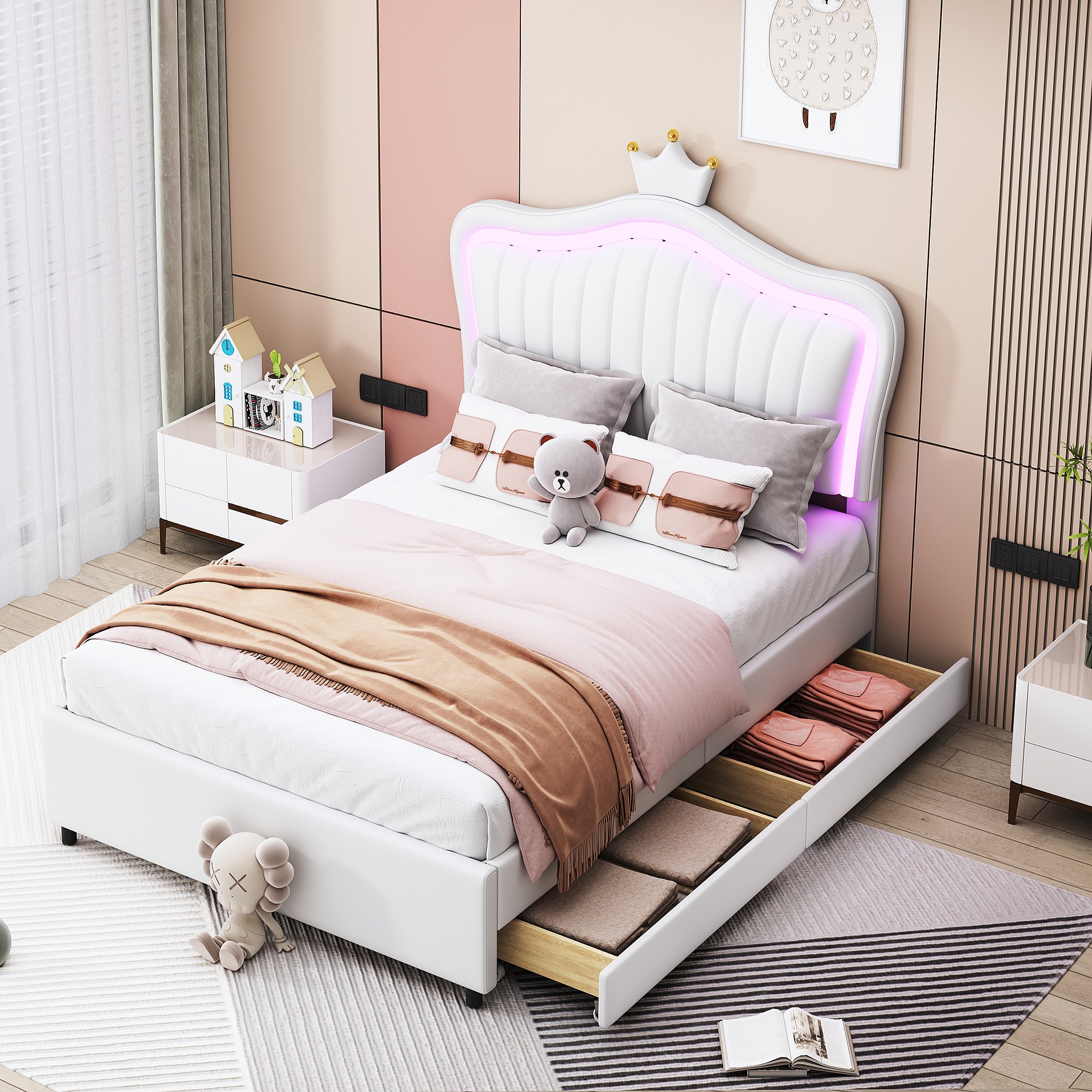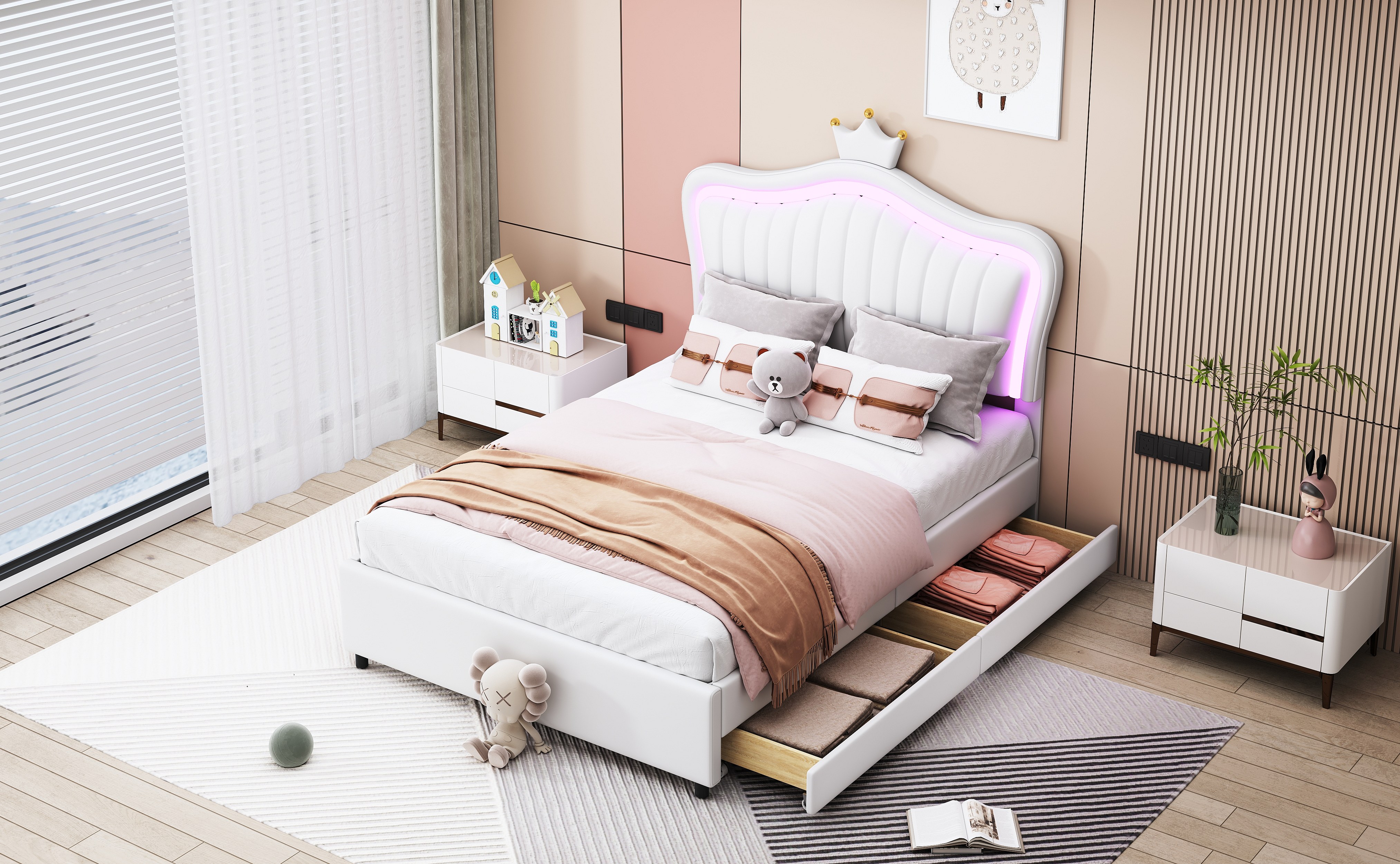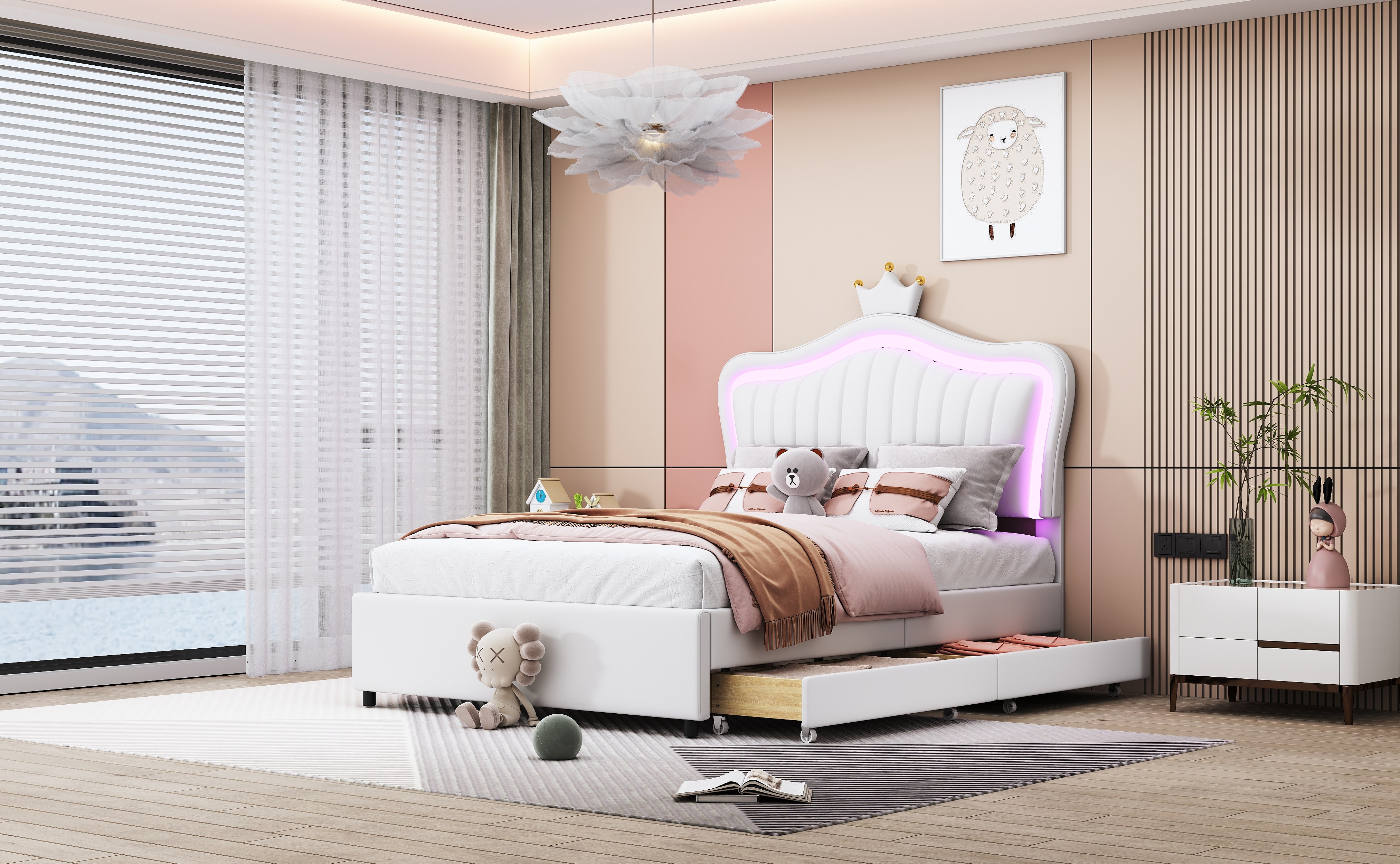 Lit enfant rembourré 90x200 cm, lit fille couronne blanche, PU cuir, tiroirs, LED et sommier inclus
