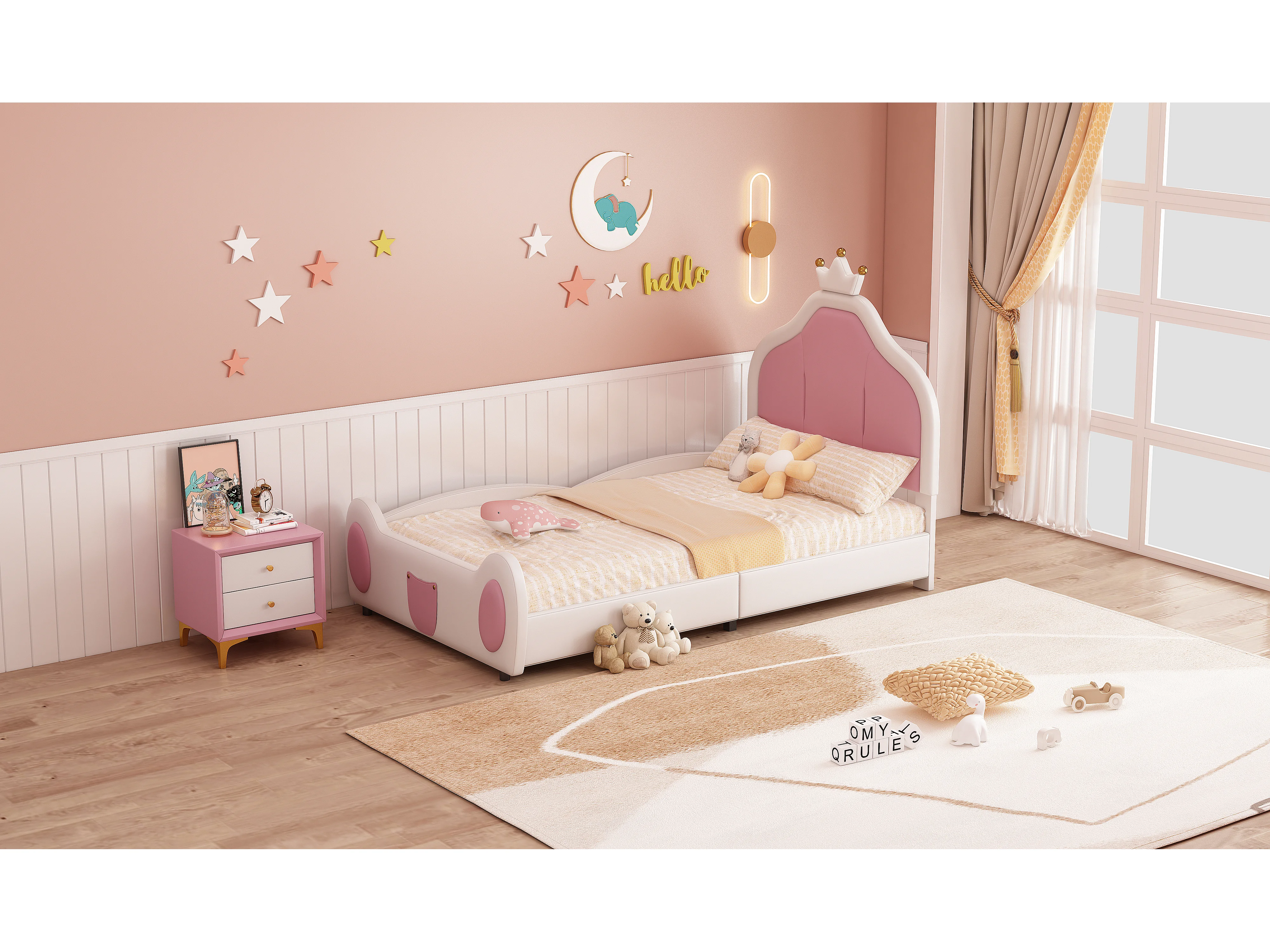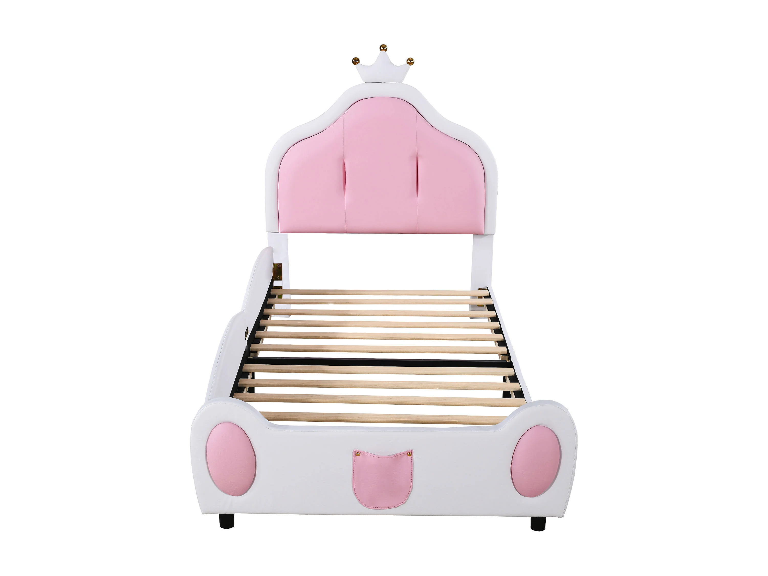 Lit enfant rembourré 90x200 cm, tête avec couronne, design enfant, PU cuir blanc, lit avec rangement