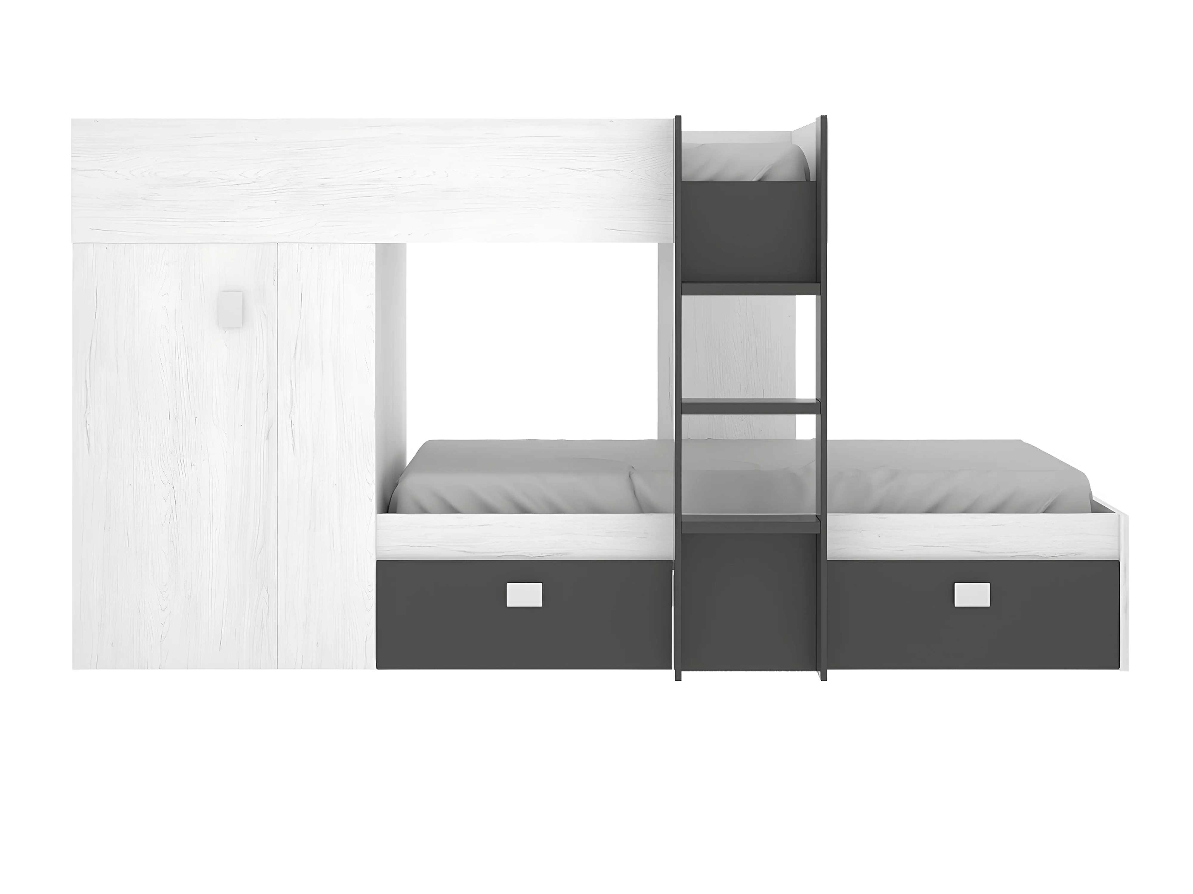 Lit enfant superposé avec armoire et 2 tiroirs coloris Blanc, graphite - Longueur 271 x Profondeur 111 x Hauteur 150 cm