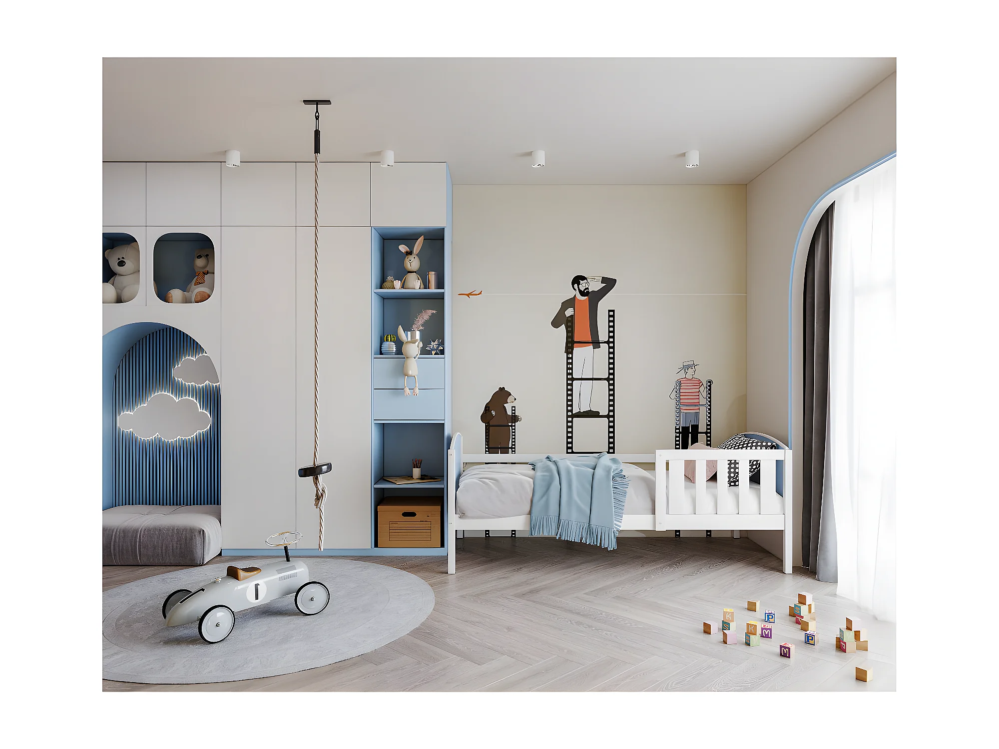 Lit Enfant Tom 90x190 Blanc - bleu Livré avec sommiers