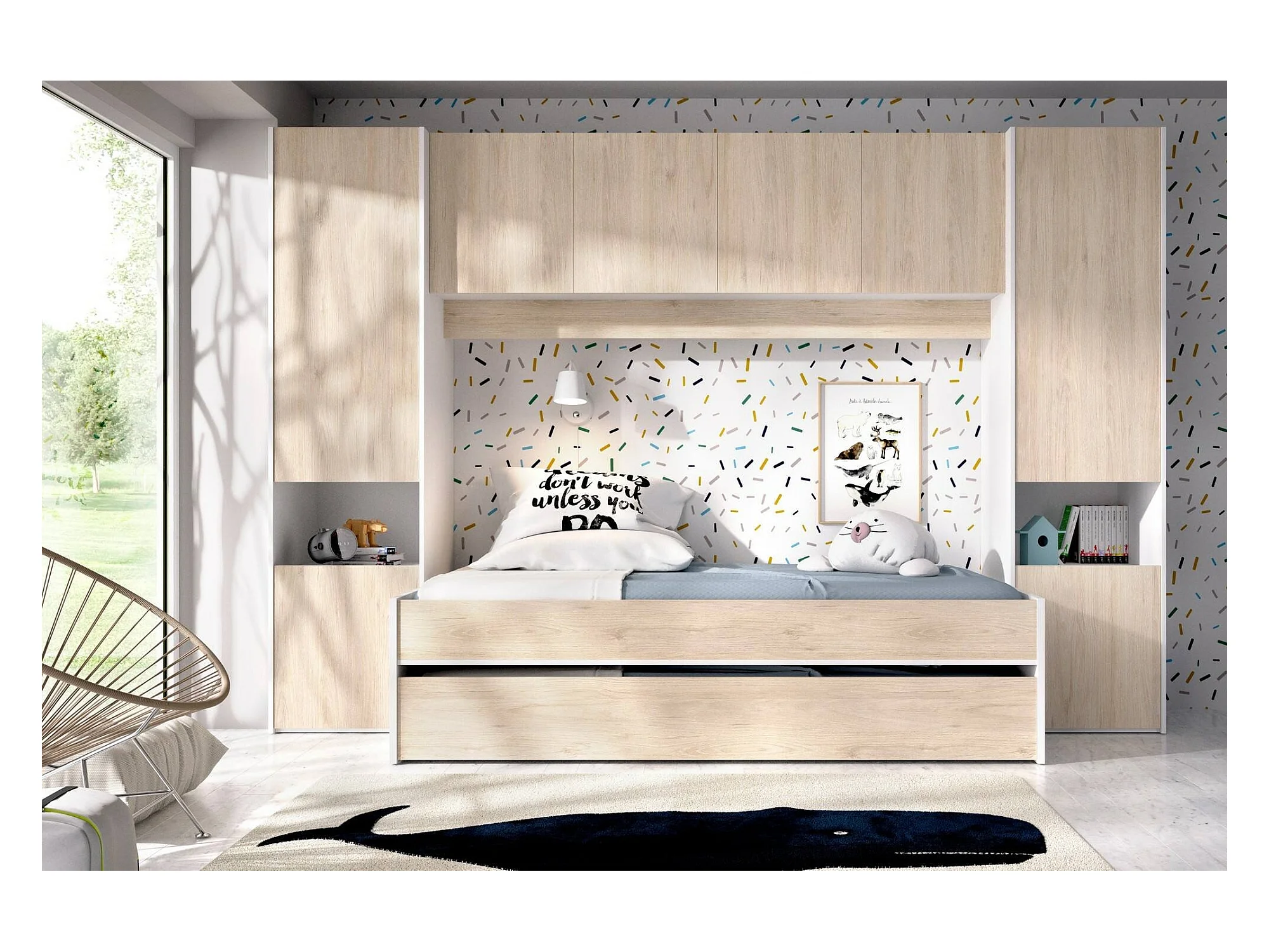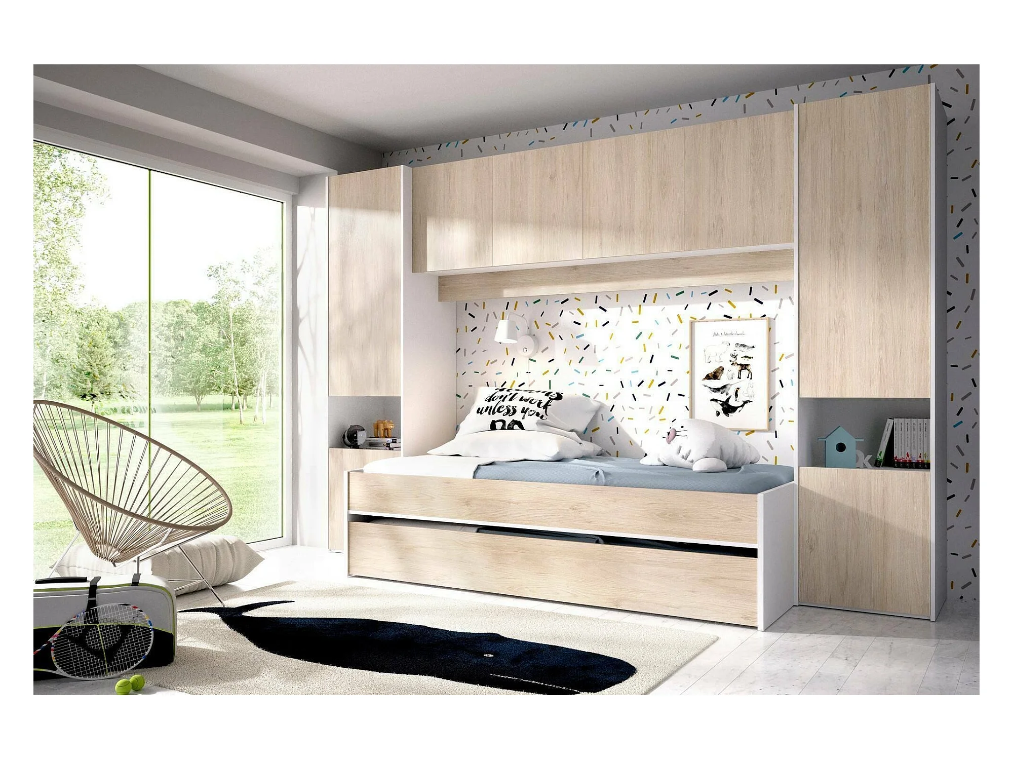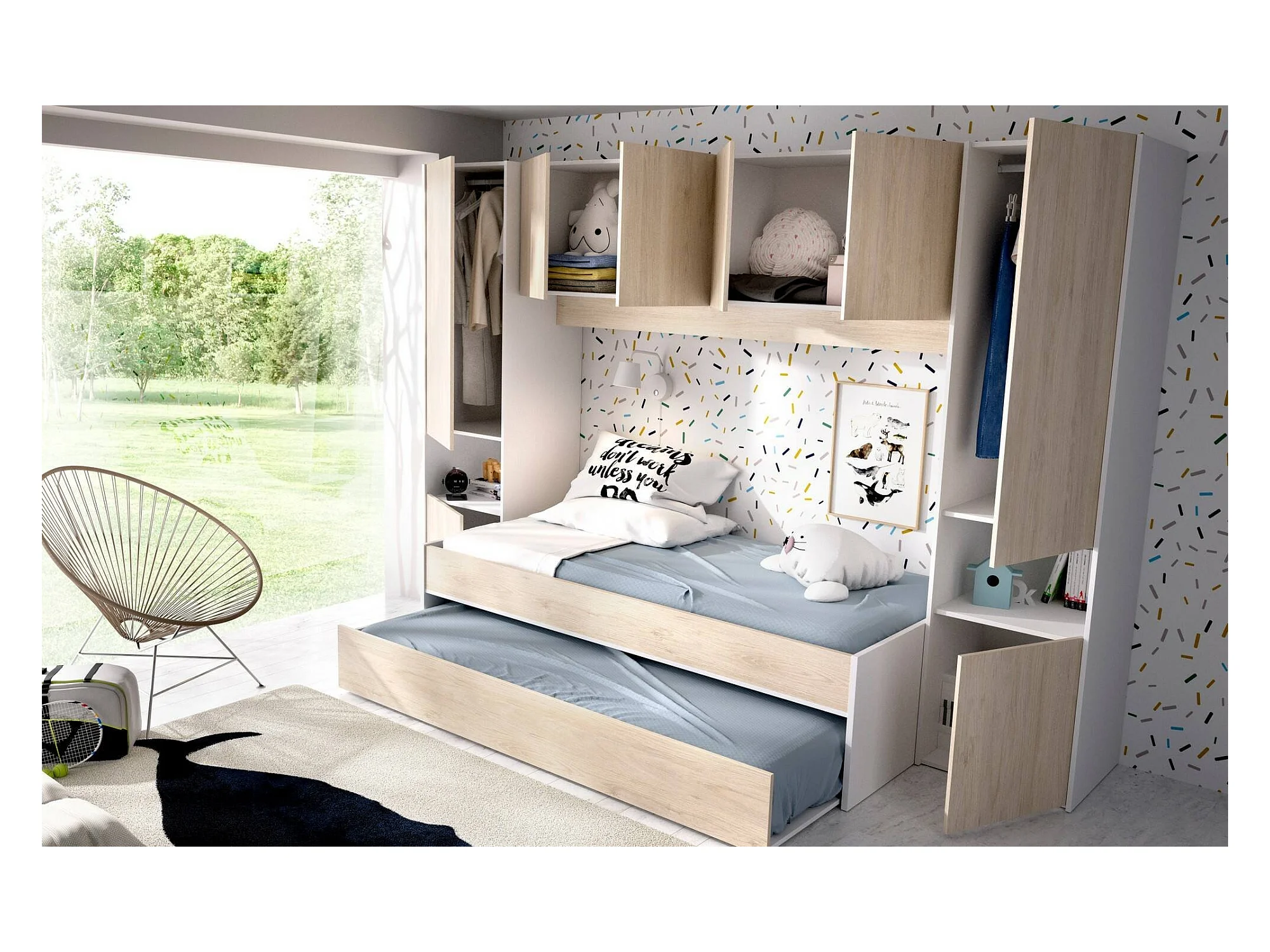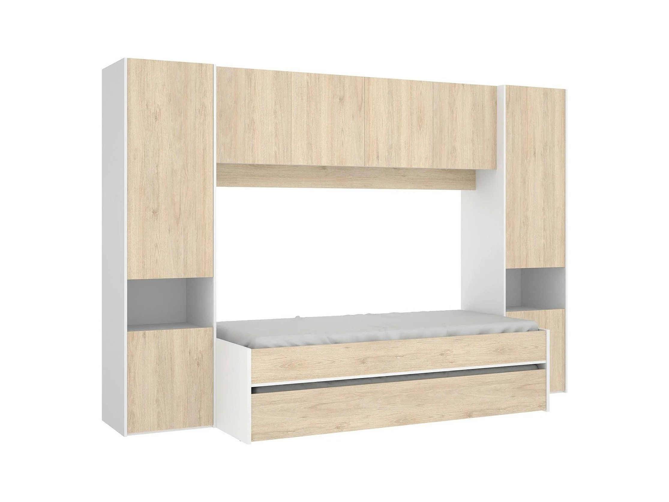 Lit enfant Venturosa, Chambre complète avec armoire bridge et commode, Composition avec lit et lit simple extractible, 303x97h203 cm, Chêne et Blanc