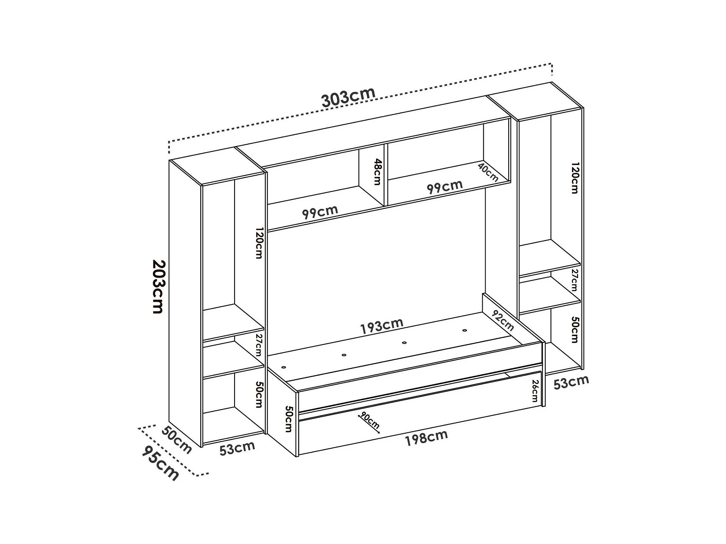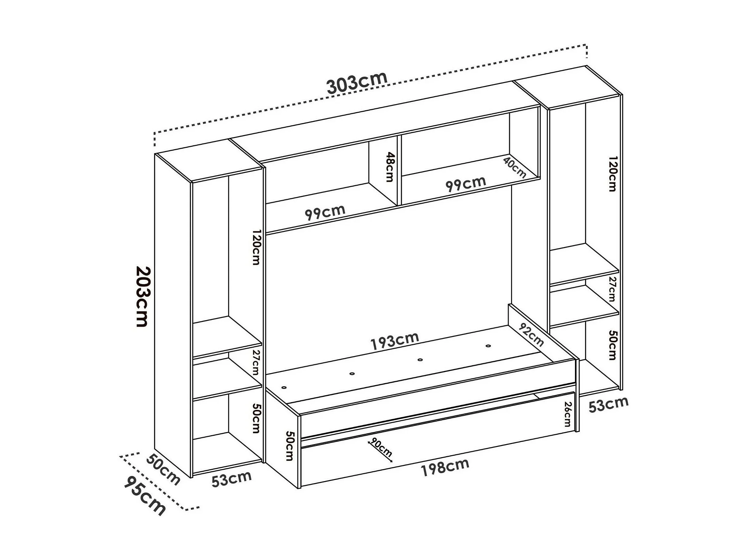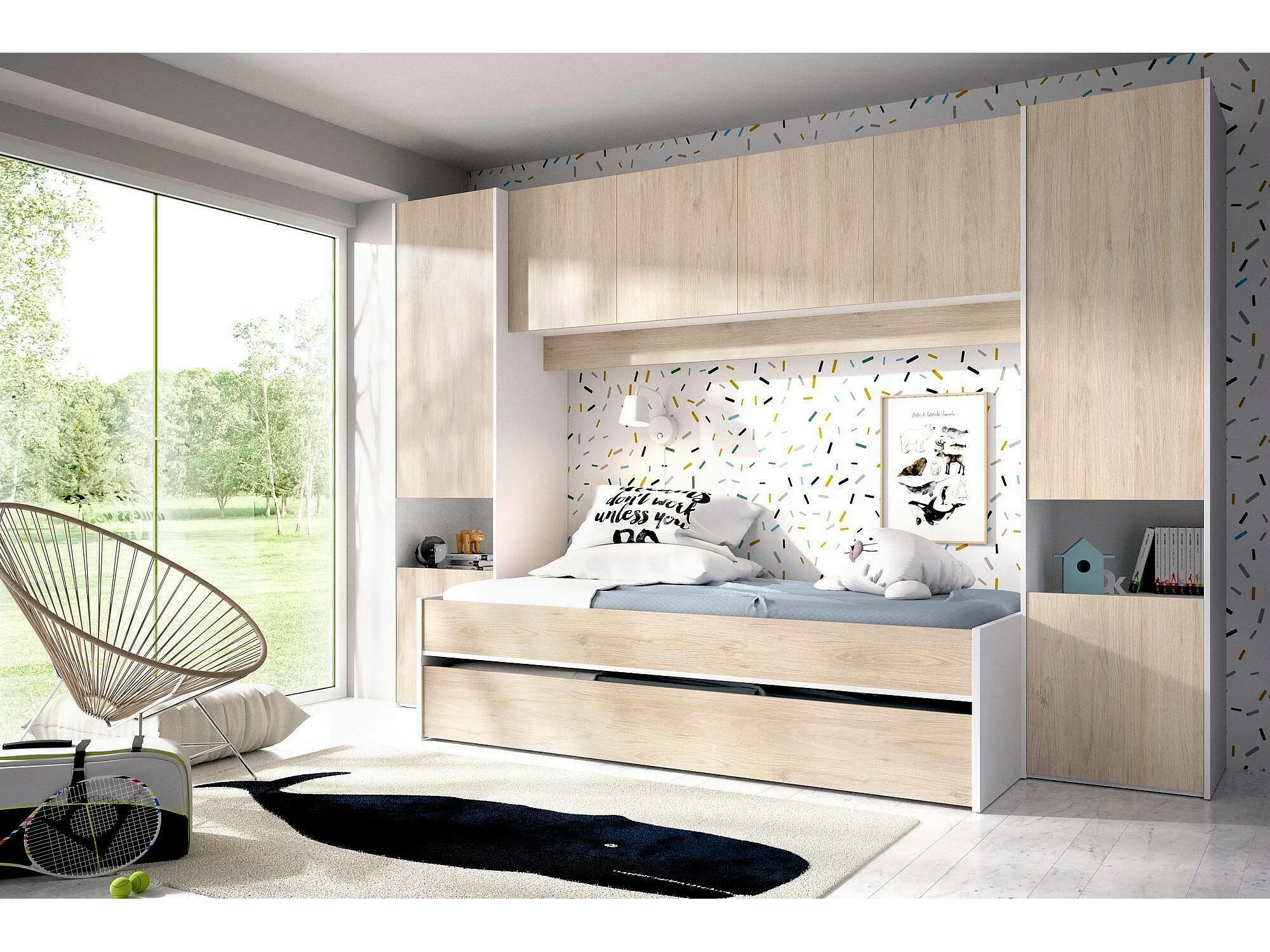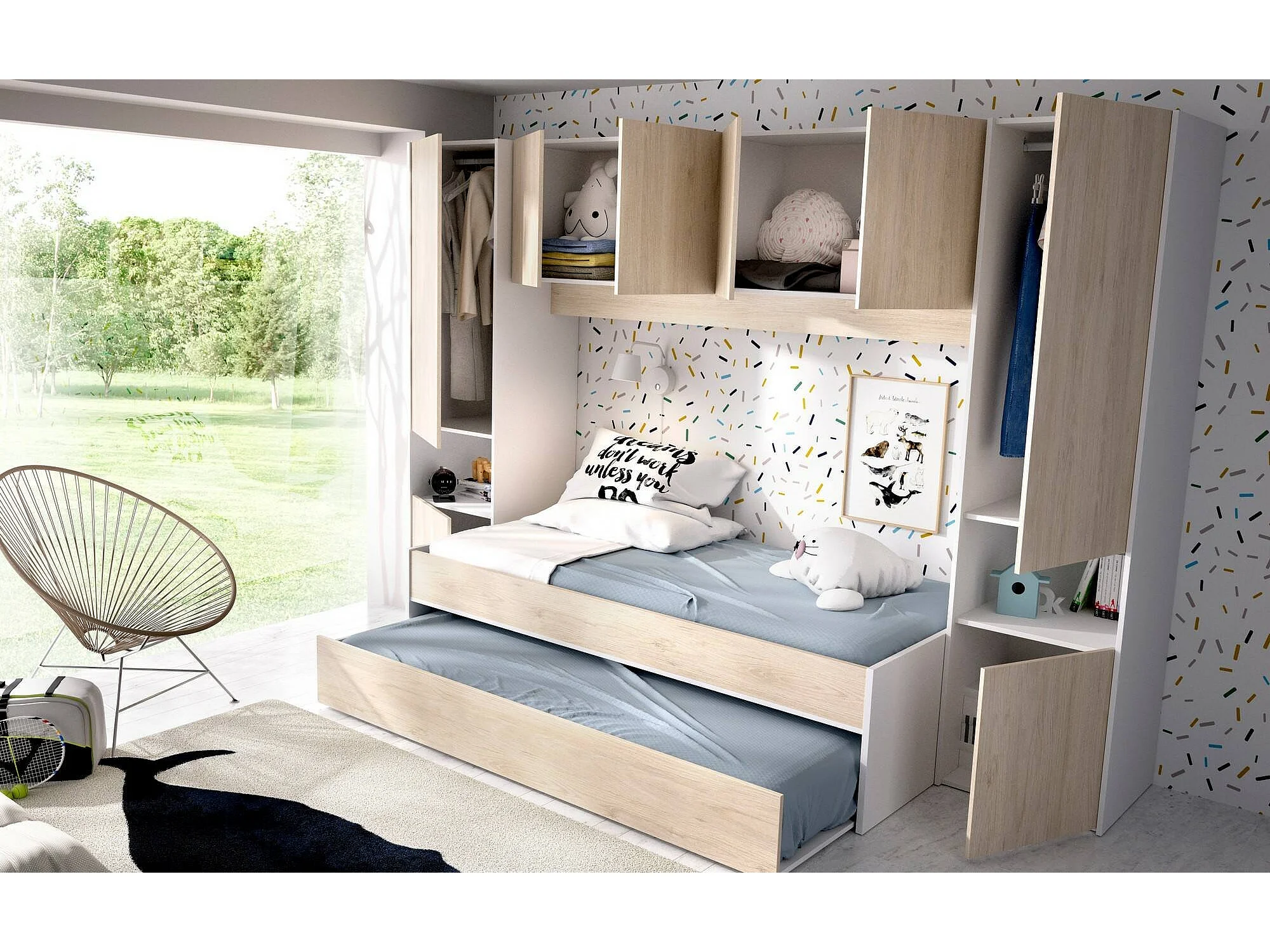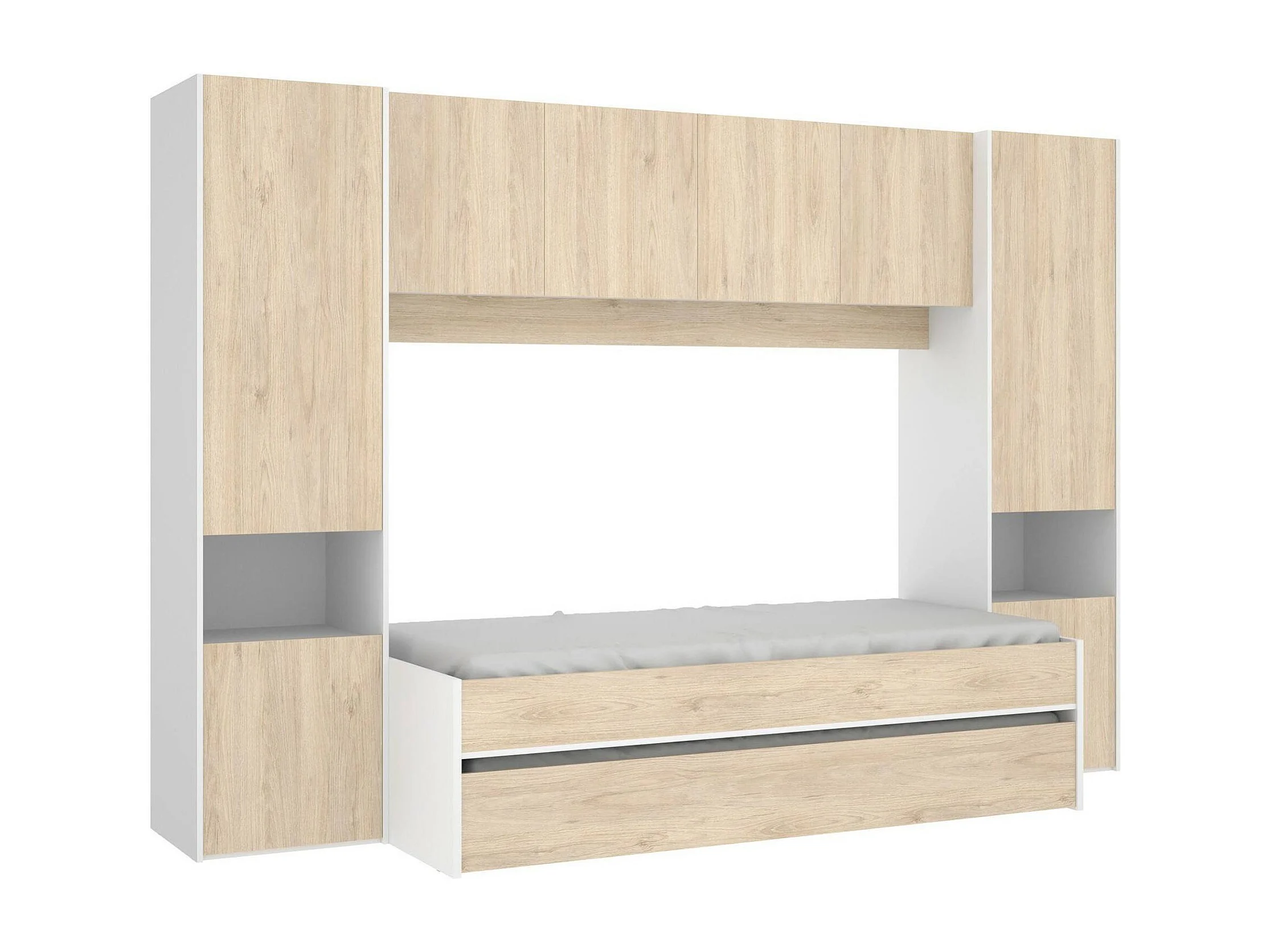 Lit enfant Venturosa, Chambre complète avec armoire bridge et commode, Composition avec lit et lit simple extractible, 303x97h203 cm, Chêne et Blanc