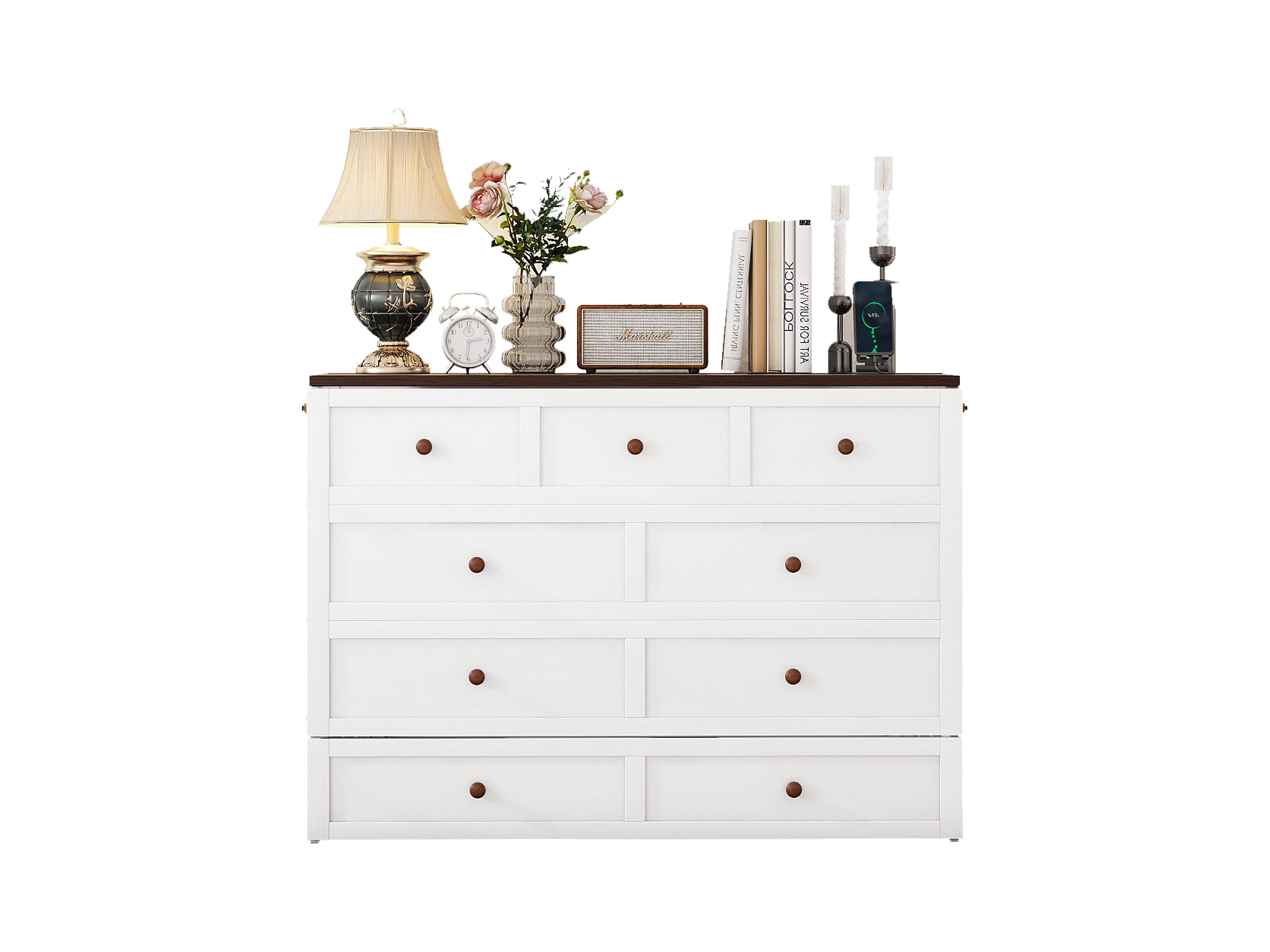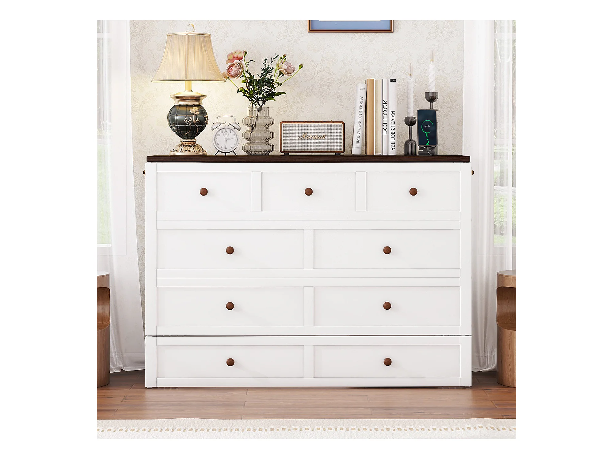 Lit escamotable 140x200 cm, avec tiroirs, rangement tête de lit, USB et prise intégrée, sans matelas, Blanc