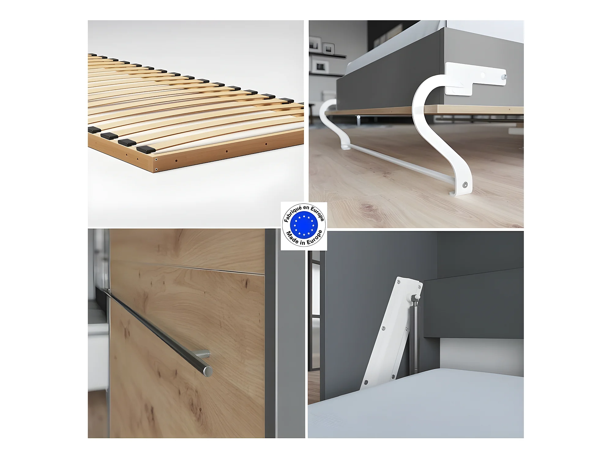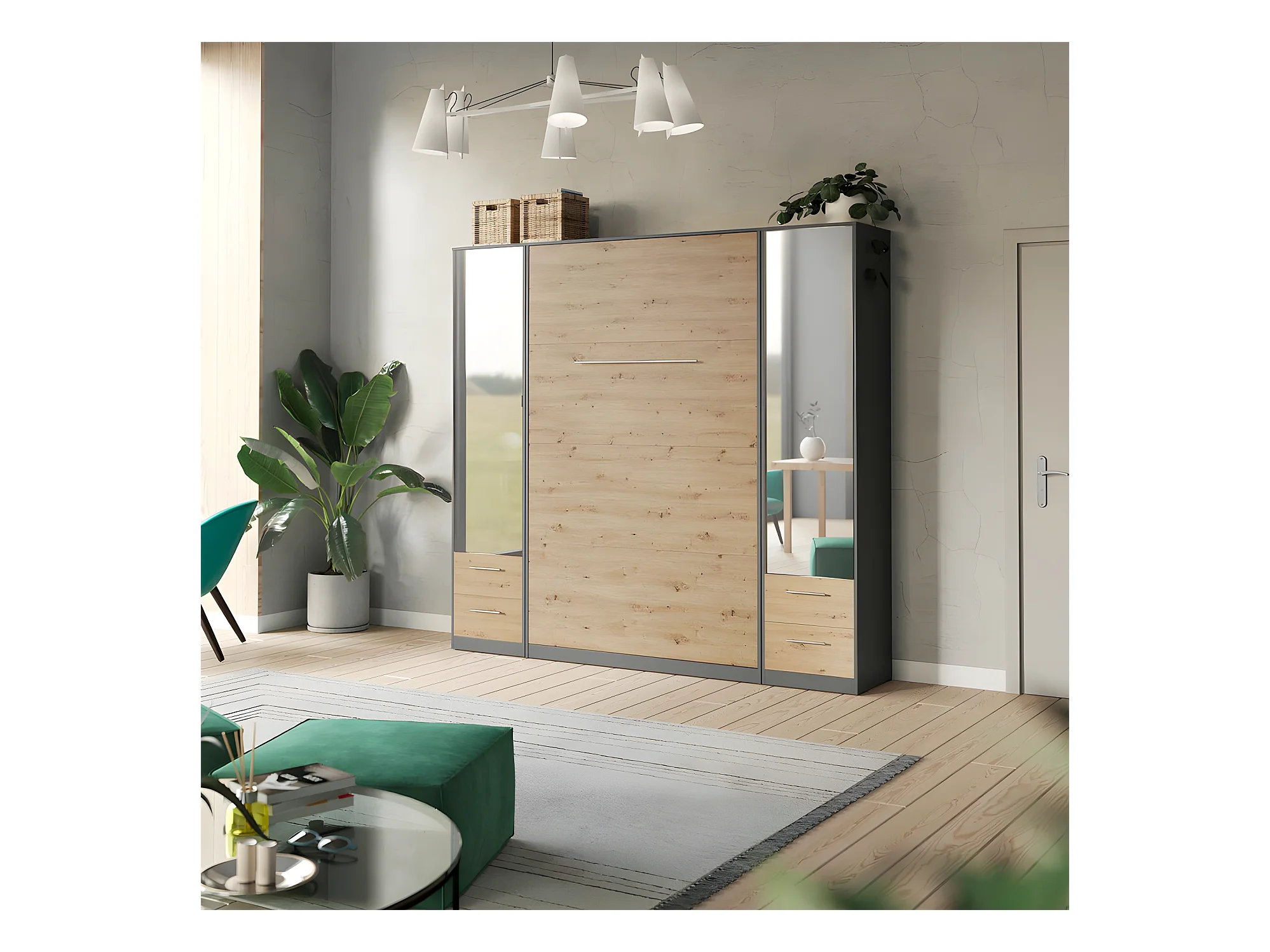 Lit escamotable +2 Placards Vertical 140x200+(50x2)cm Miroir Lit Mural Anthracite/Chêne sauvage