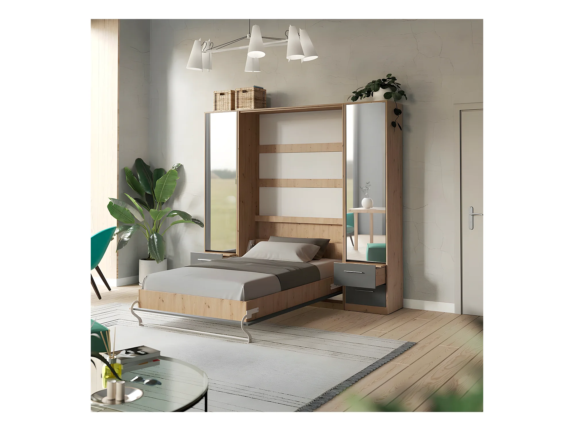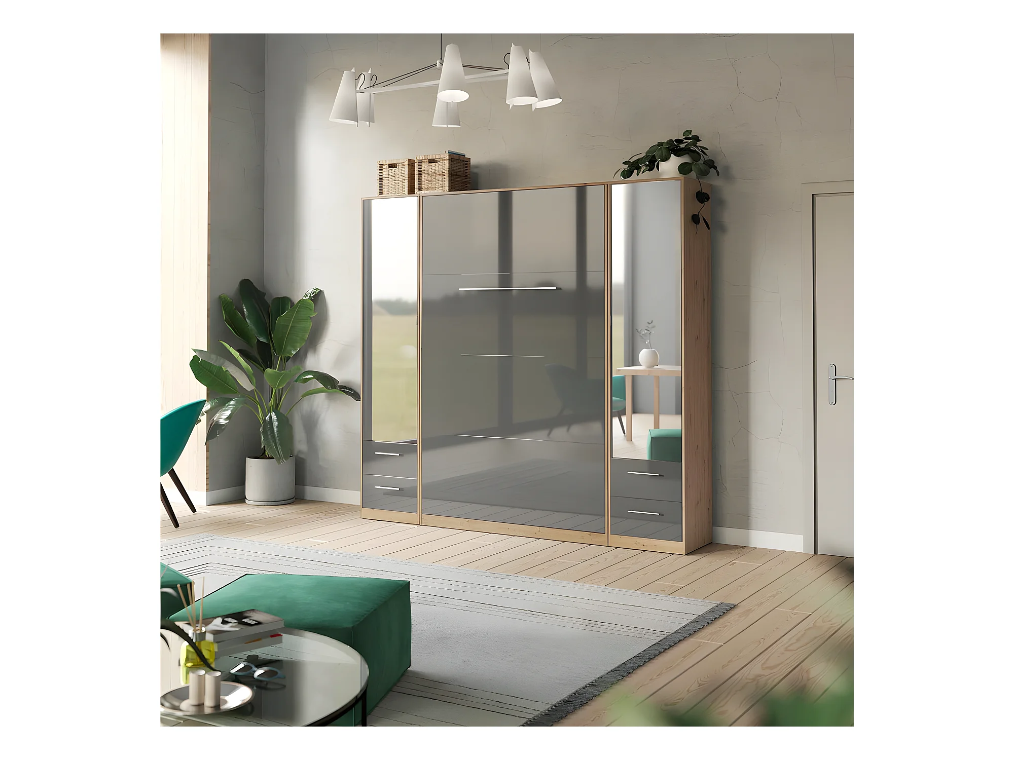 Lit escamotable +2 Placards Vertical 140x200+(50x2)cm Miroir Lit Mural Blanc/Anthracite Brillant