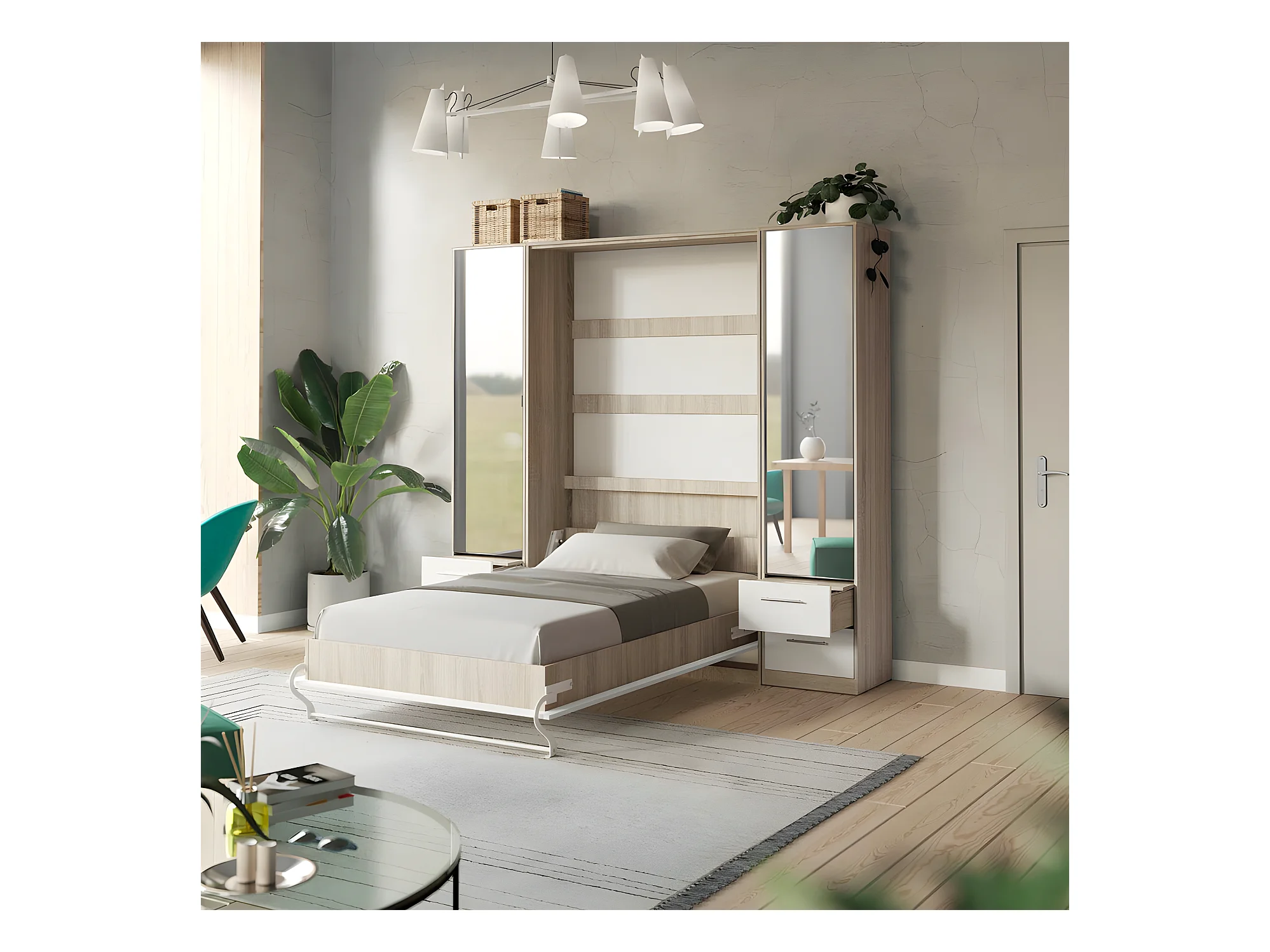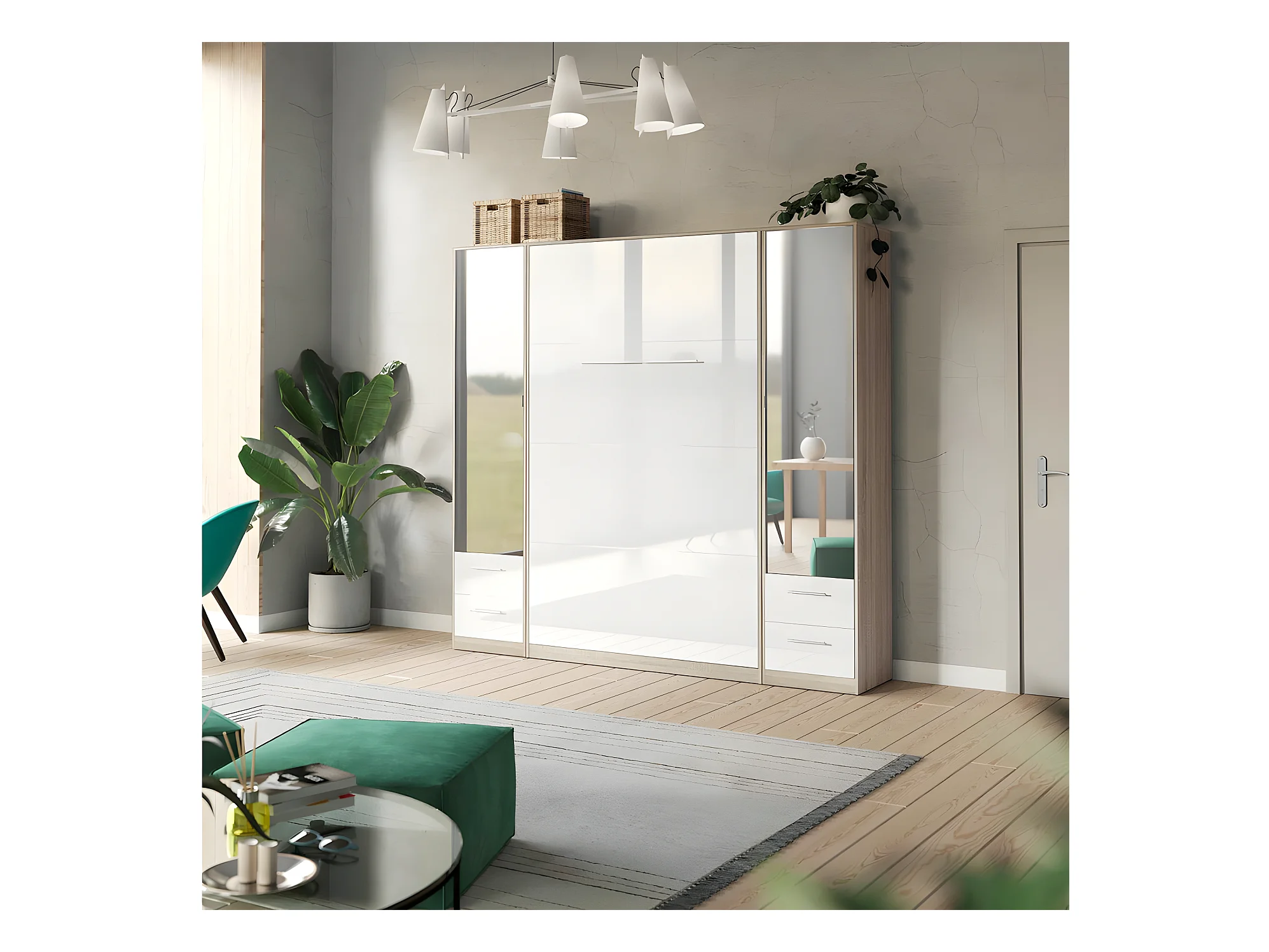 Lit escamotable +2 Placards Vertical 140x200+(50x2)cm Miroir Lit Supérieur Sonoma/Blanc brillant