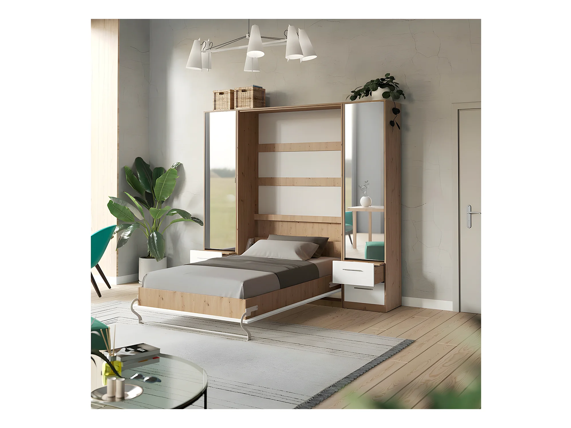 Lit escamotable +2 Placards Vertical 90x200+(50x2)cm Miroir Lit Mural Chêne Sauvage/blanc