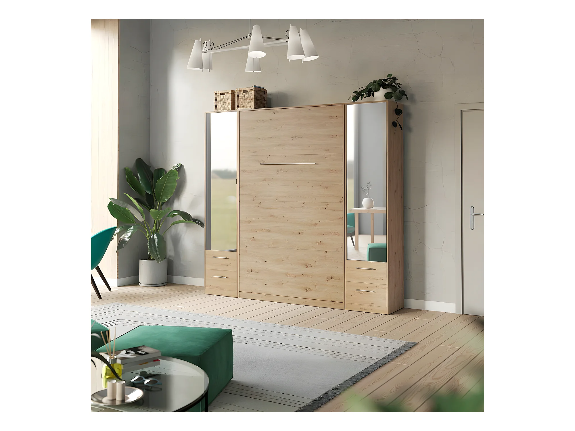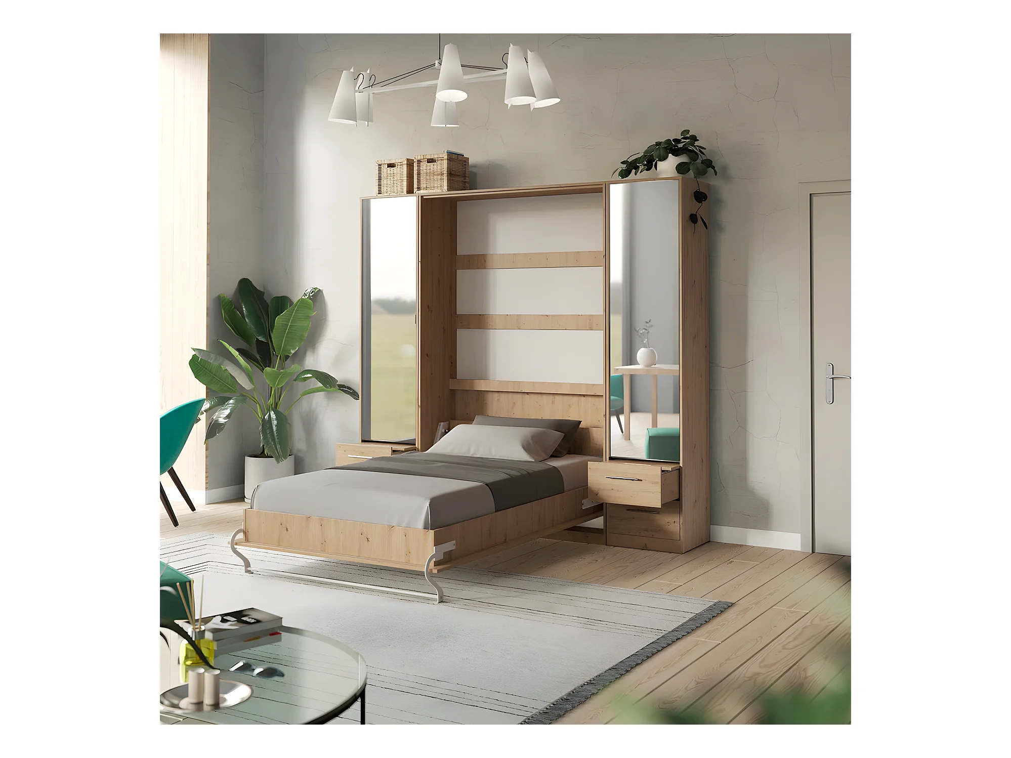 Lit escamotable +2 Placards Vertical 90x200+(50x2)cm Miroir Lit Mural Chêne Sauvage/Chêne Sauvage
