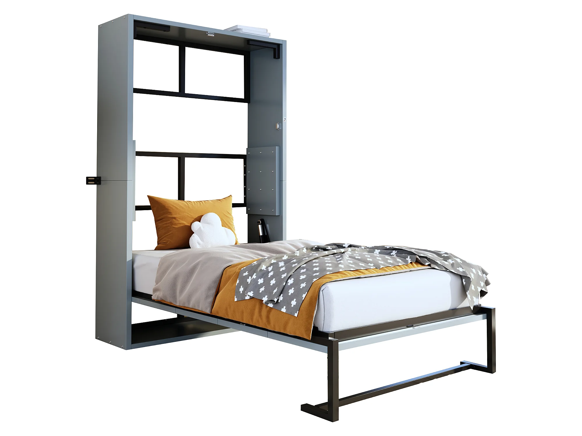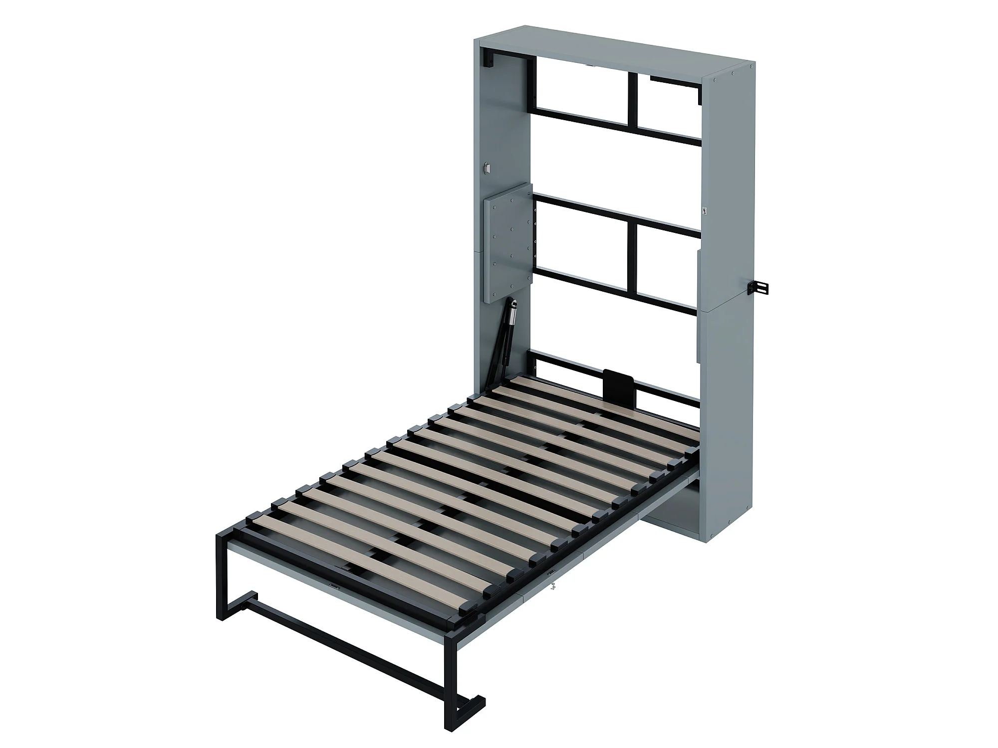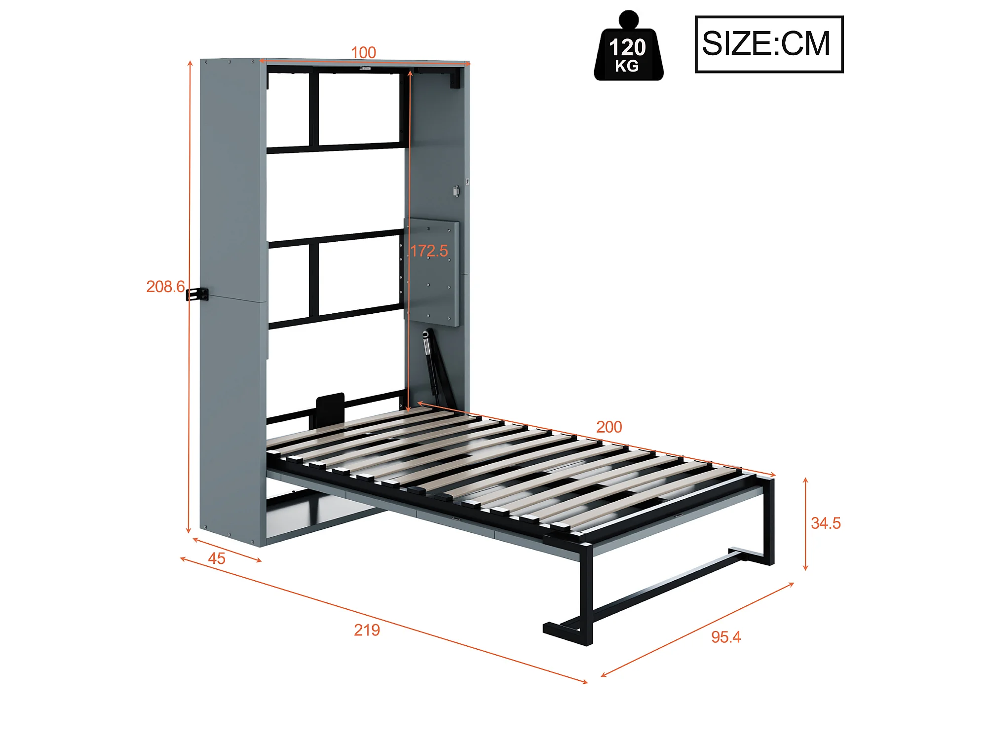 Lit escamotable 90x200cm - Cadre en métal + panneau en bois - Avec fixation murale verrouillable - Gris (Matelas non inclus)