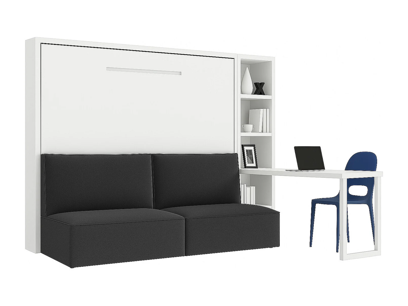Lit escamotable horizontal LOGIA-140x190-Canapé Gris foncé-Structure Blanche-Version lit+canapé+étagère+bureau