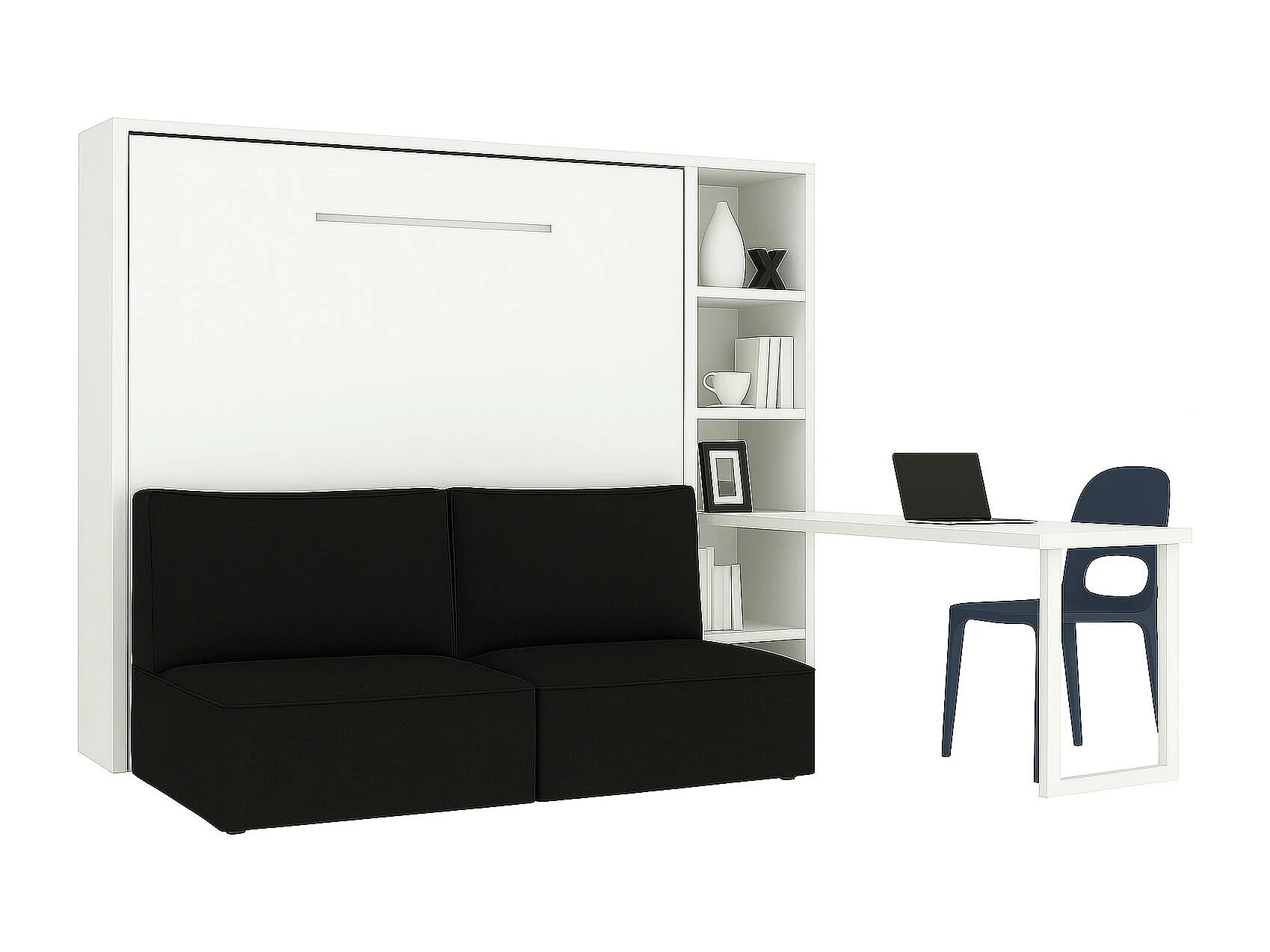 Lit escamotable horizontal LOGIA-140x190-Canapé Noir-Structure Blanche-Version lit+canapé+étagère+bureau