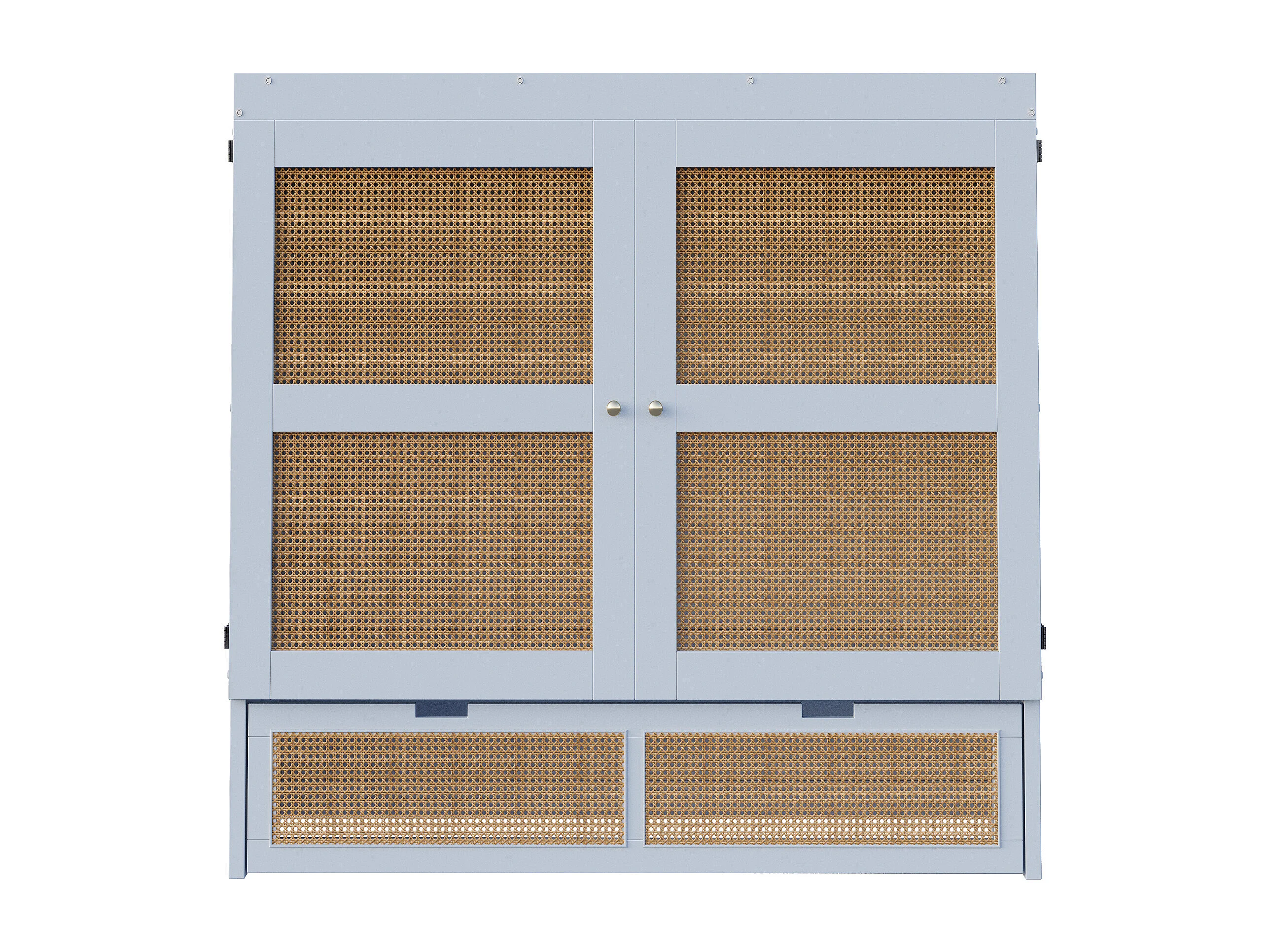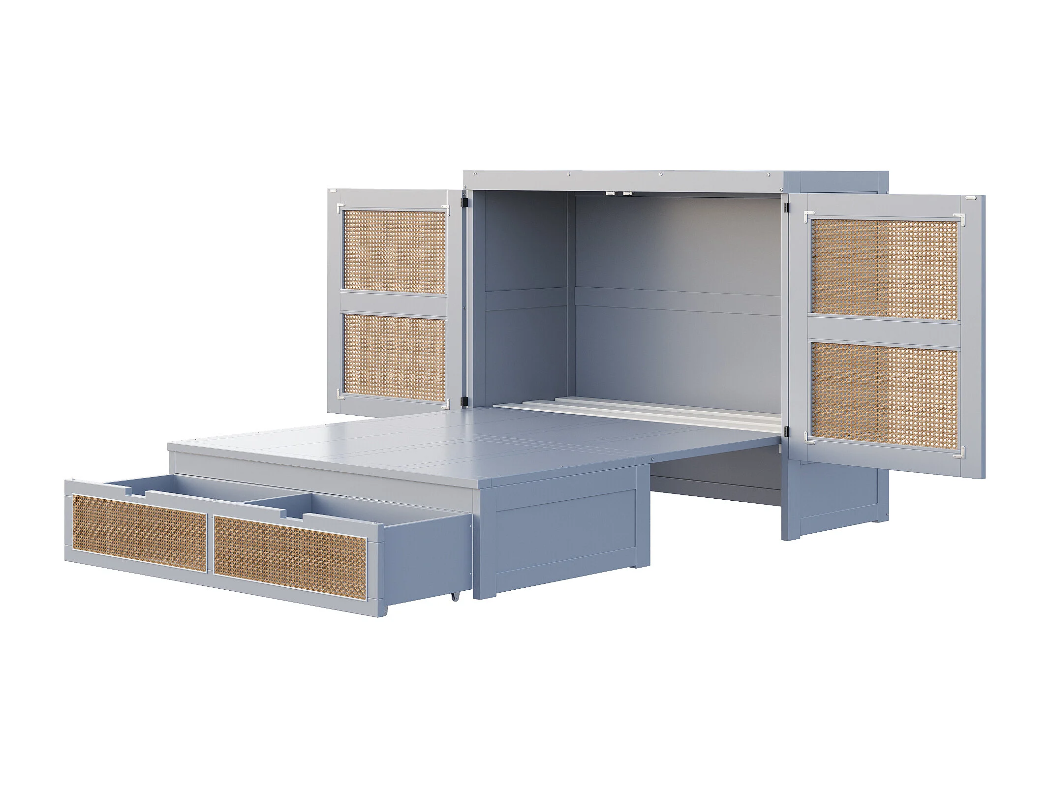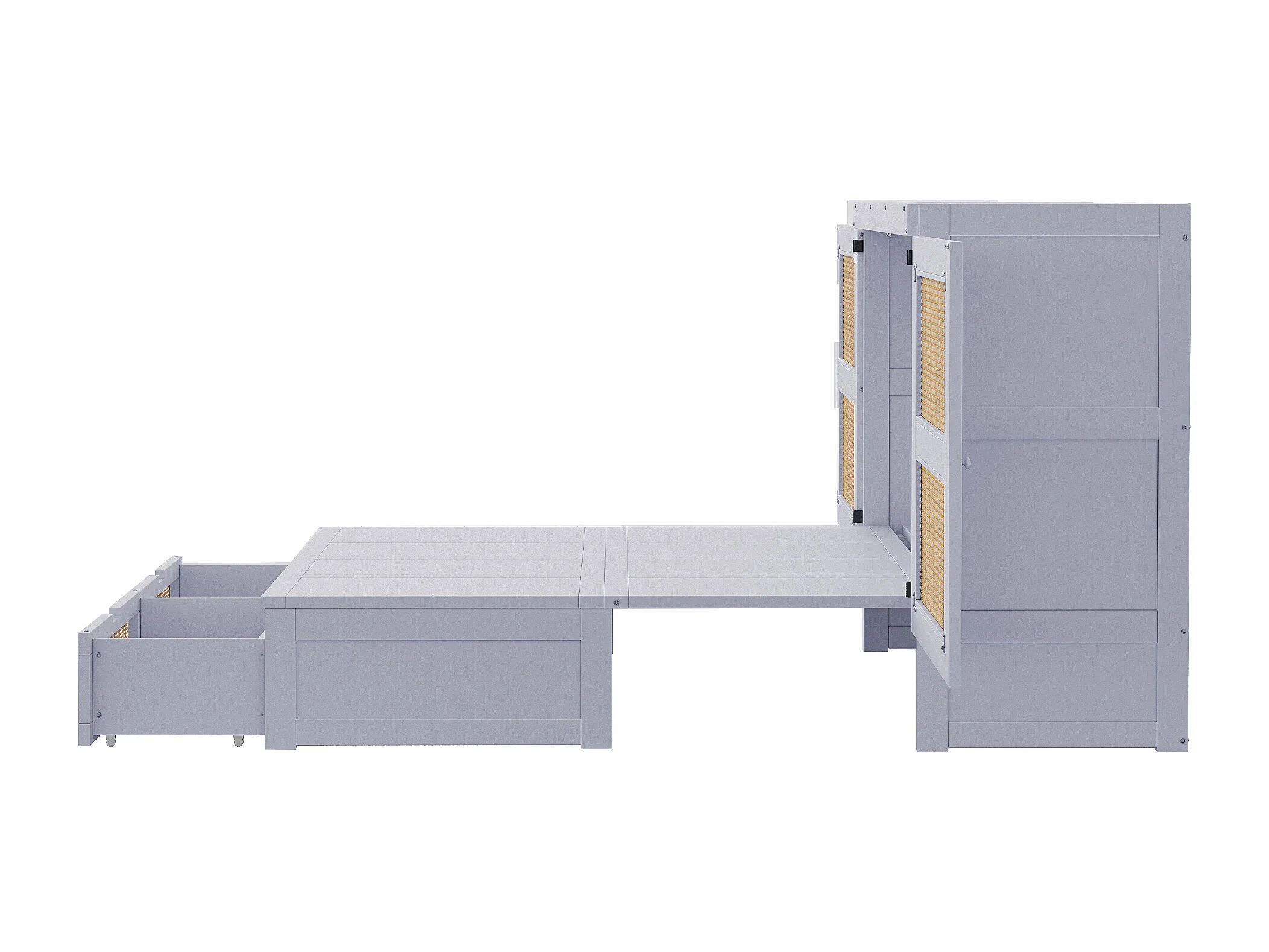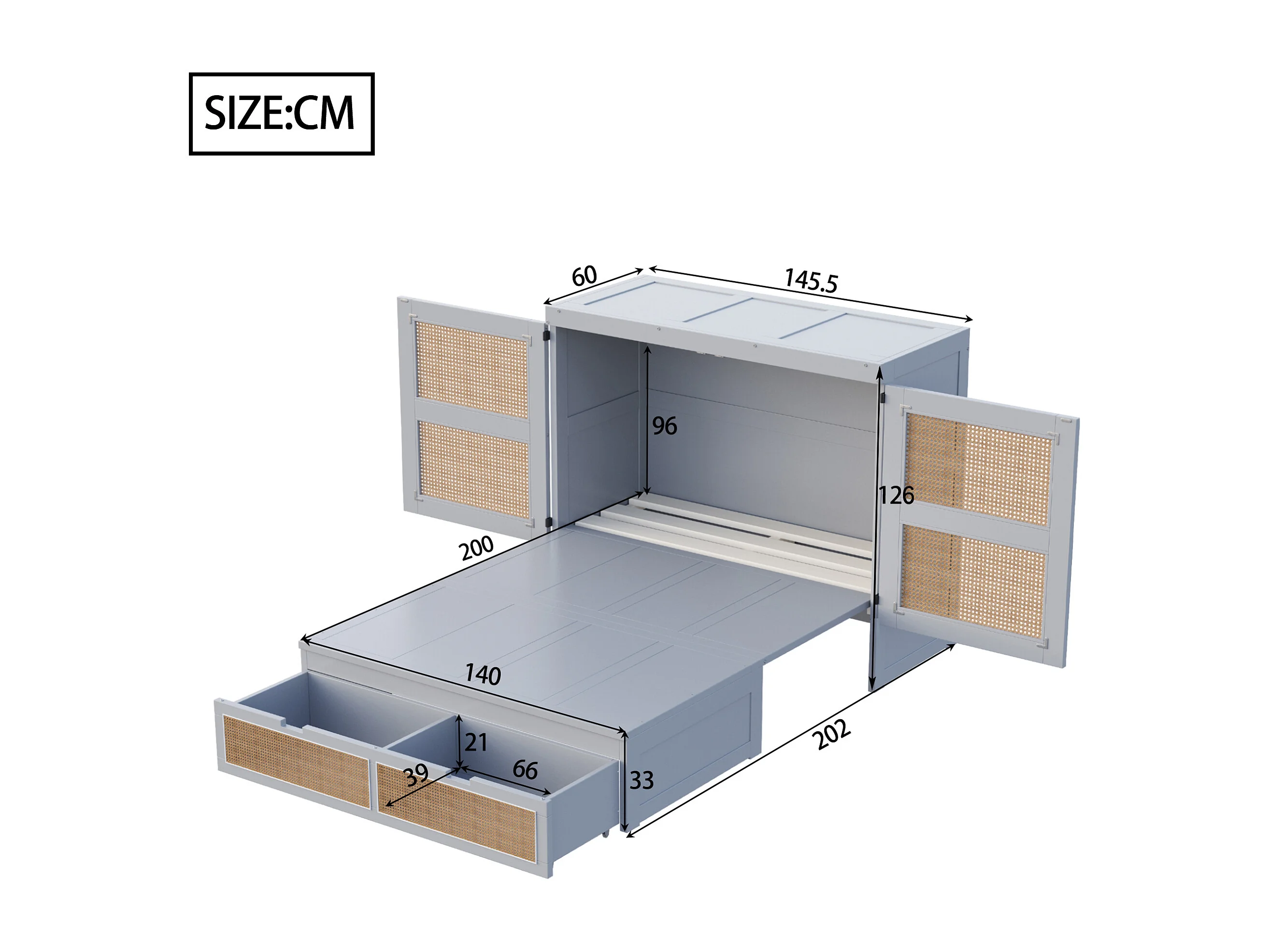 Lit escamotable - Lit 140x200 cm avec tiroirs de rangement et design rotin - bois gris - sans matelas