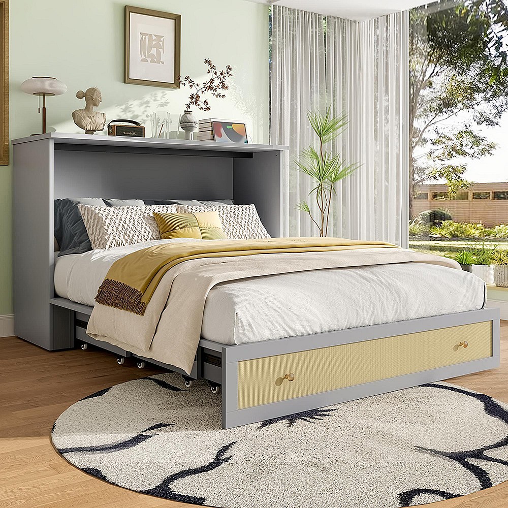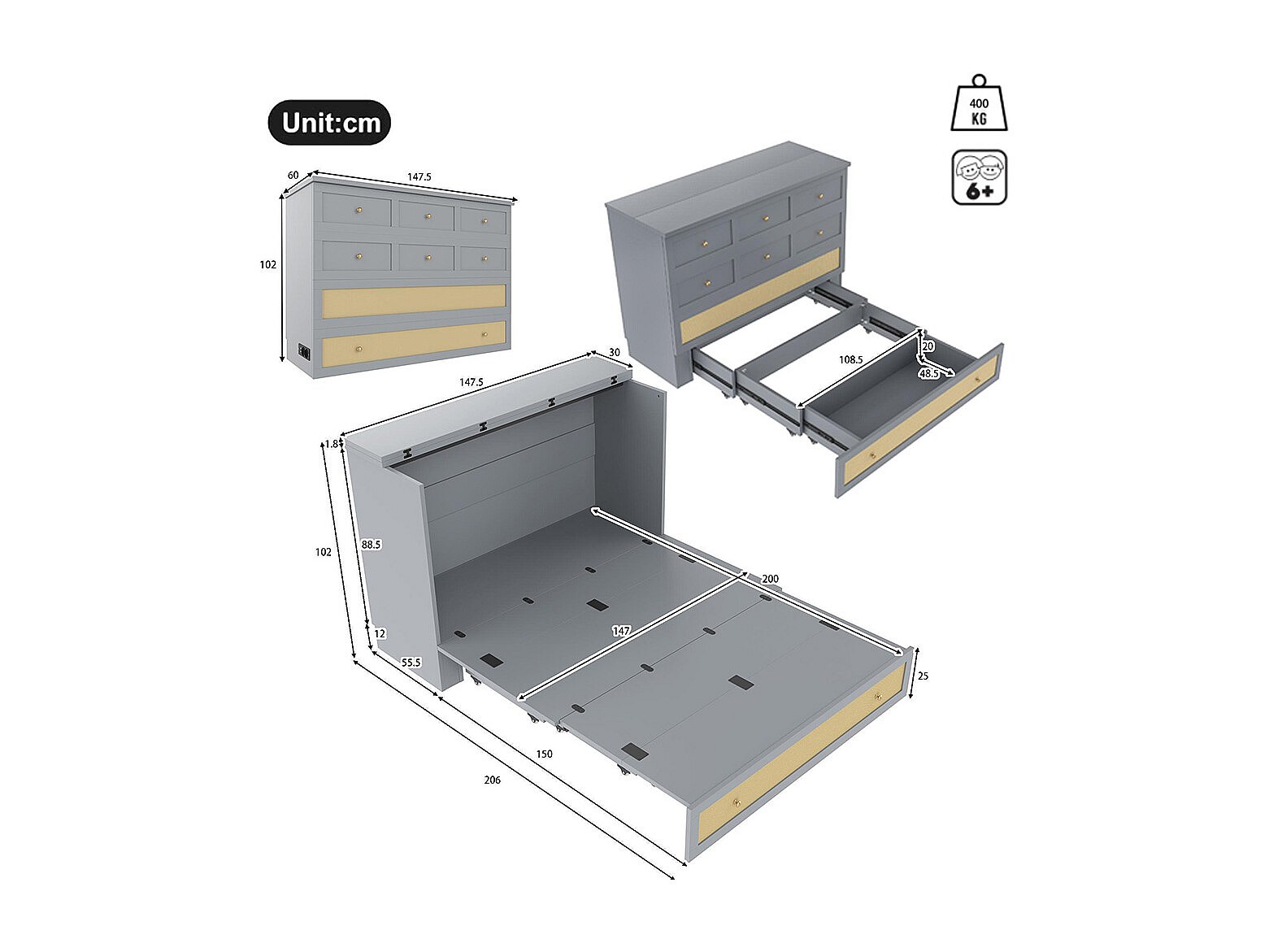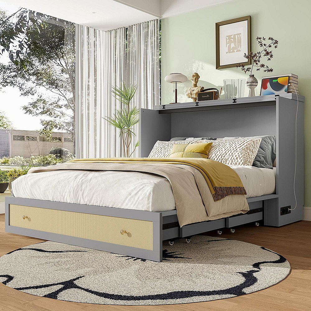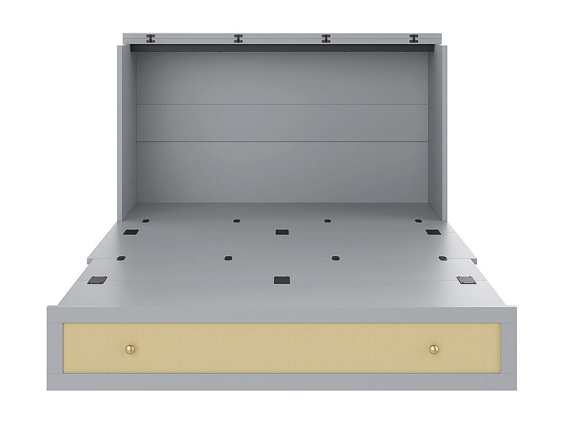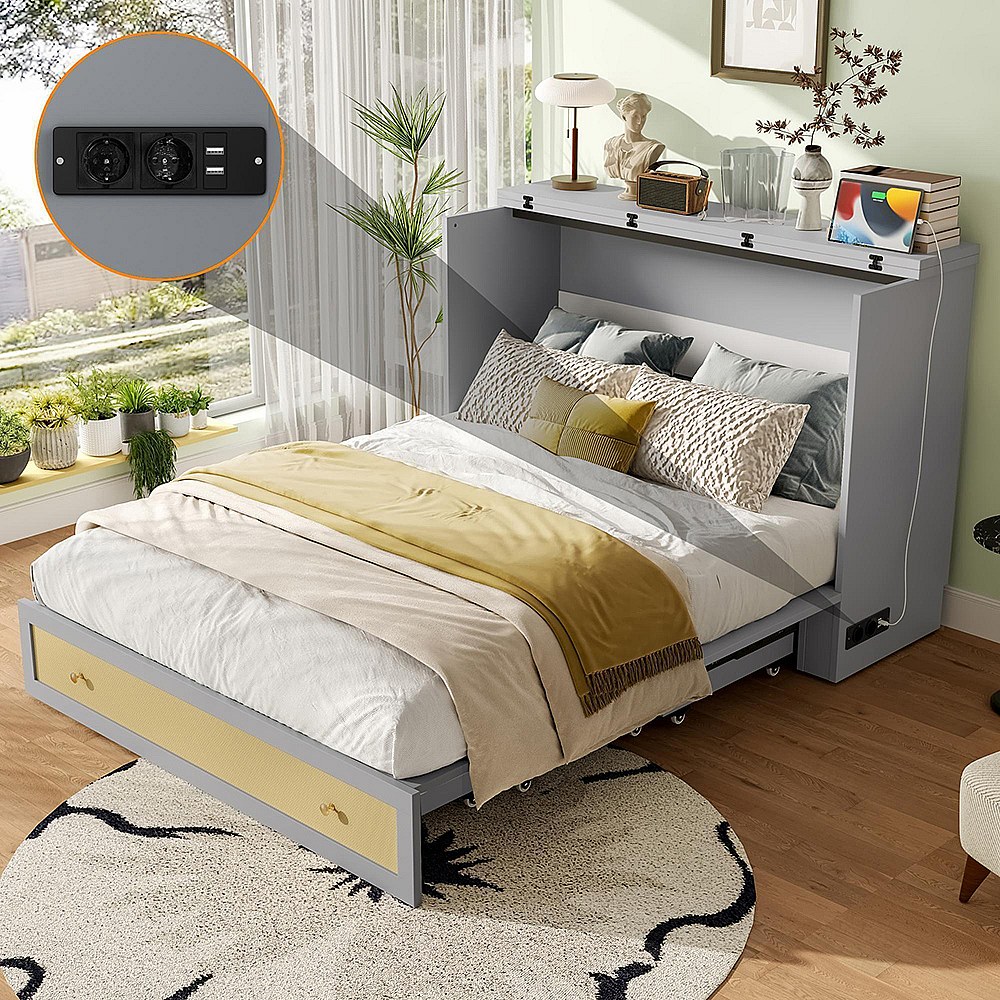 Lit escamotable mobile 140x200 cm tiroirs pied étagère tête USB électrique sans matelas gris