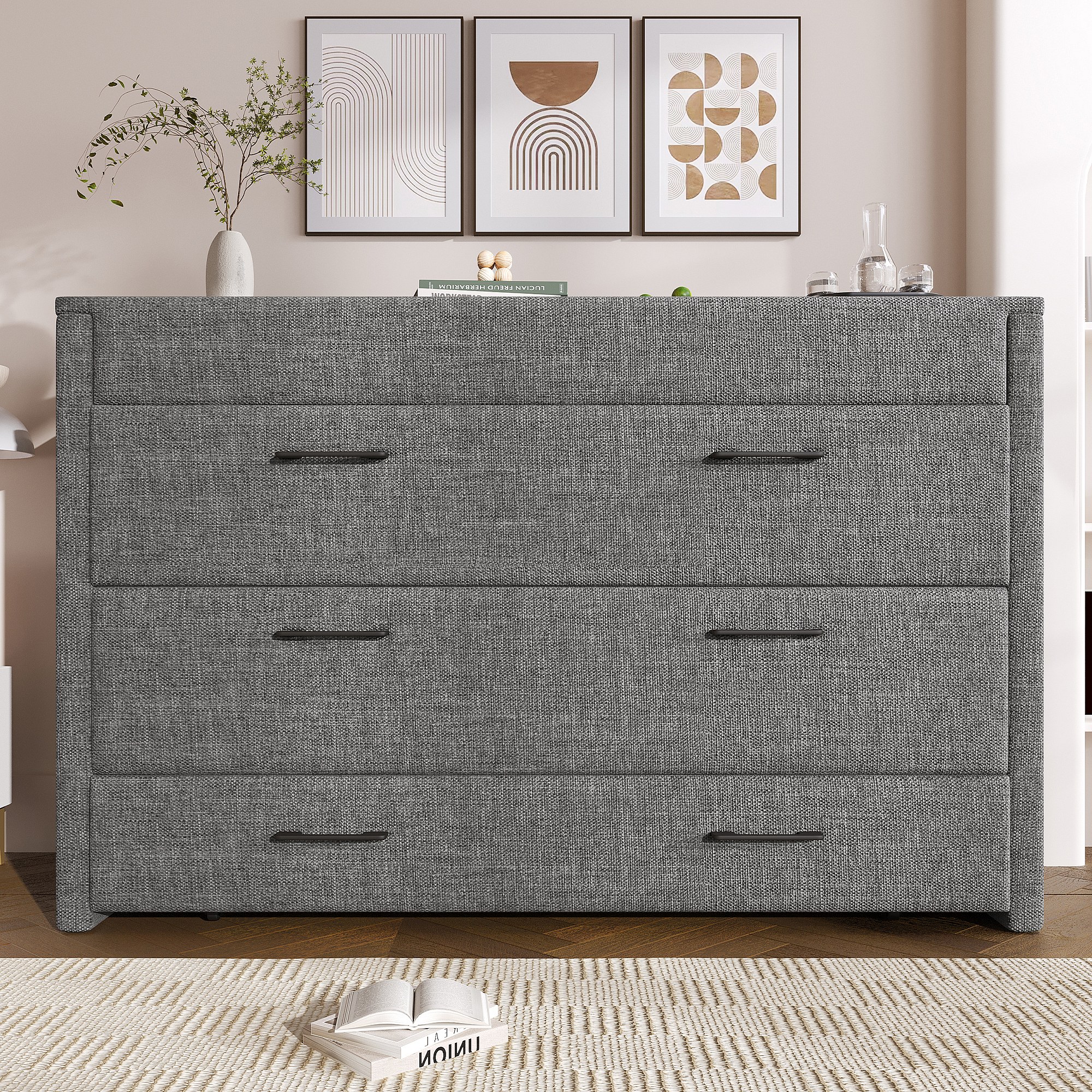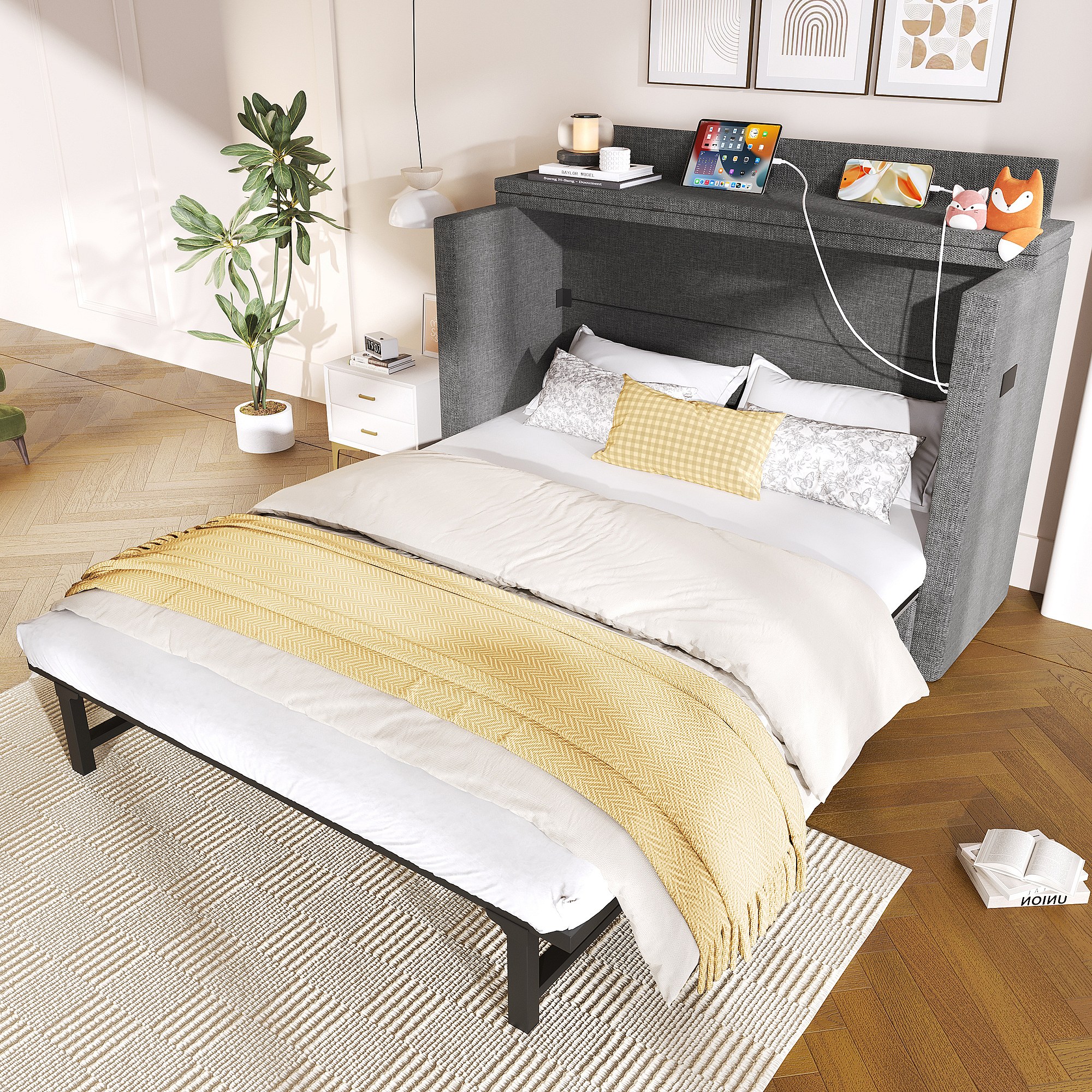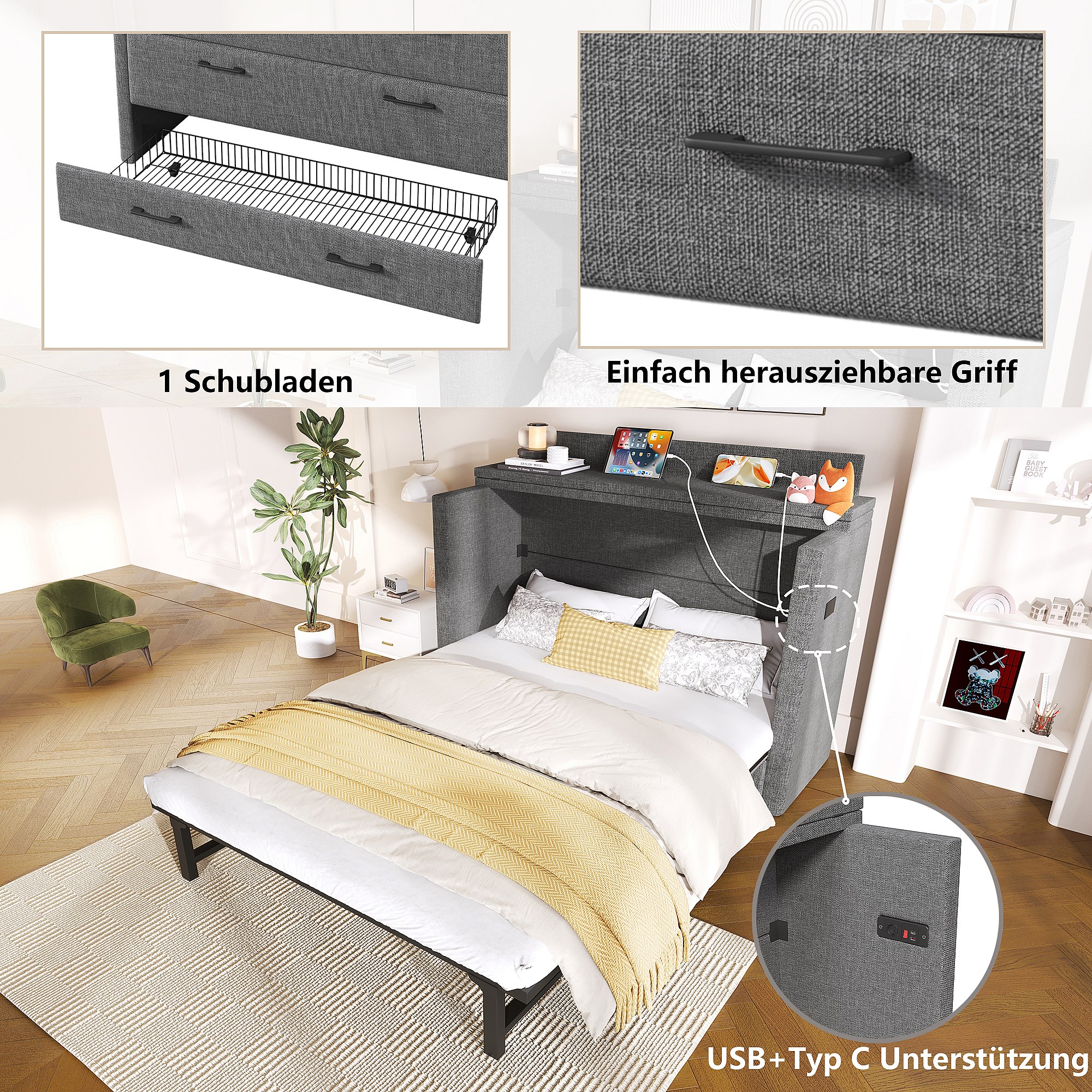 Lit escamotable mobile avec rangement - 140 x 200 cm - avec 1 tiroir + avec USB - plateforme convertible - lin - gris