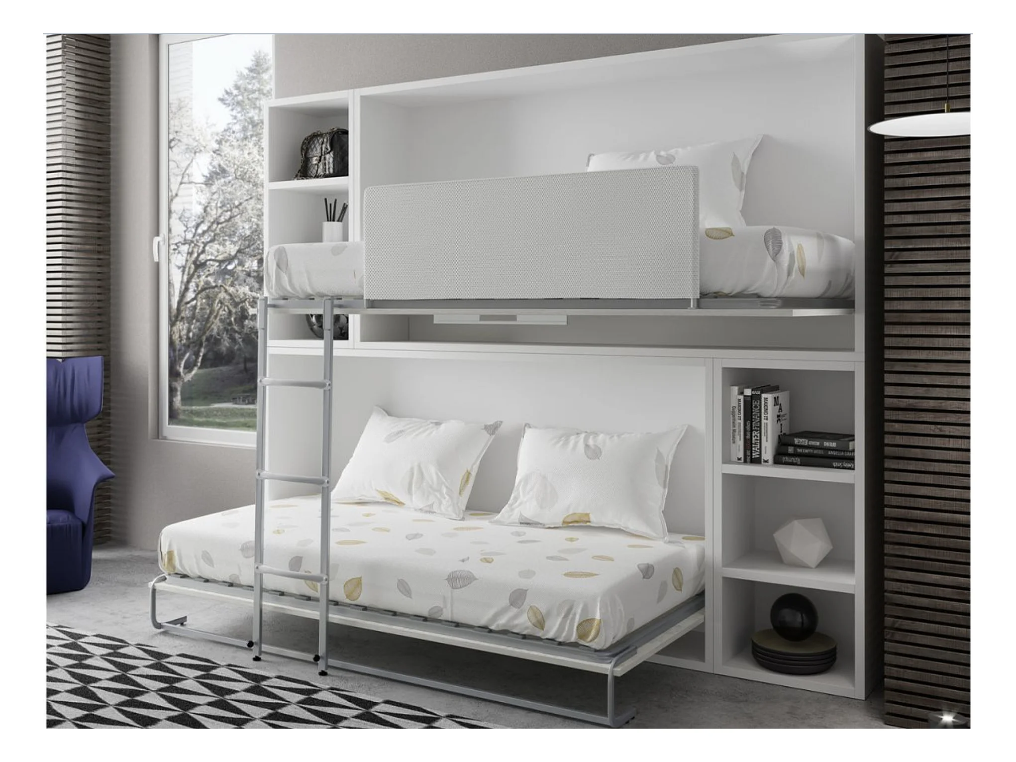 Lit escamotable superposé horizontal avec étagères BINKA-2 matelas-90x190-Cadre Gris ciment-Façade Gris ciment