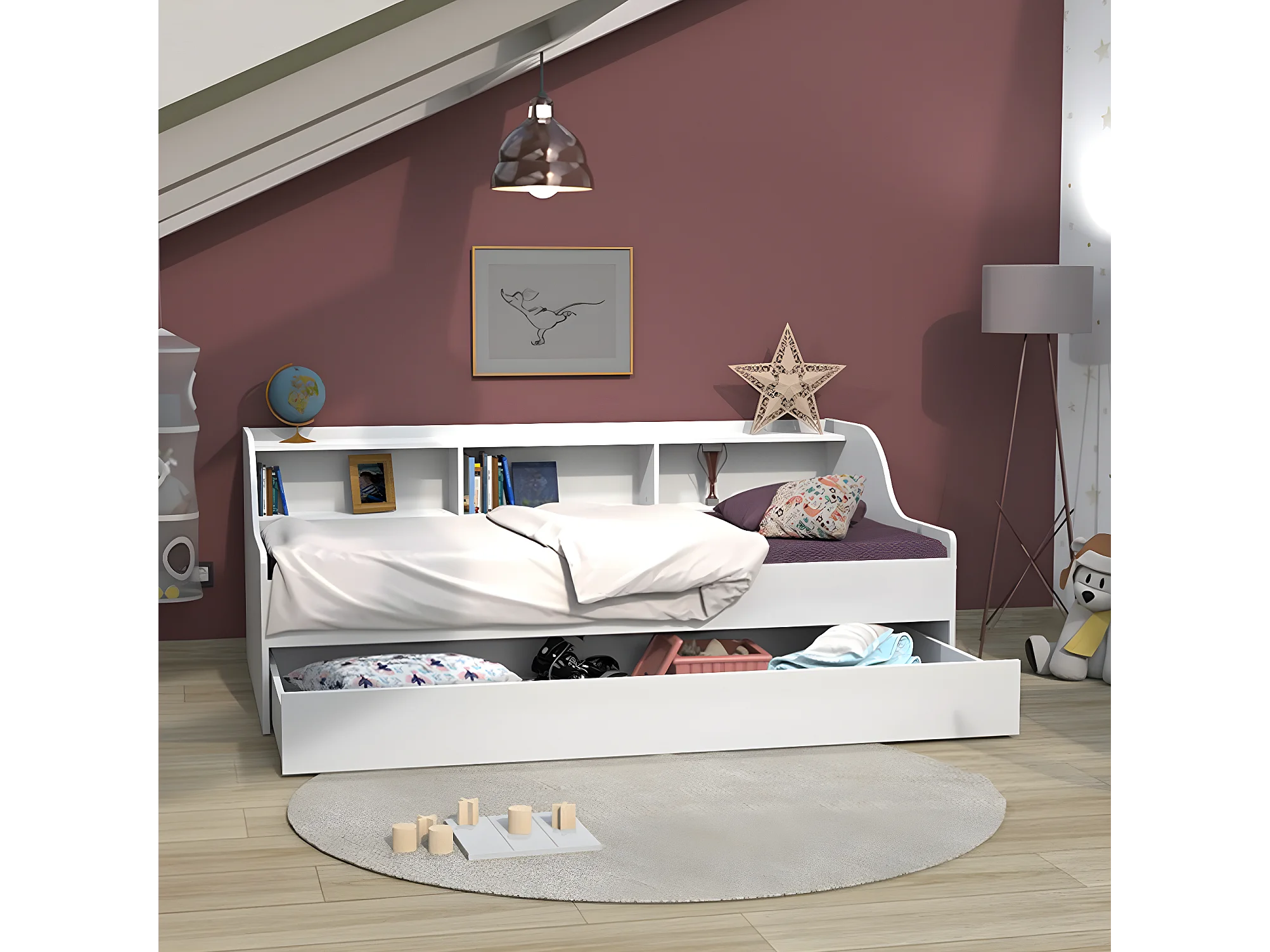 Lit PALMA 90x190 + étagère + 1 tiroir-lit / Blanc