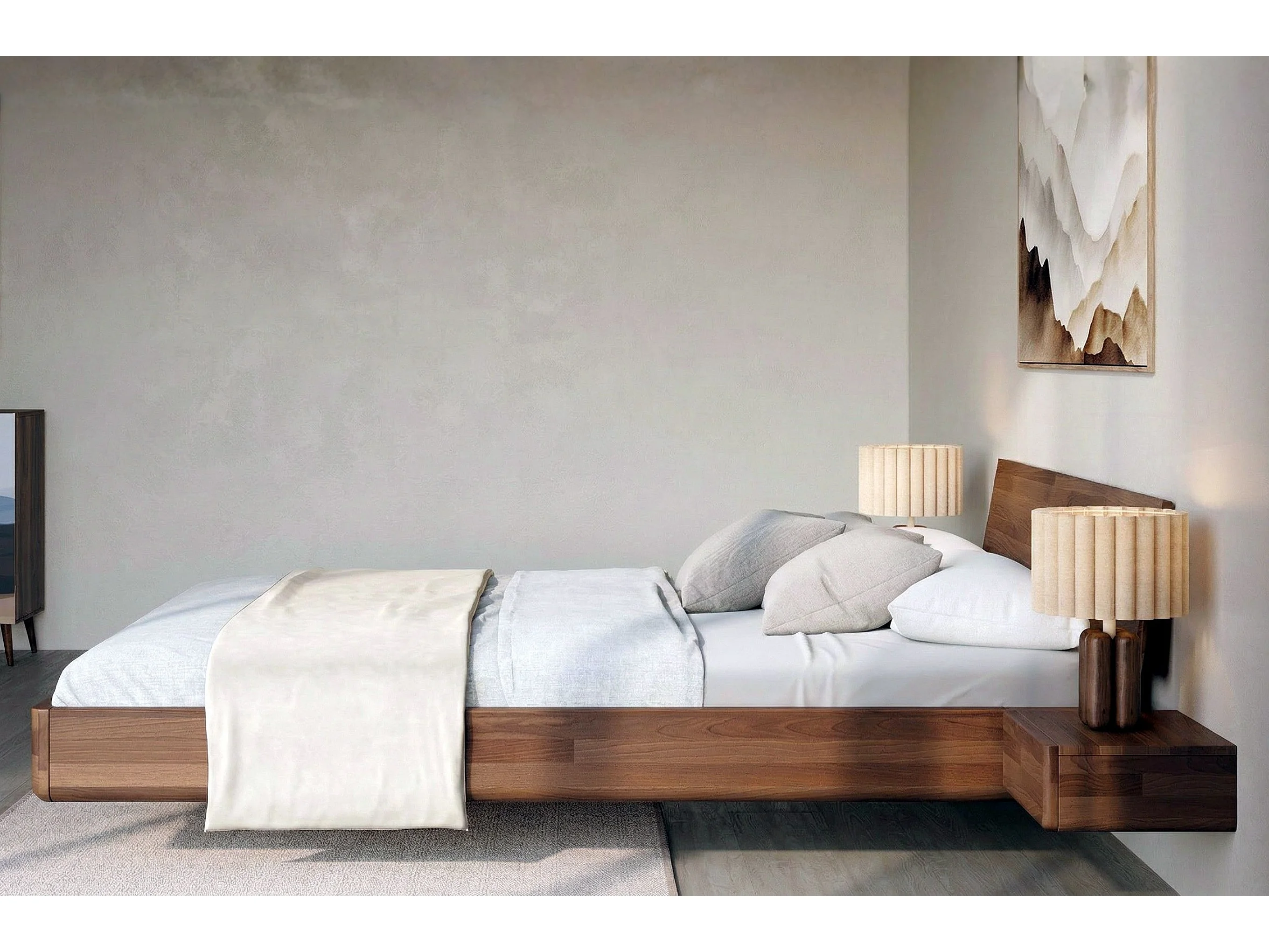 Lit flottant en hêtre massif LENA avec chevets / 200x200 cm, couleur noyer