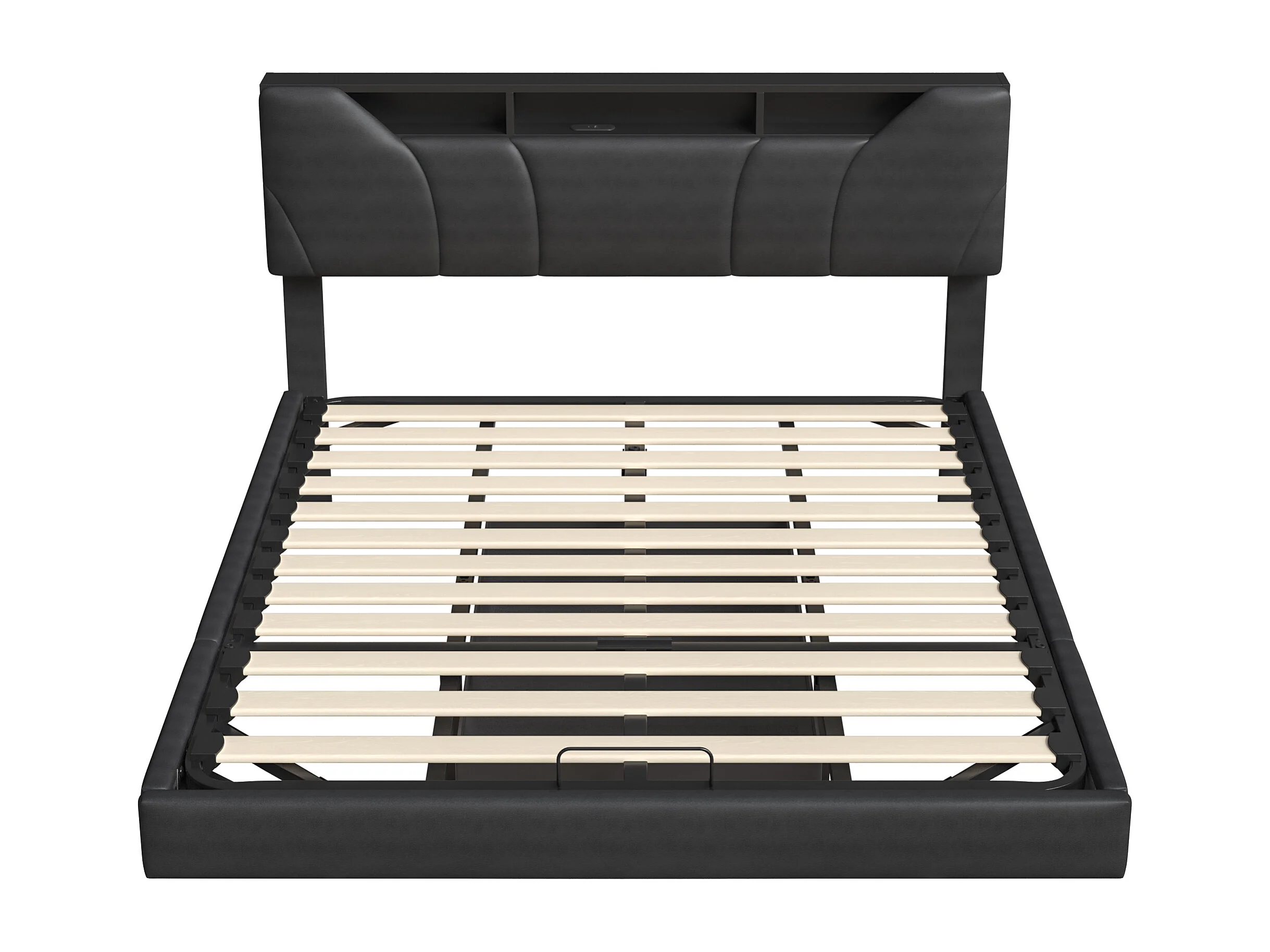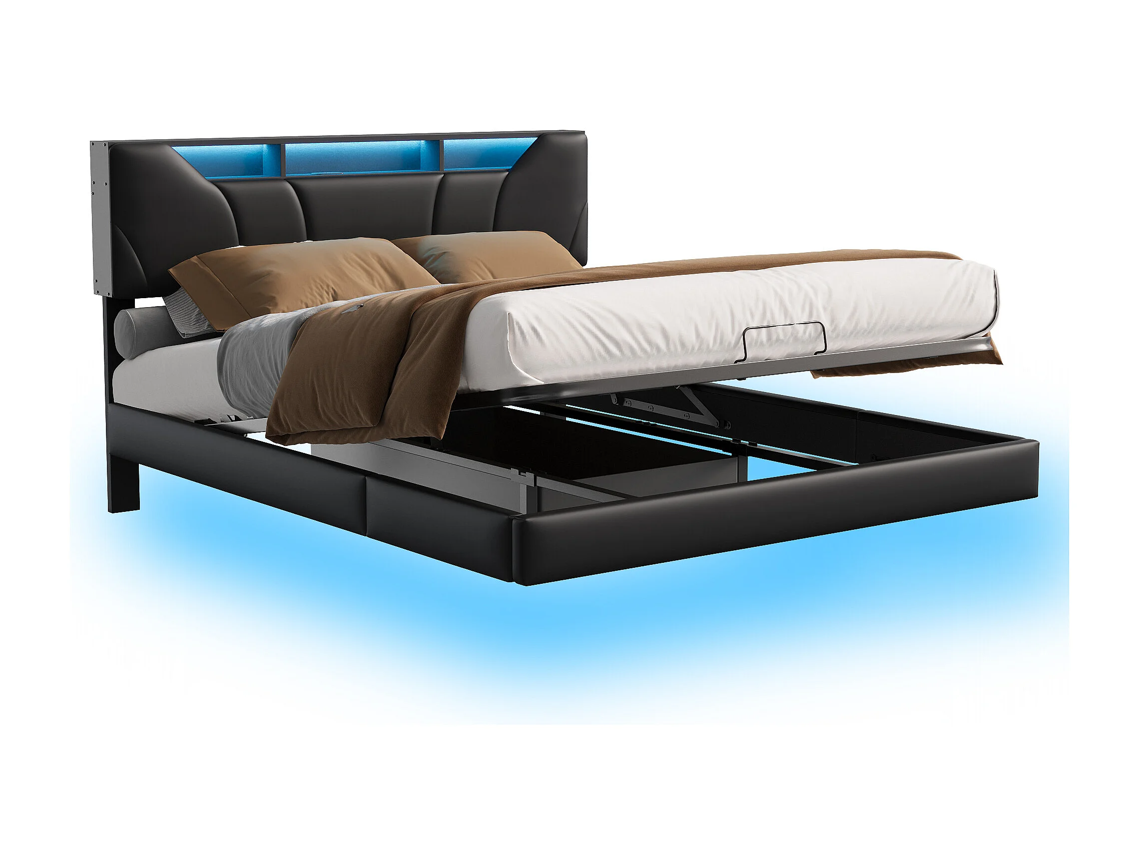 Lit flottant PU noir - lit de stockage hydraulique 160x200cm avec lumières LED et port de charge USB - lit double rembourré