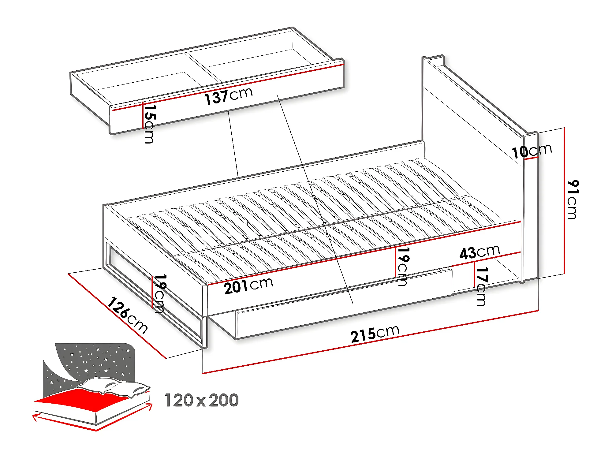 Lit Orlbale 116, Unique, Brun clair, 120x200, Stratifié, Disponible, 126x215x91cm
