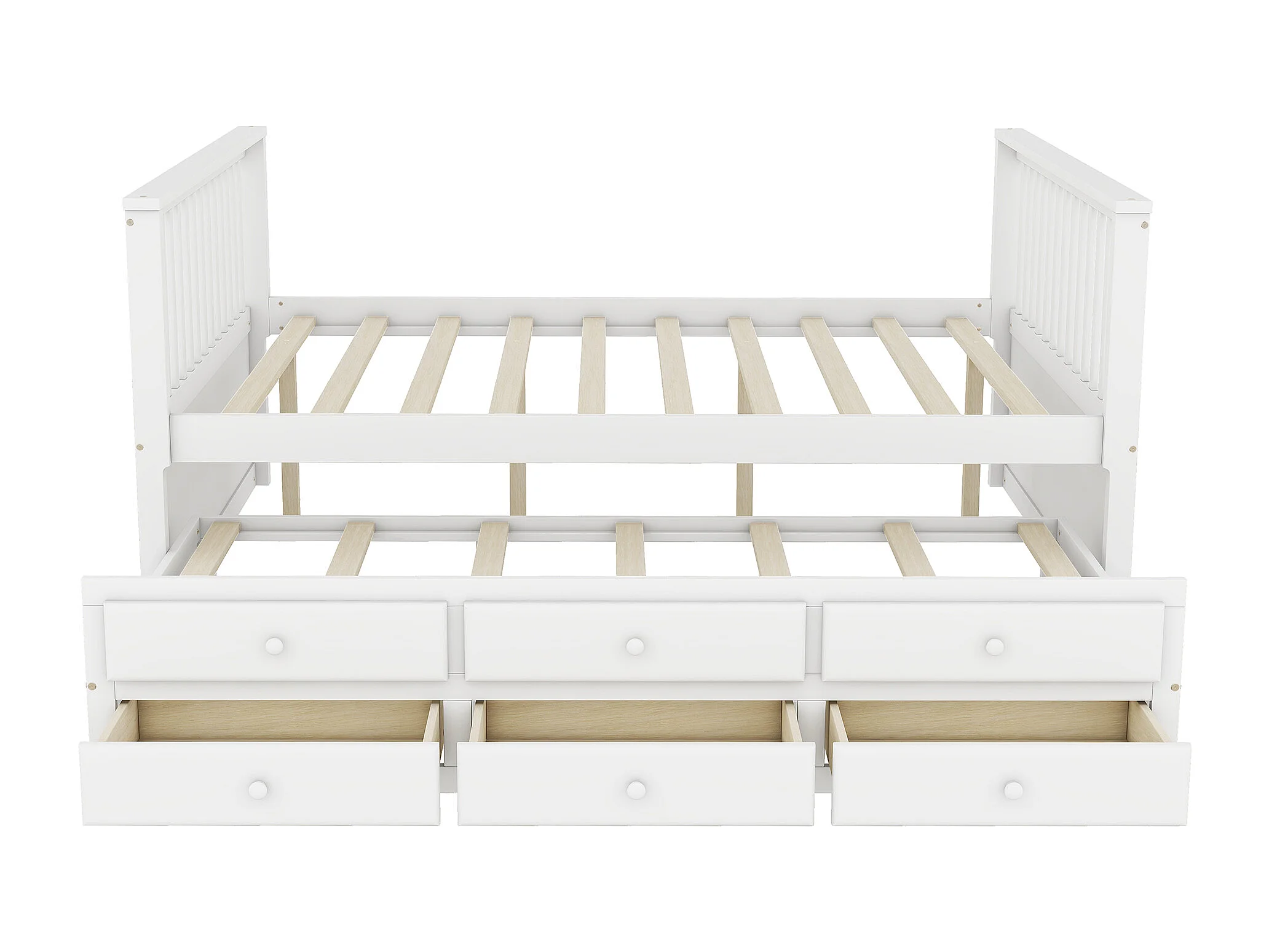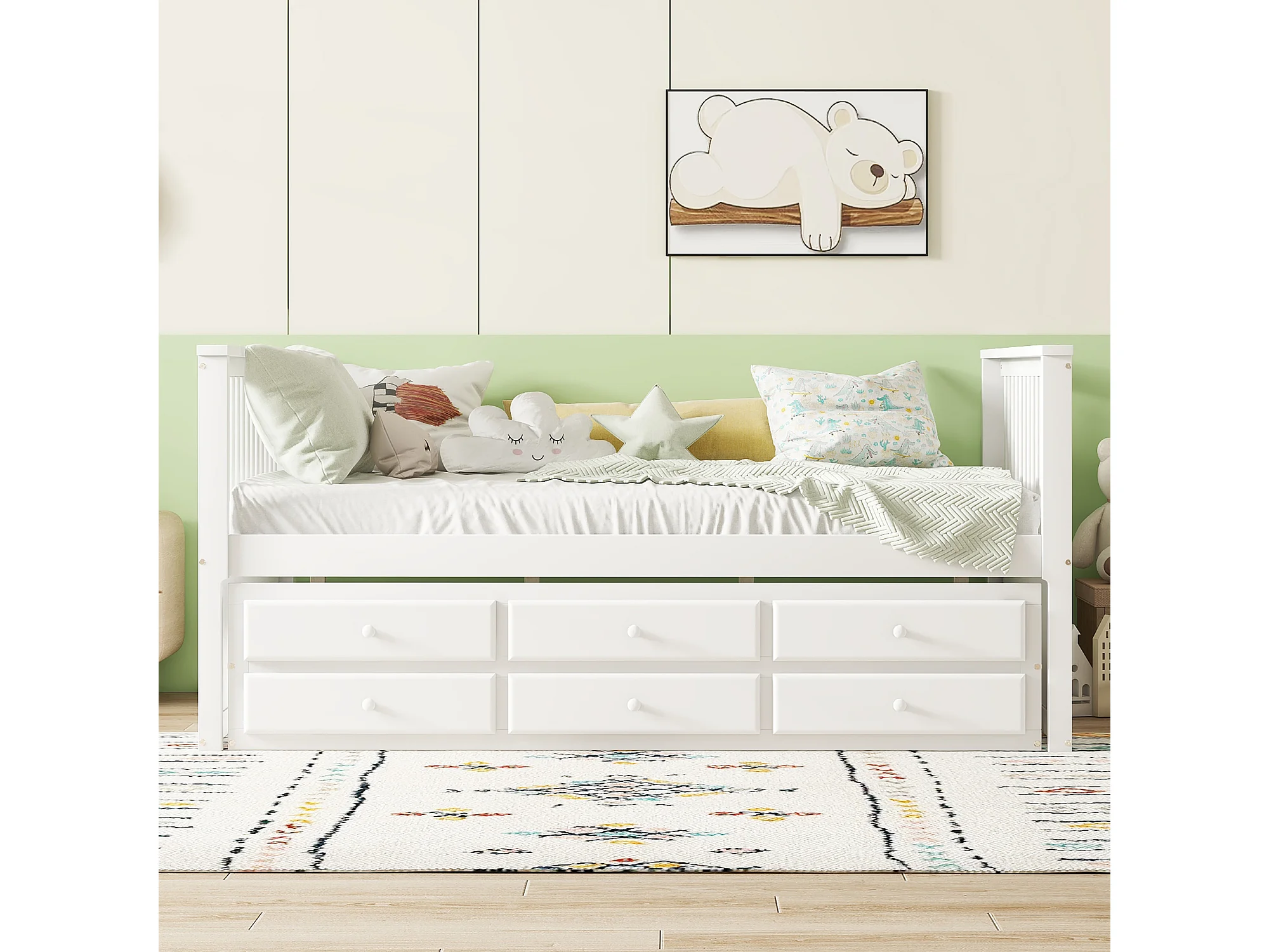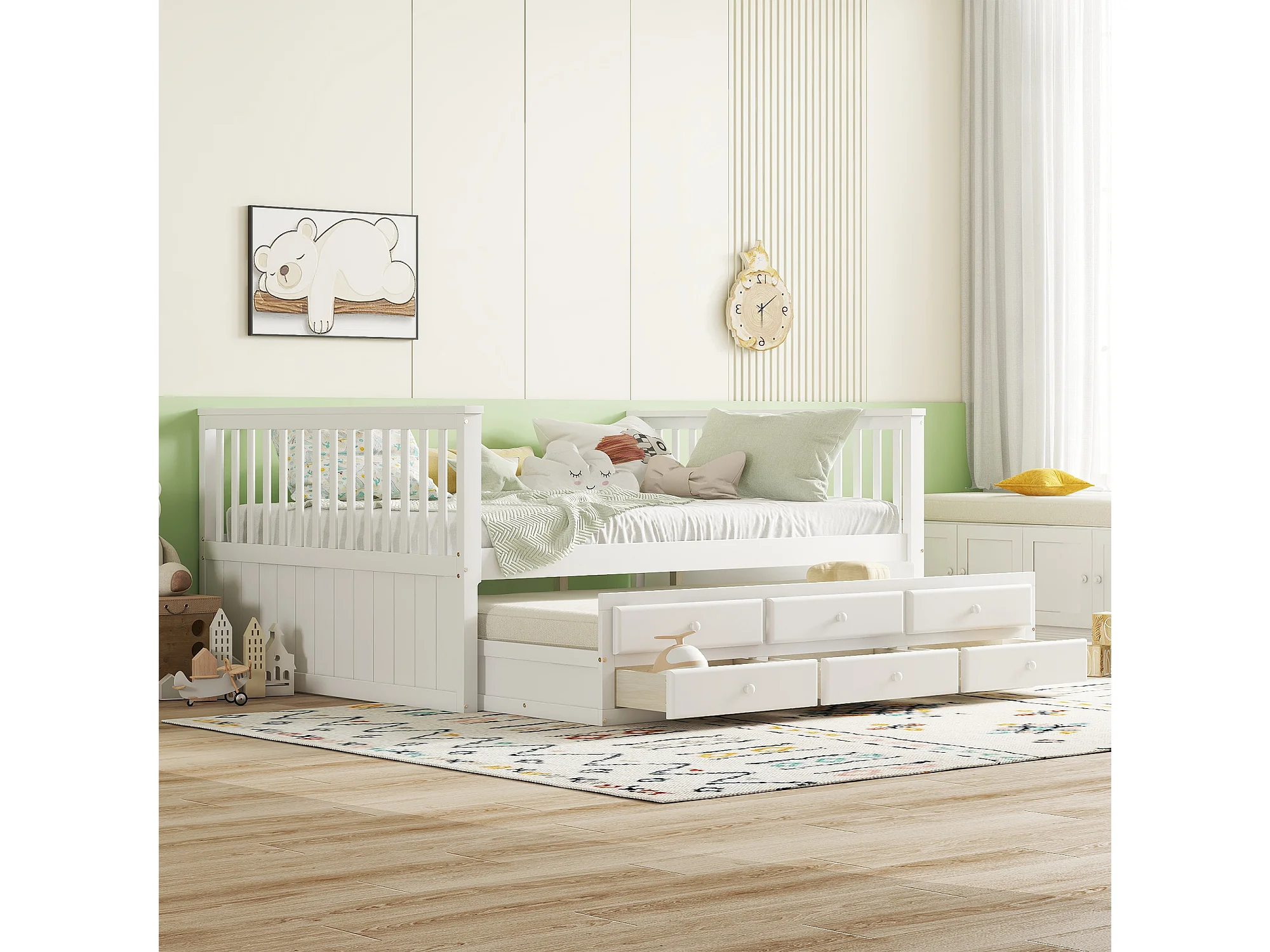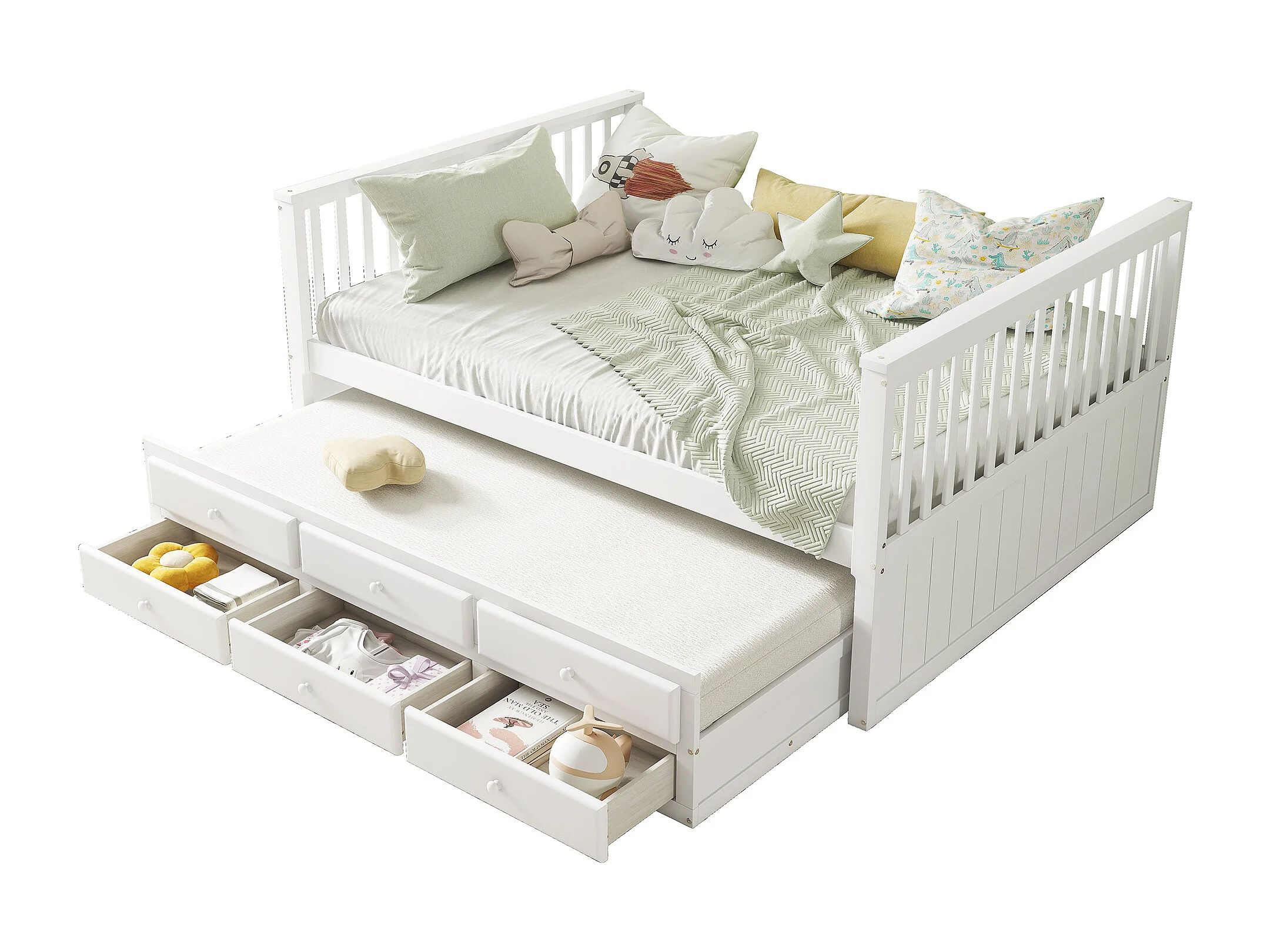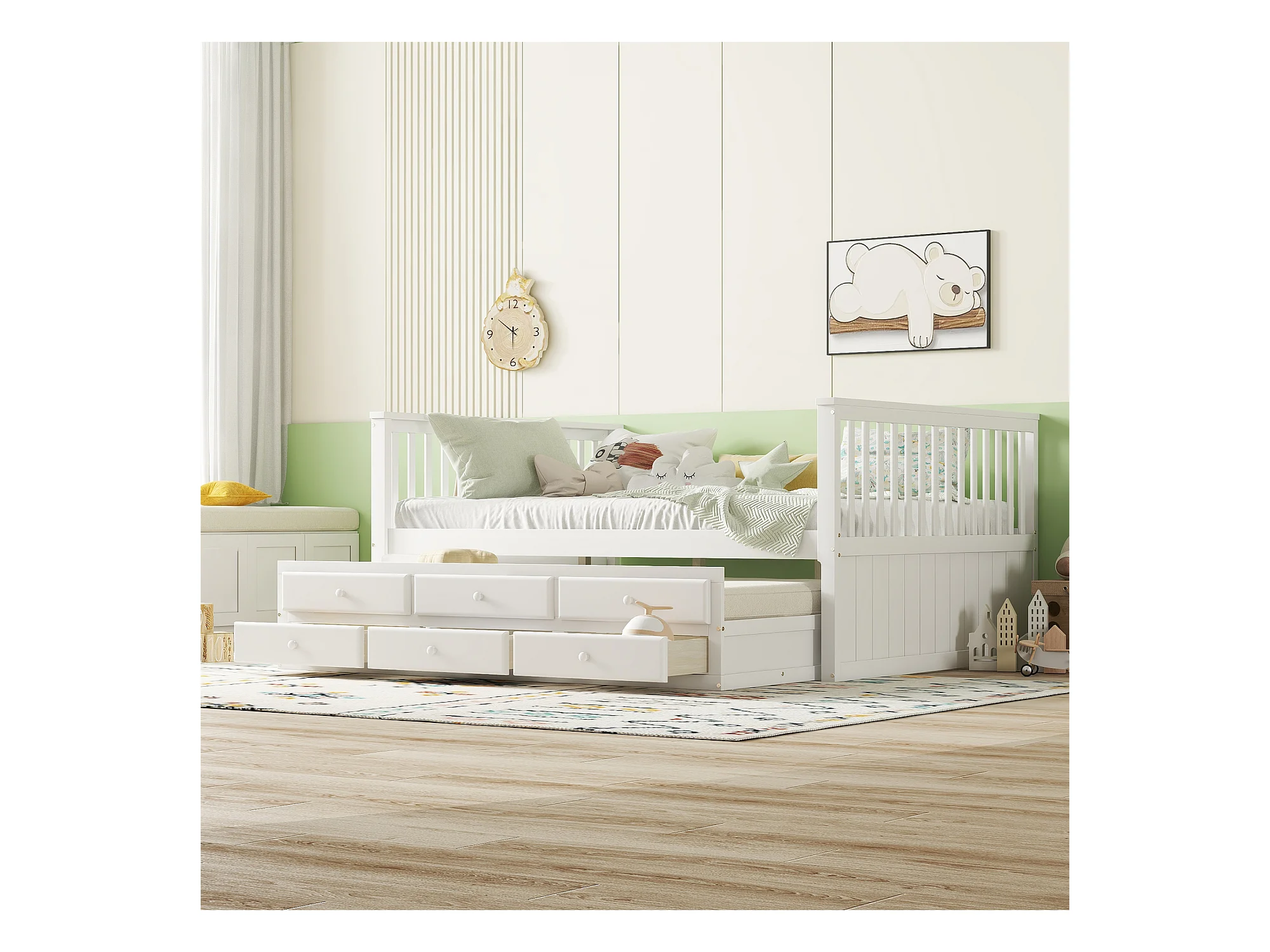 Lit gigogne 140 x 200 cm + 90 x 190 cm avec 3 tiroirs - Bois massif + MDF - Sommier à lattes - Blanc (sans matelas)