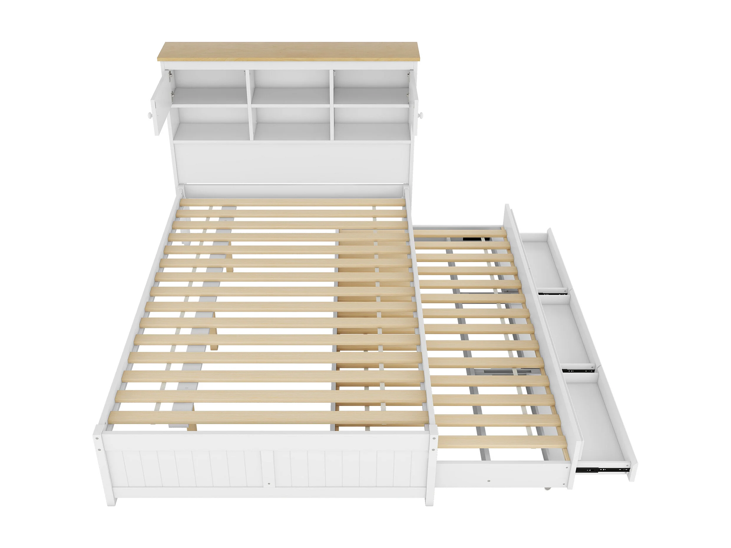 Lit gigogne 140x200cm+90x190cm, avec 3 tiroirs, avec sommier à lattes et tête de lit avec plusieurs rangements, blanc