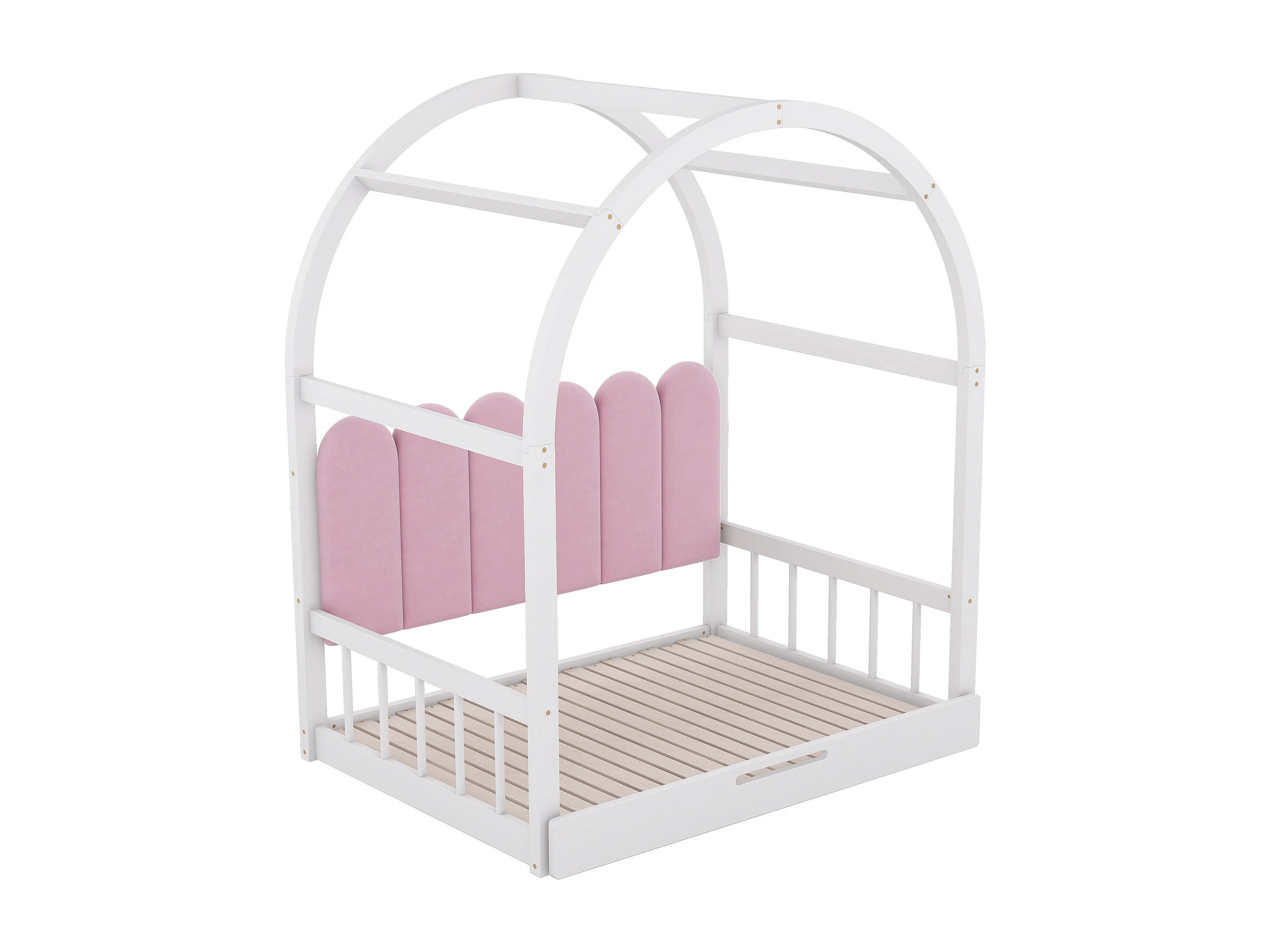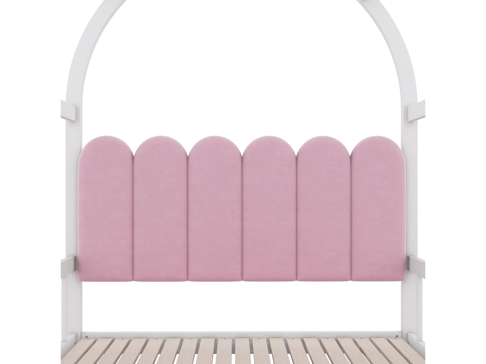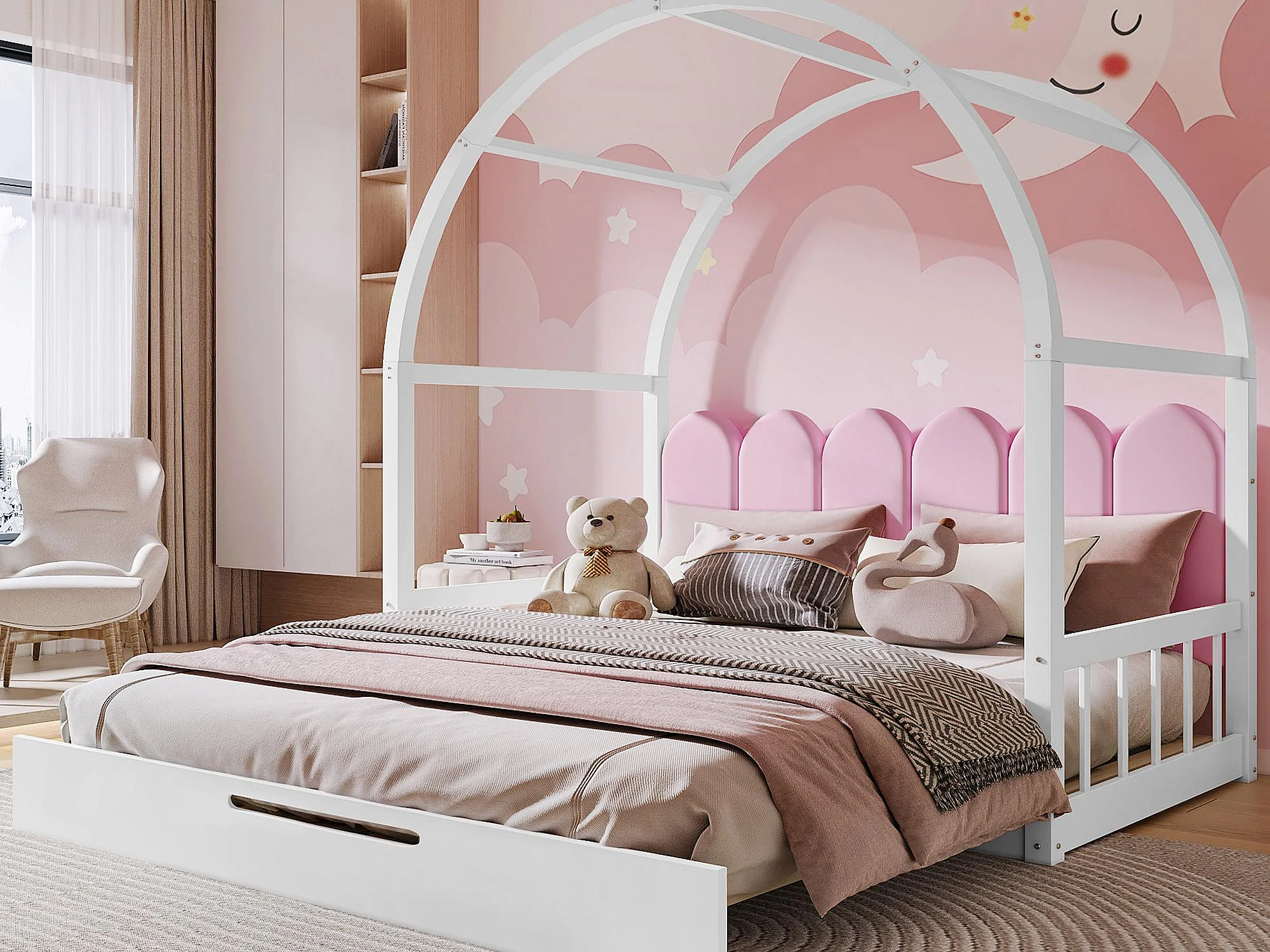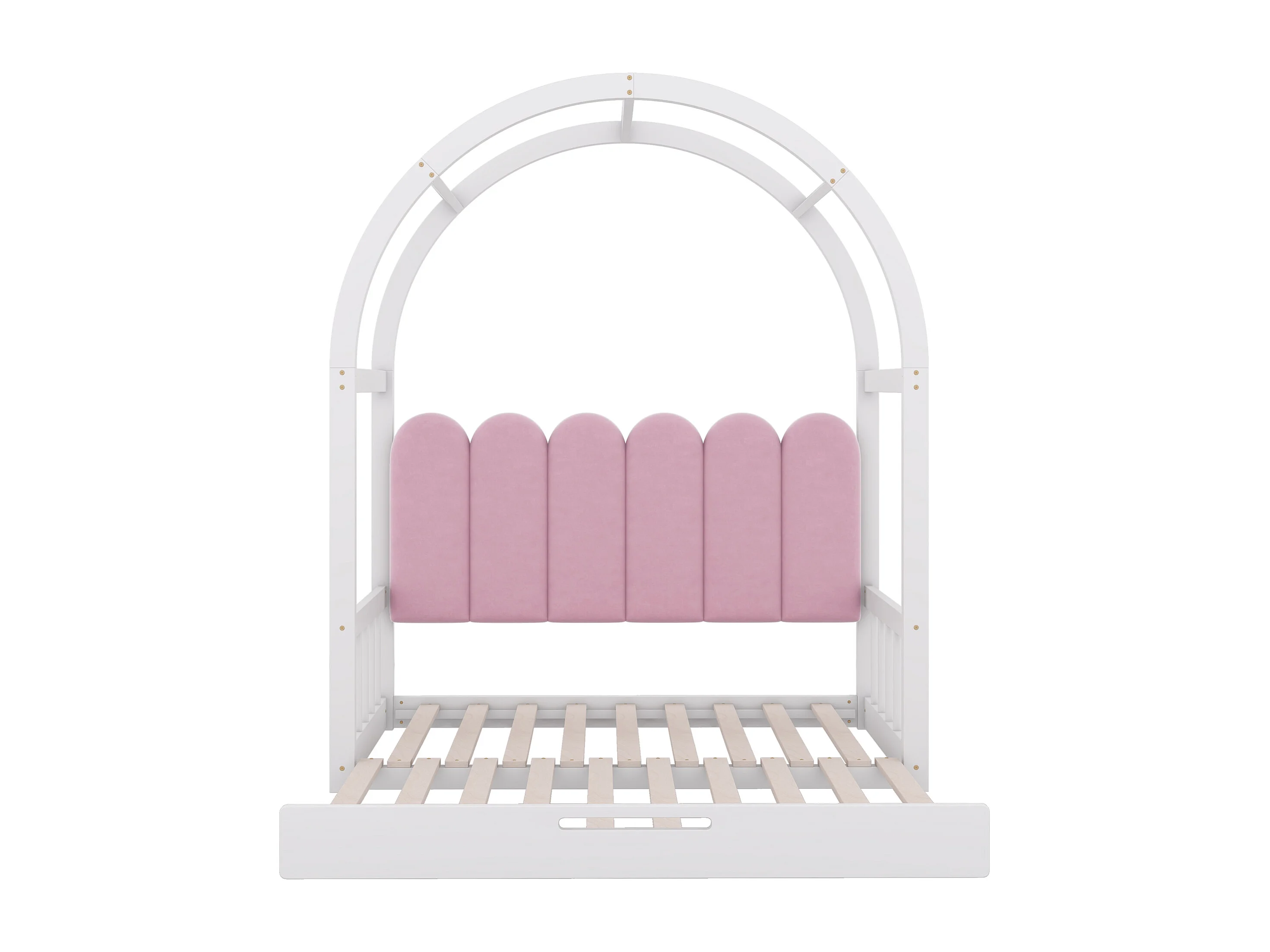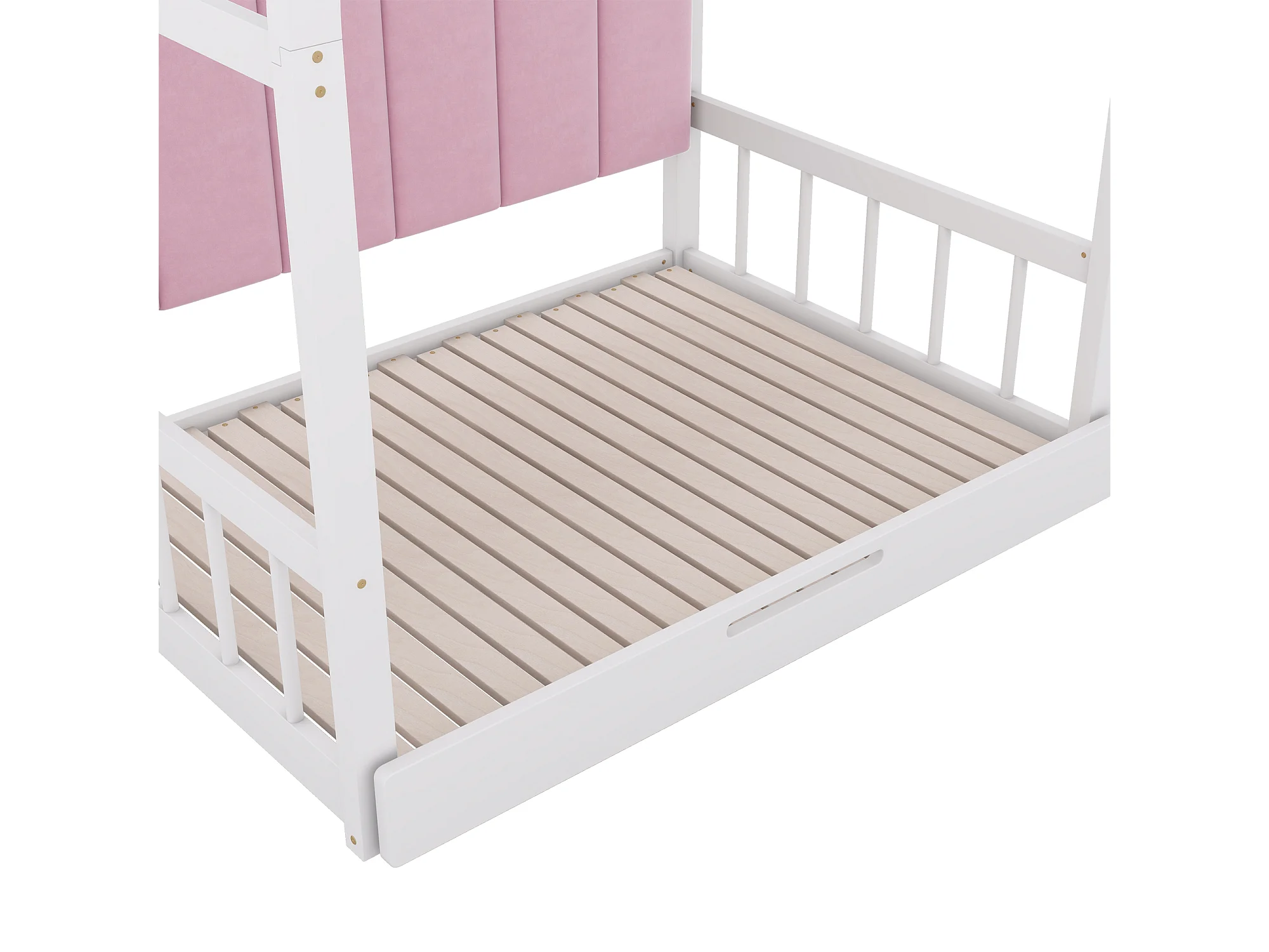 Lit gigogne 140x100/200cm en bois massif - avec tête en velours et sommier à lattes - Rose & Blanc