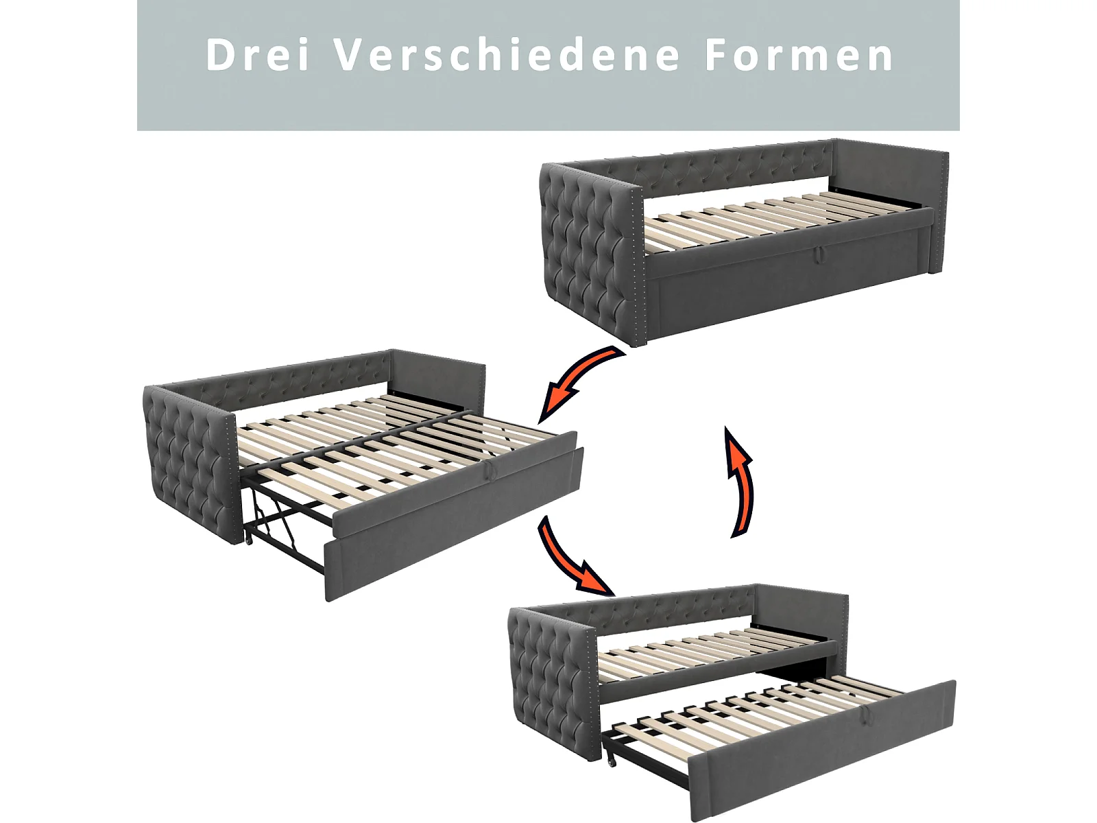 Lit gigogne 90 x 200 cm - avec sommier à lattes - velours - gris