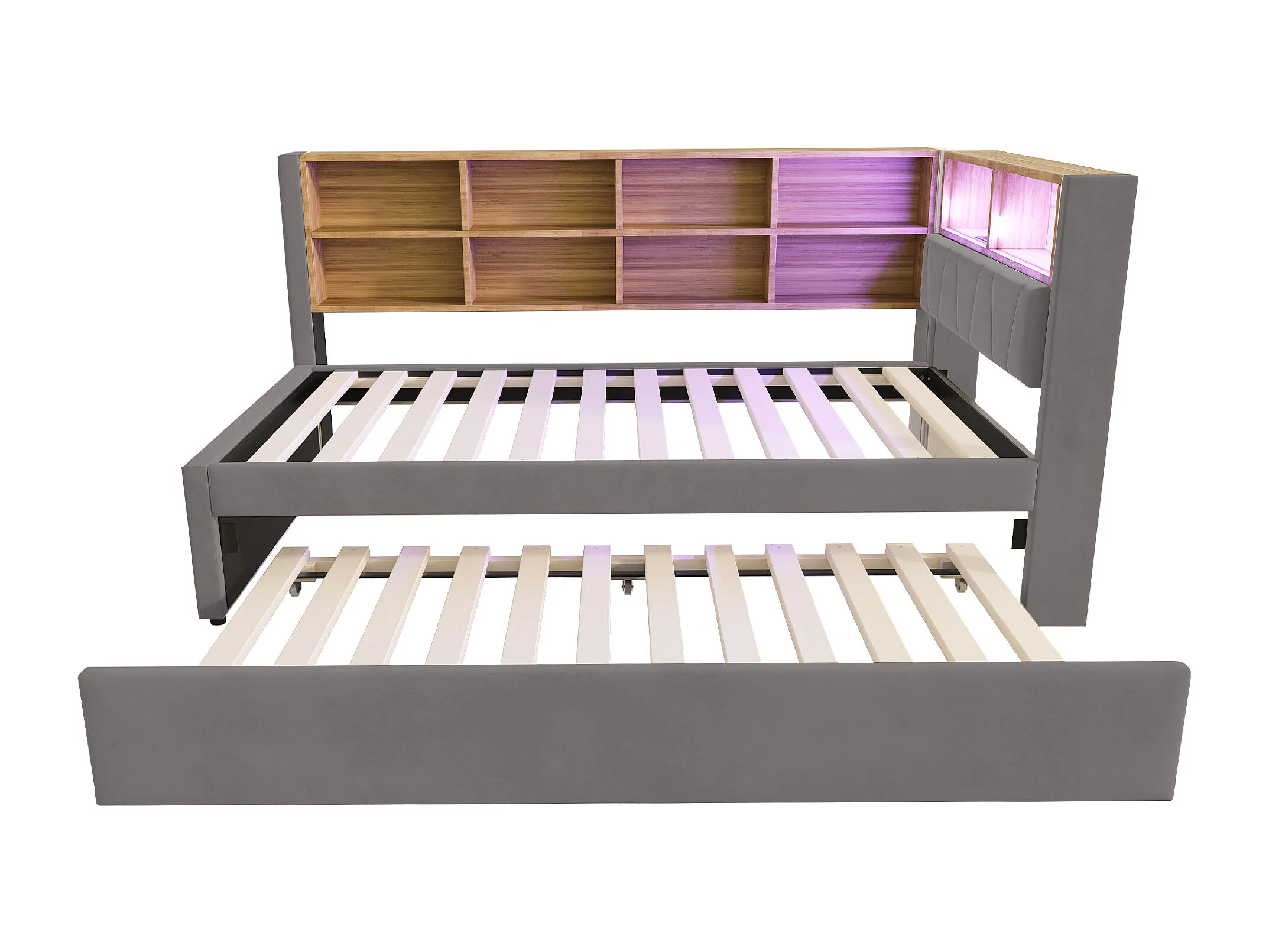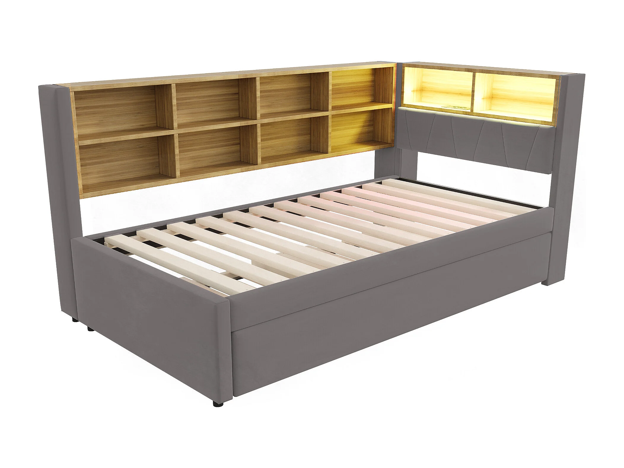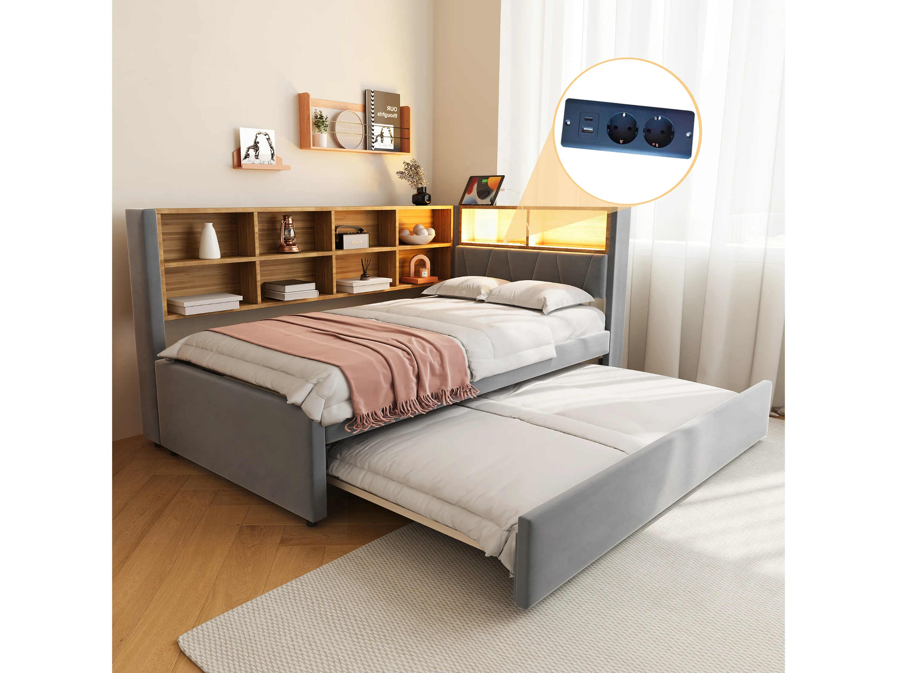 Lit gigogne 90 x 200 cm - Lit banquette avec lumières LED et nombreux rangements - flanelle gris foncé