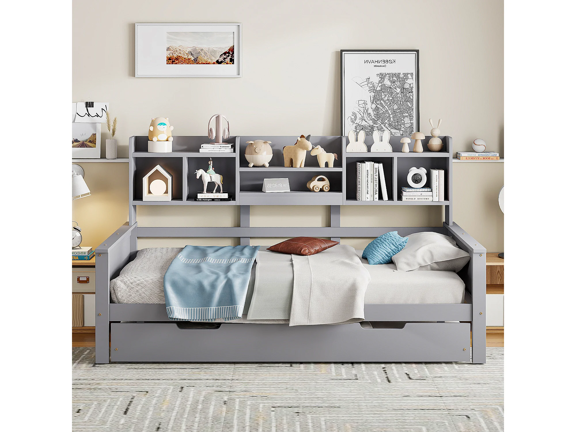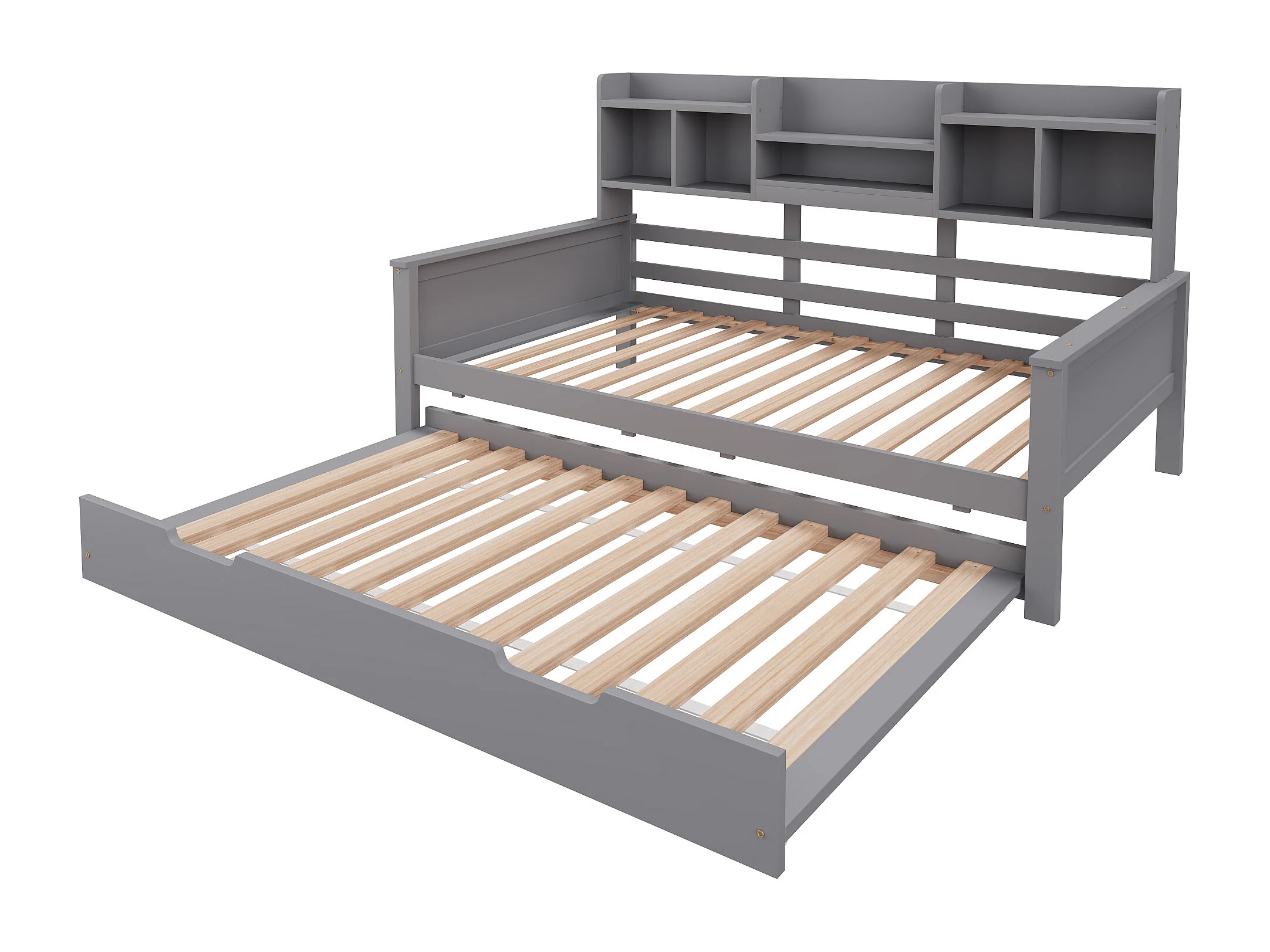 Lit gigogne 90x200/190 cm avec compartiment de rangement et sommier, finition bois gris, sans matelas