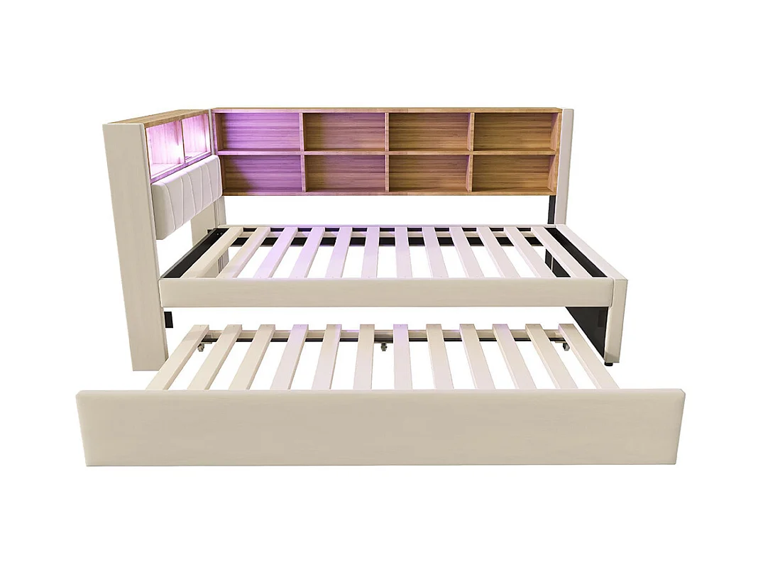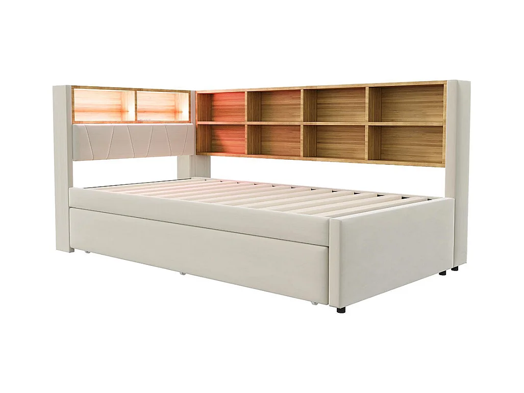 Lit gigogne 90x200 avec LED prises électriques rangement rembourré canapé-lit multifonctionnel flanelle beige