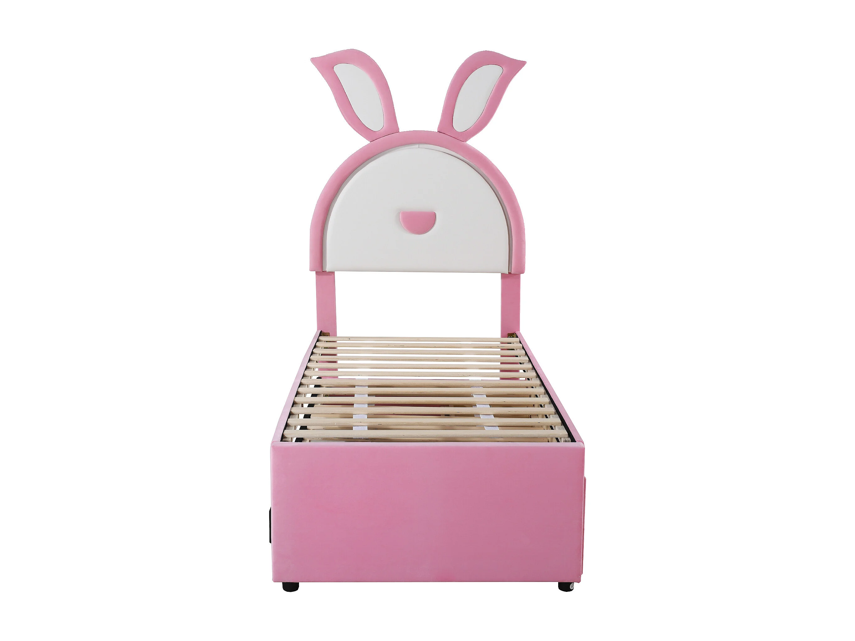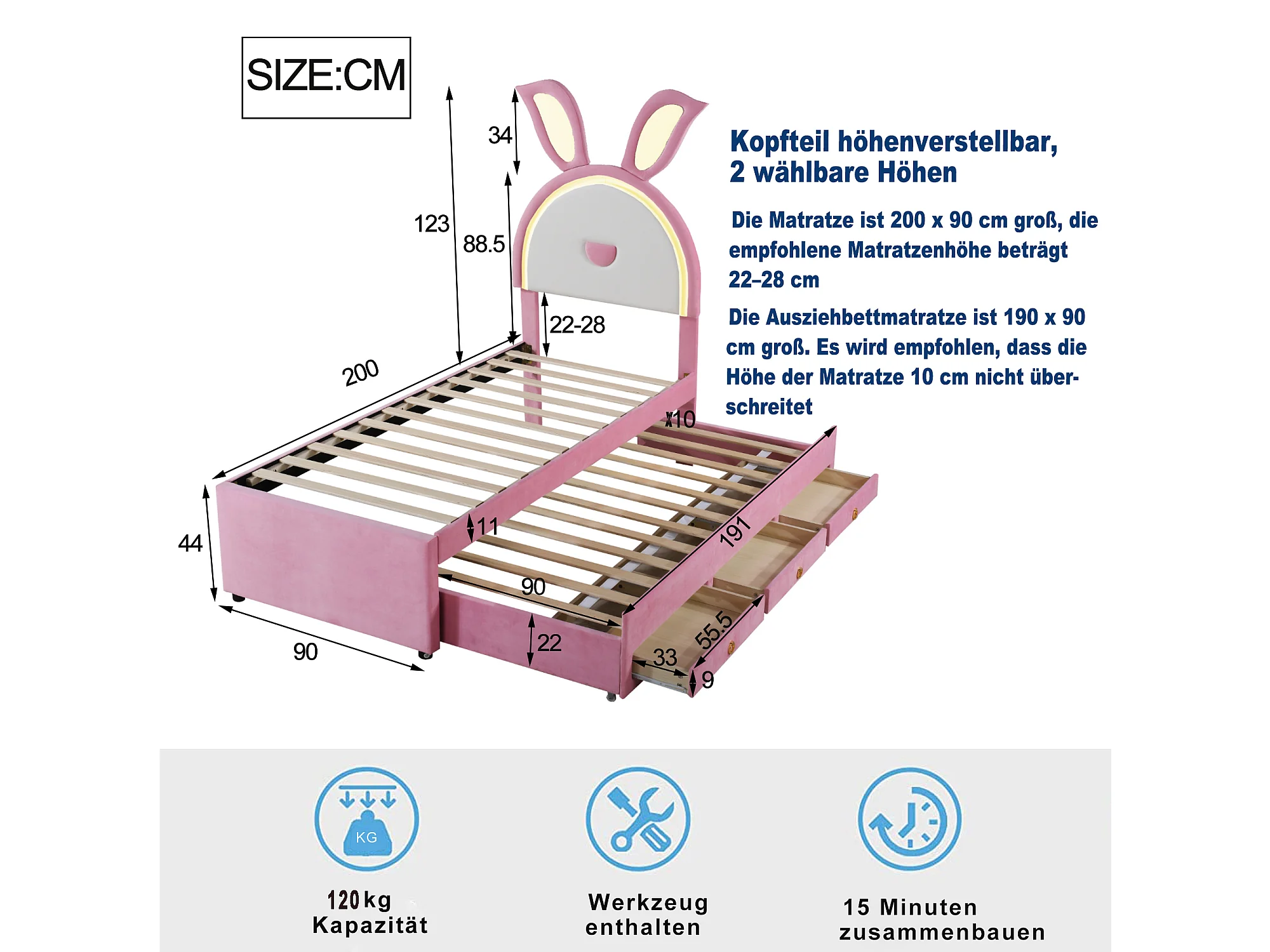 Lit gigogne 90x200 cm - Lit enfant avec 3 tiroirs et éclairage LED - velours rose - sans matelas