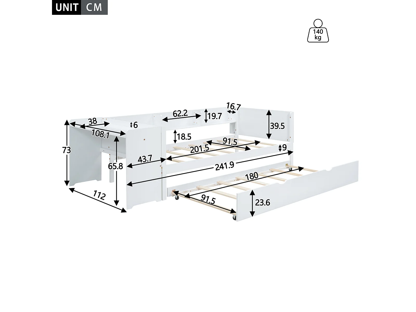 Lit gigogne 90x200cm+90x180cm, avec petit bureau, trois étagères sur le côté du lit, blanc