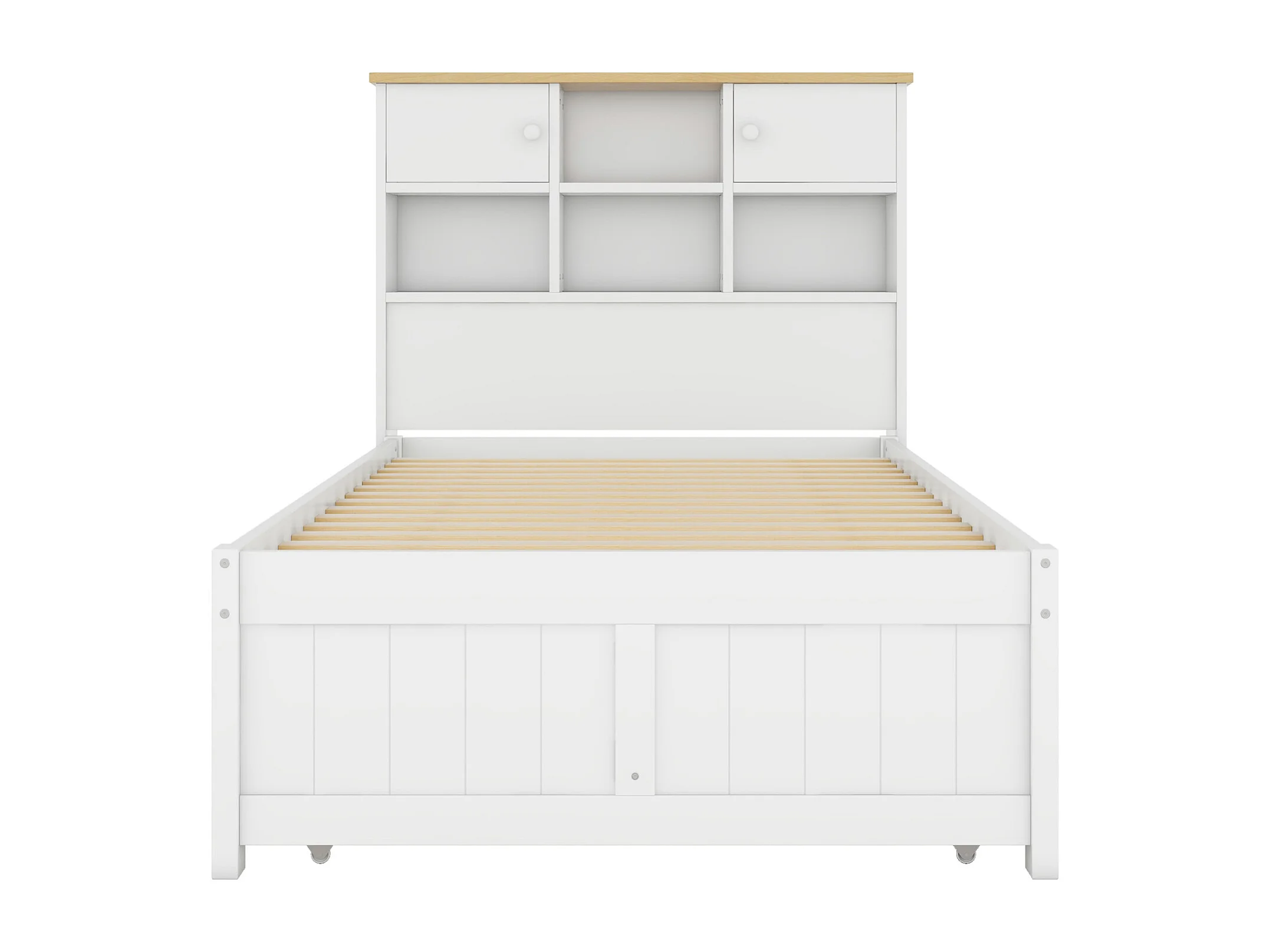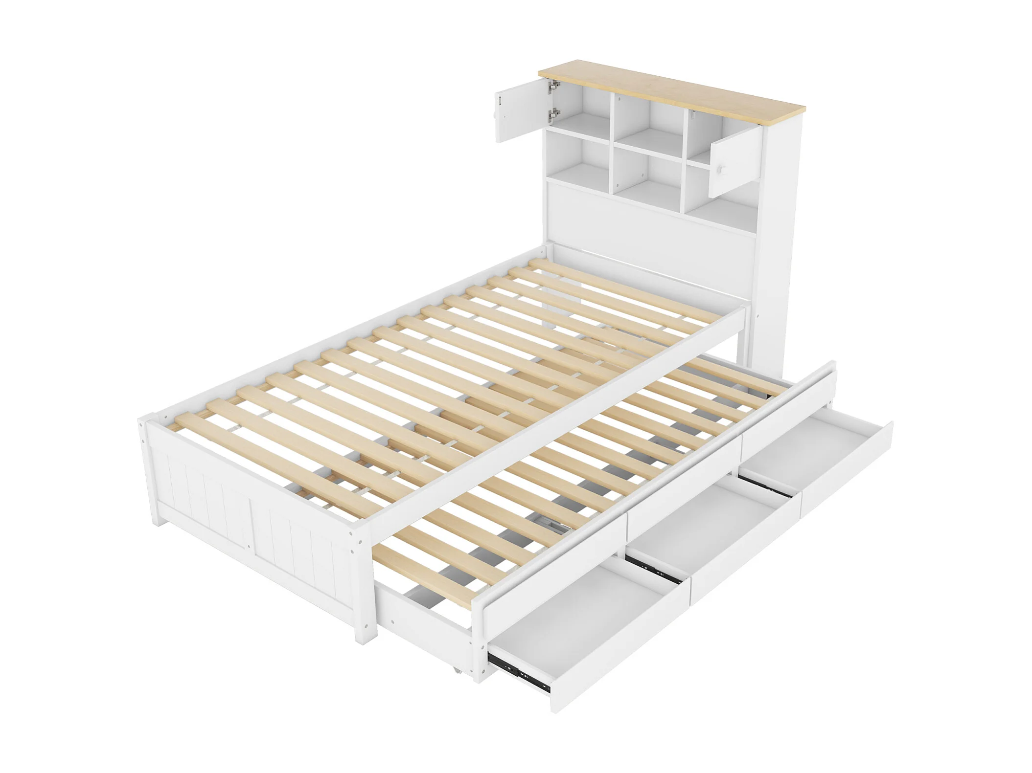 Lit gigogne 90x200cm+90x190cm, avec 3 tiroirs, avec sommier à lattes et tête de lit avec plusieurs rangements, blanc