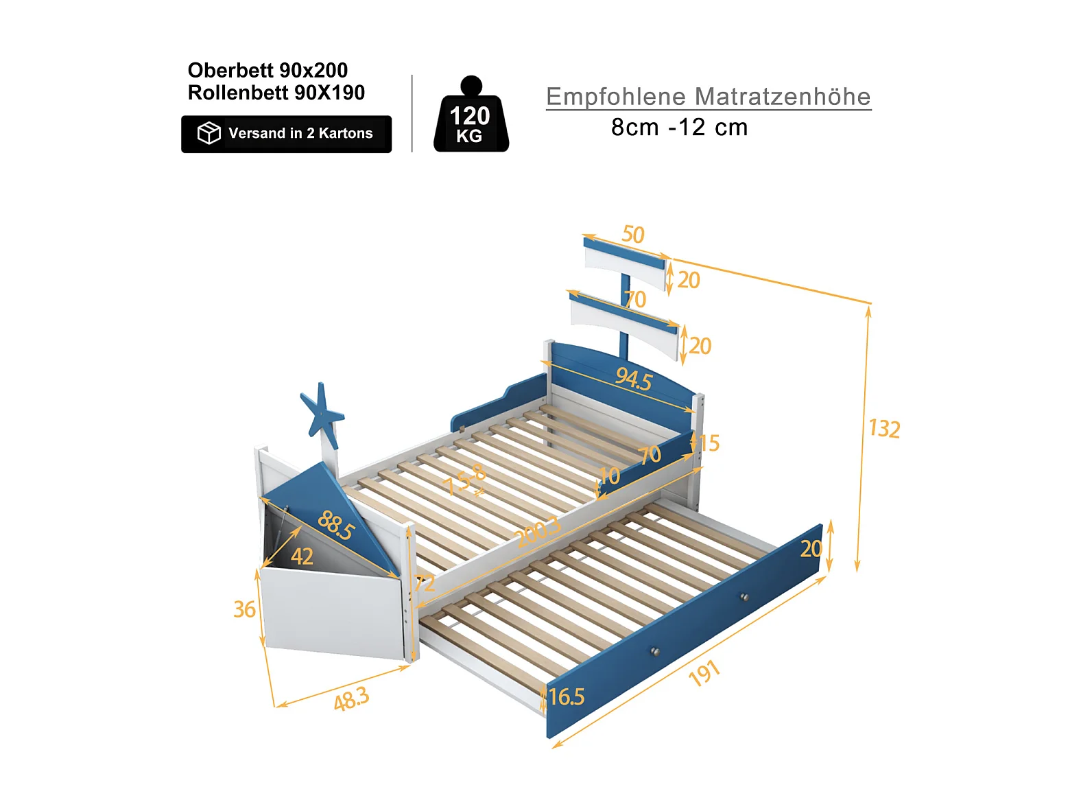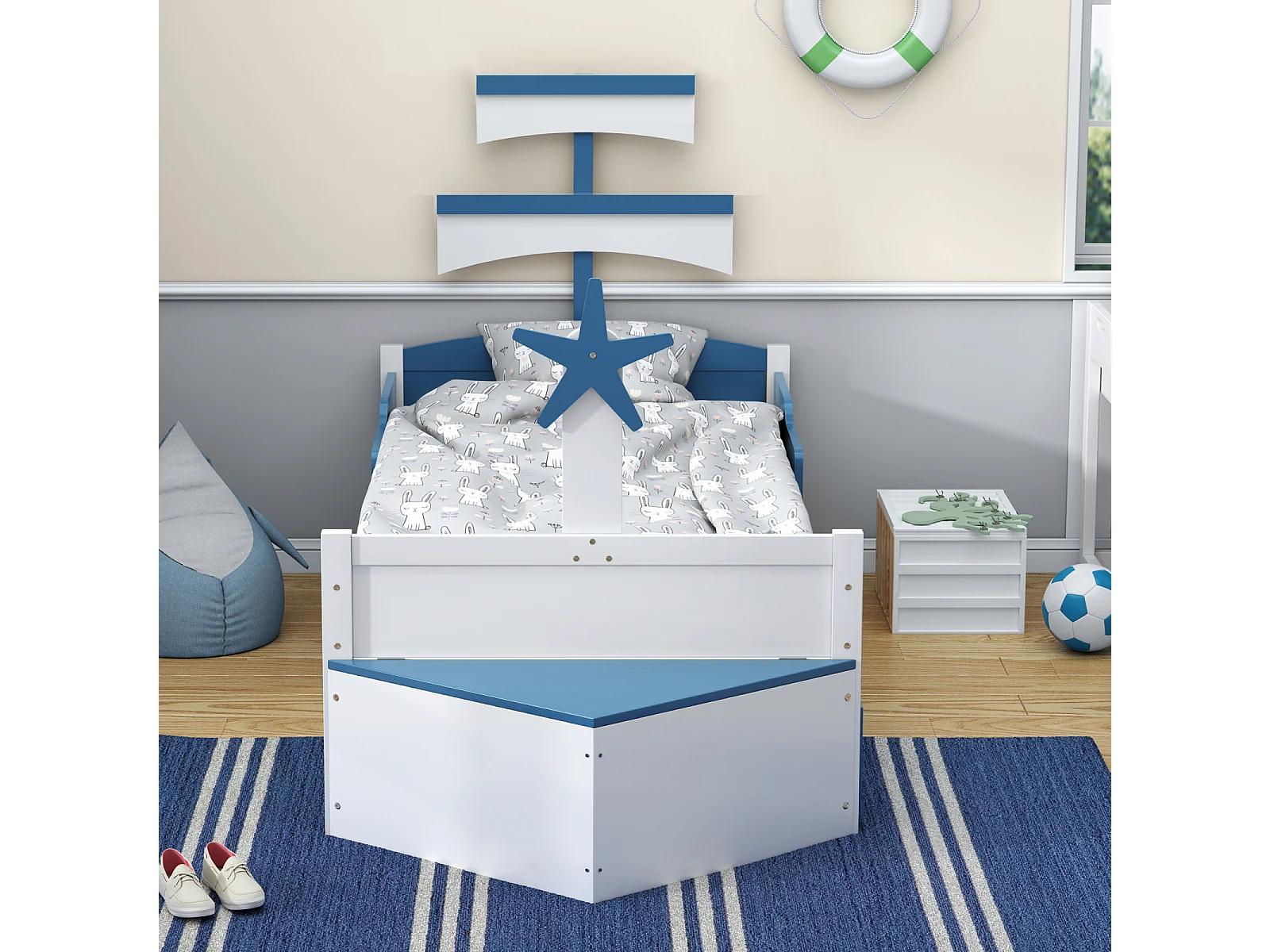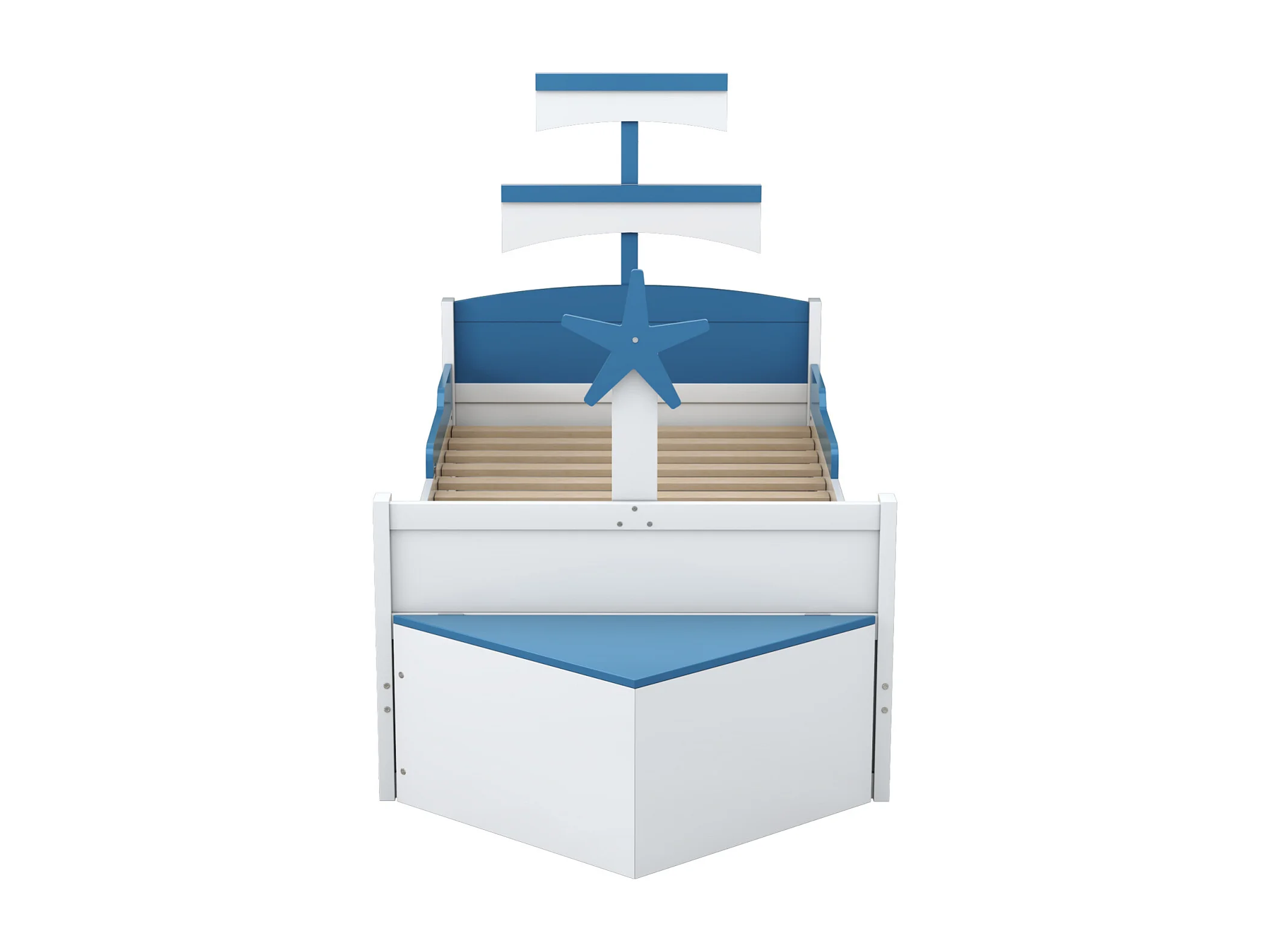 Lit gigogne 90x200cm+90x190cm, cadre de lit en forme voilier avec sommier à lattes, placard de rangement, bleu