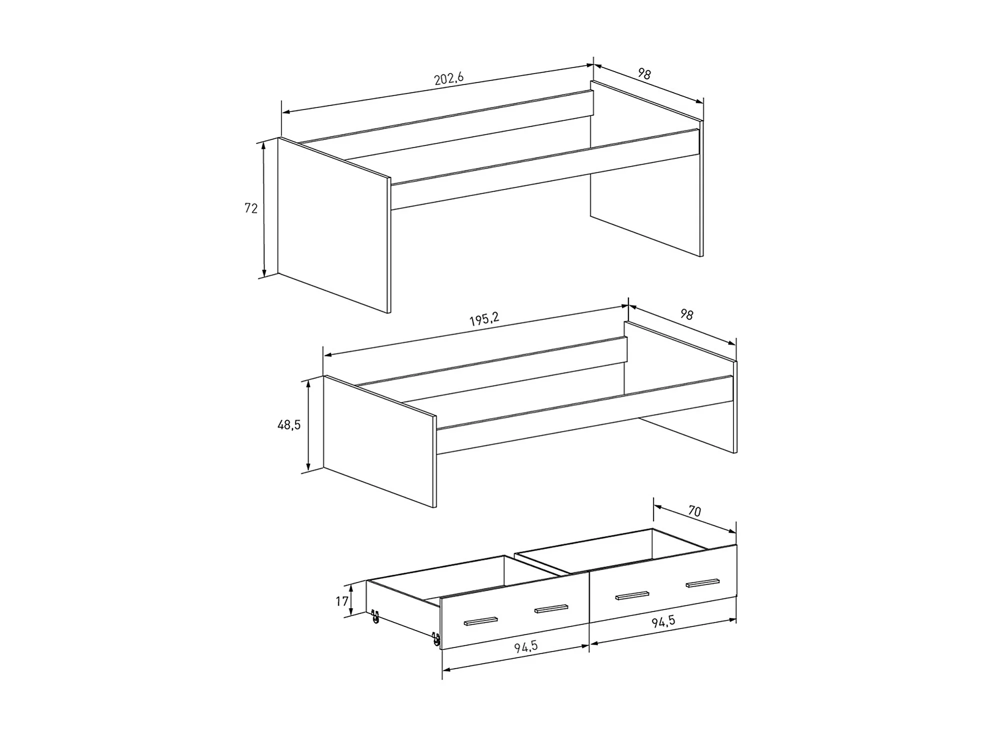 Lit gigogne avec 2 tiroirs coloris beige - Longueur 195,20 x profondeur 98 x hauteur 48,50 cm