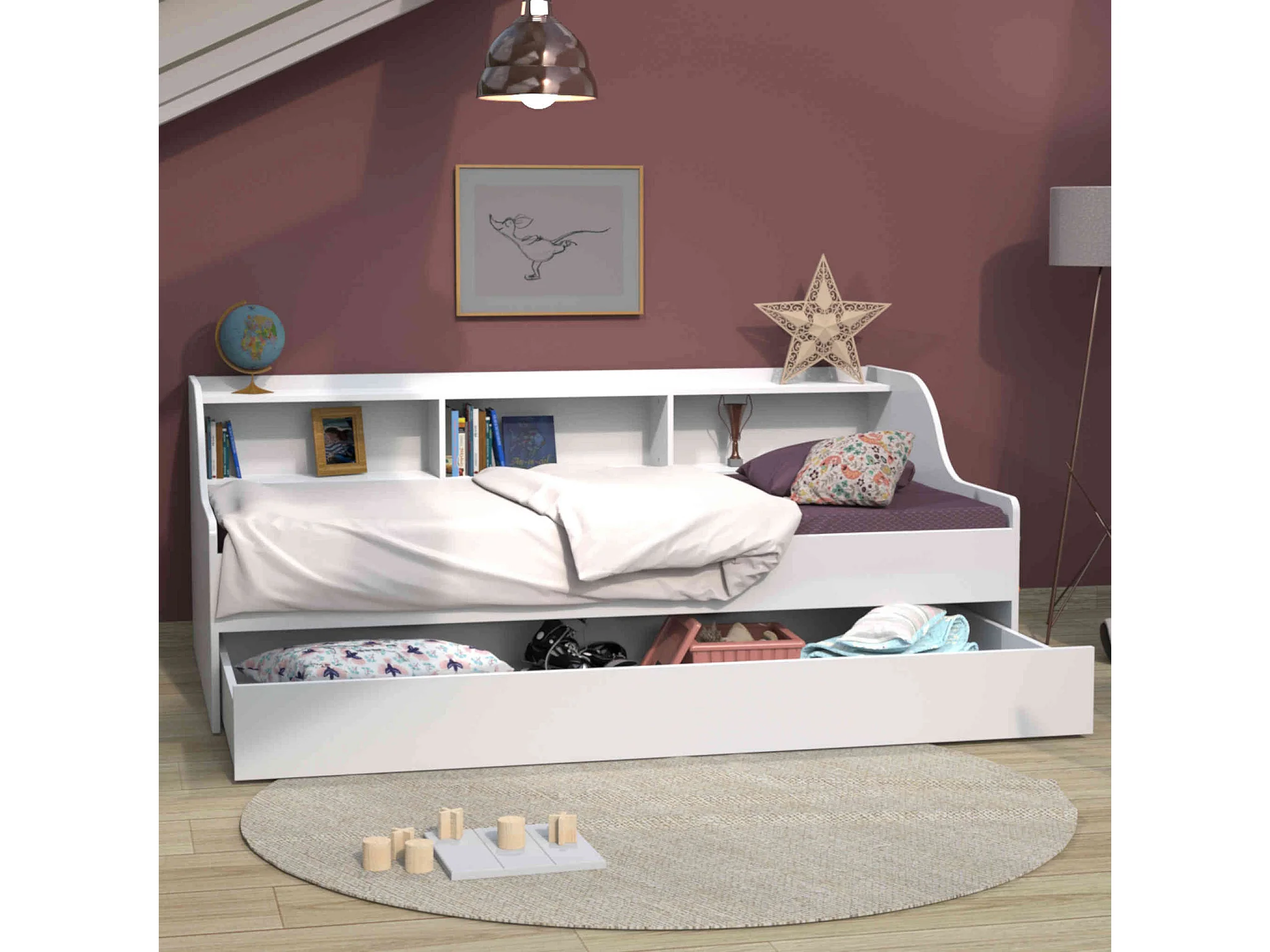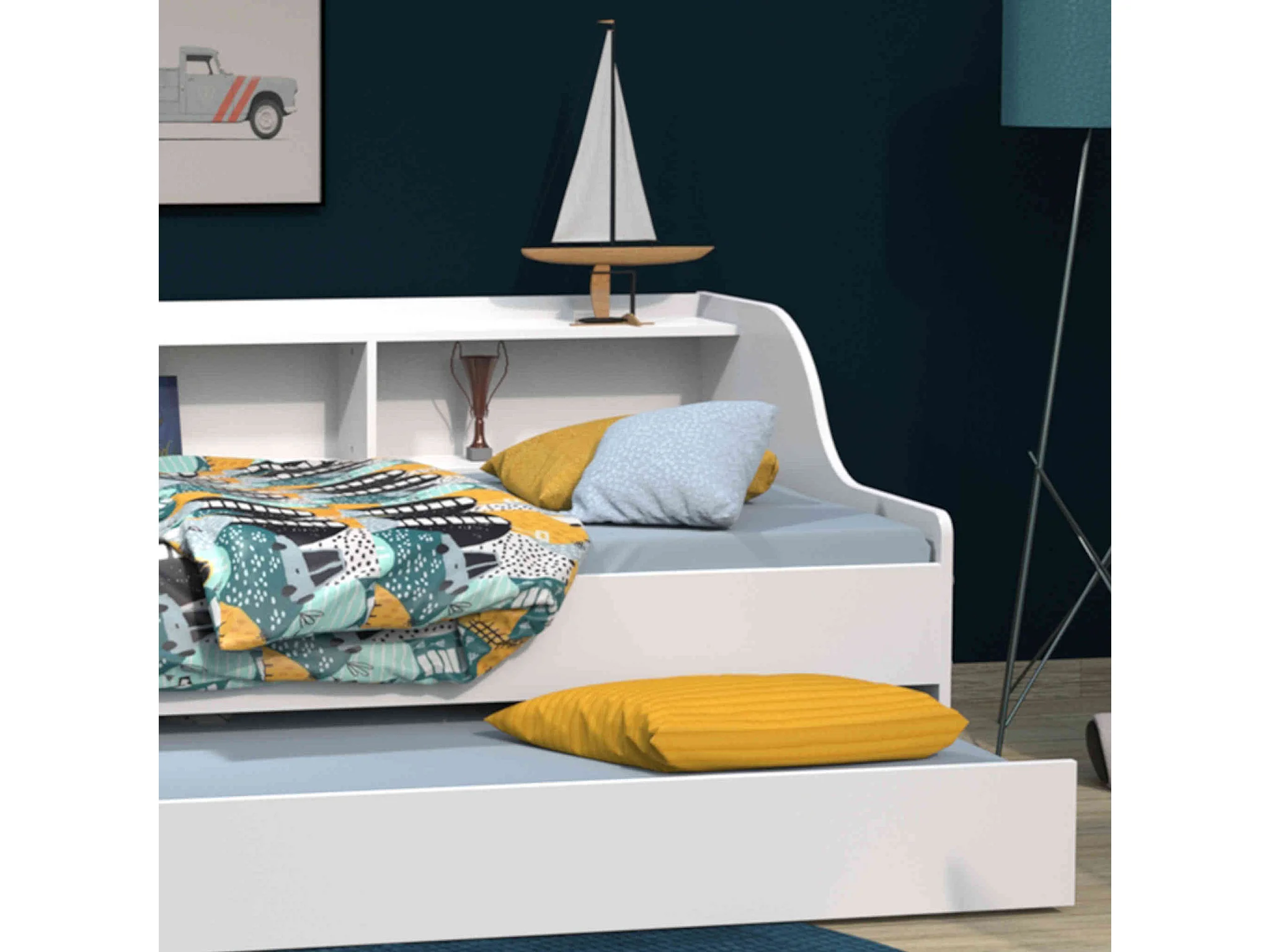Lit gigogne enfant avec étagère en bois blanc 90x190 - LT14031