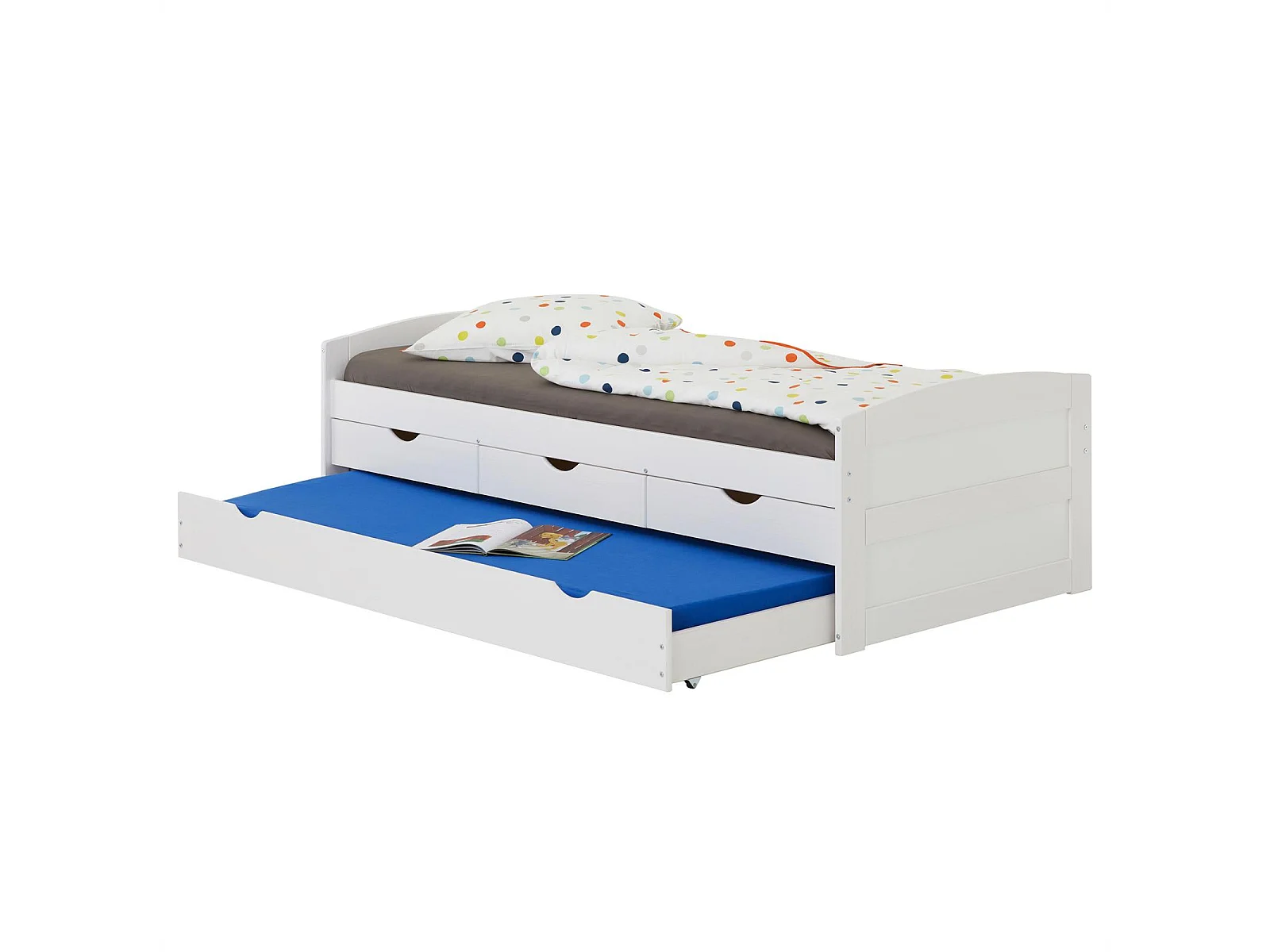 Lit gigogne JESSY lit enfant fonctionnel avec tiroir-lit et rangements 3 tiroirs, couchage 90 x 200 cm, en pin massif lasuré blanc