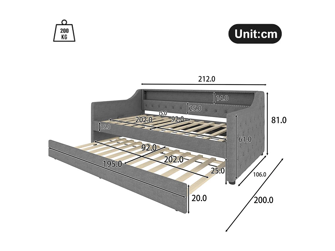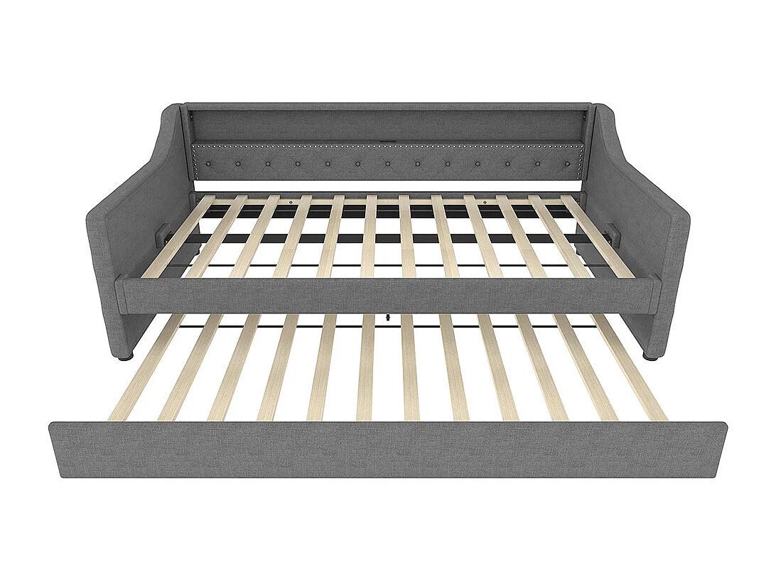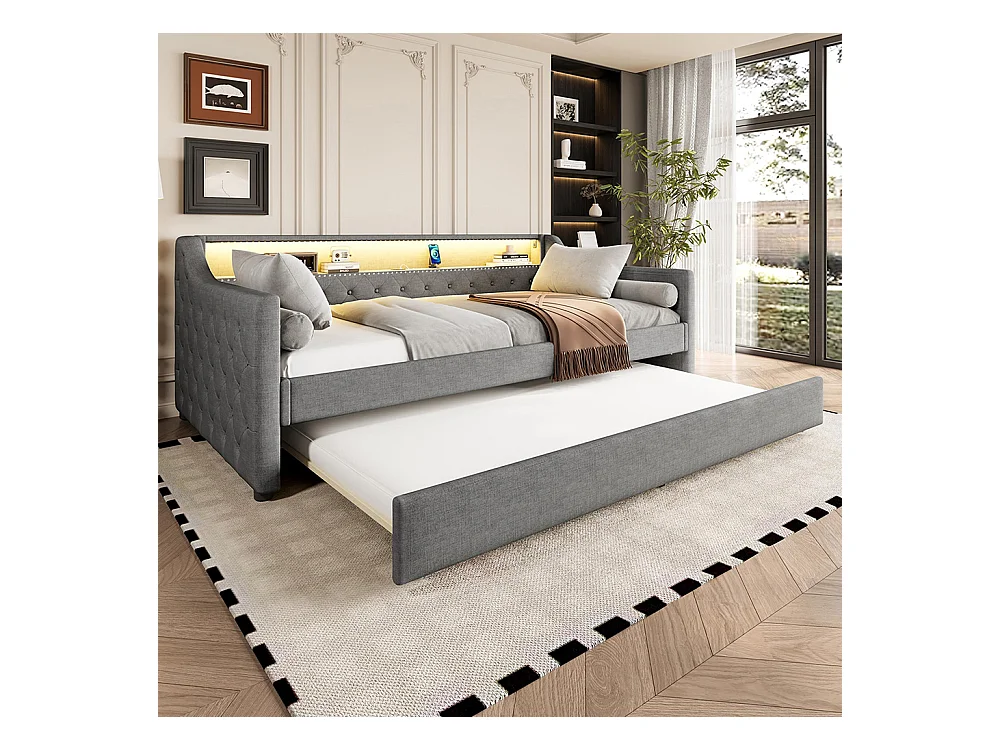 Lit gigogne Lit de jour 90x200 cm avec sommier à lattes éclairage d'ambiance avec télécommande lit avec prise de charge USB lin gris