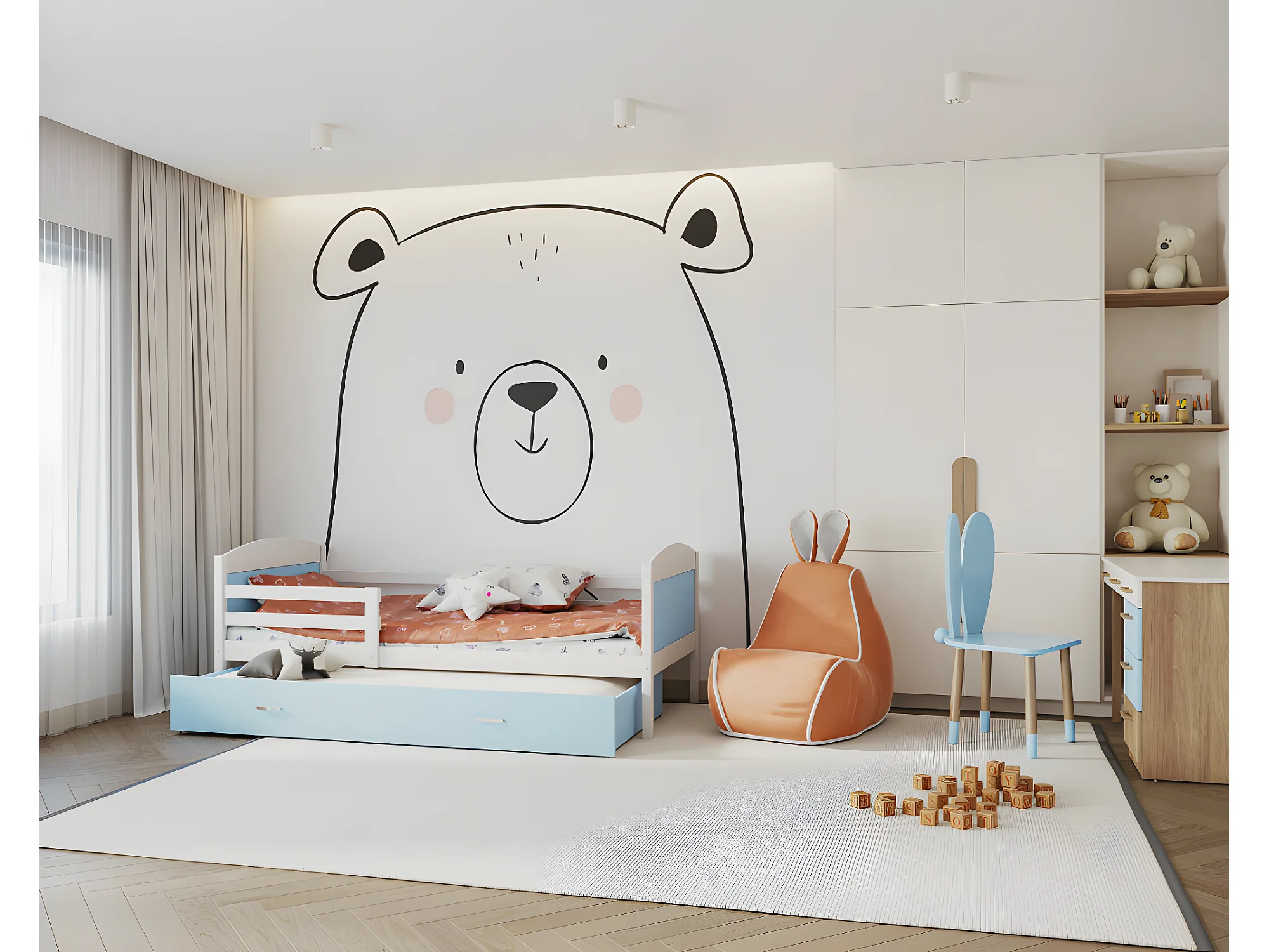 Lit Gigogne Mateo 90x190 Blanc - bleu Livré avec sommiers, tiroir et matelas en mousse de 7cm