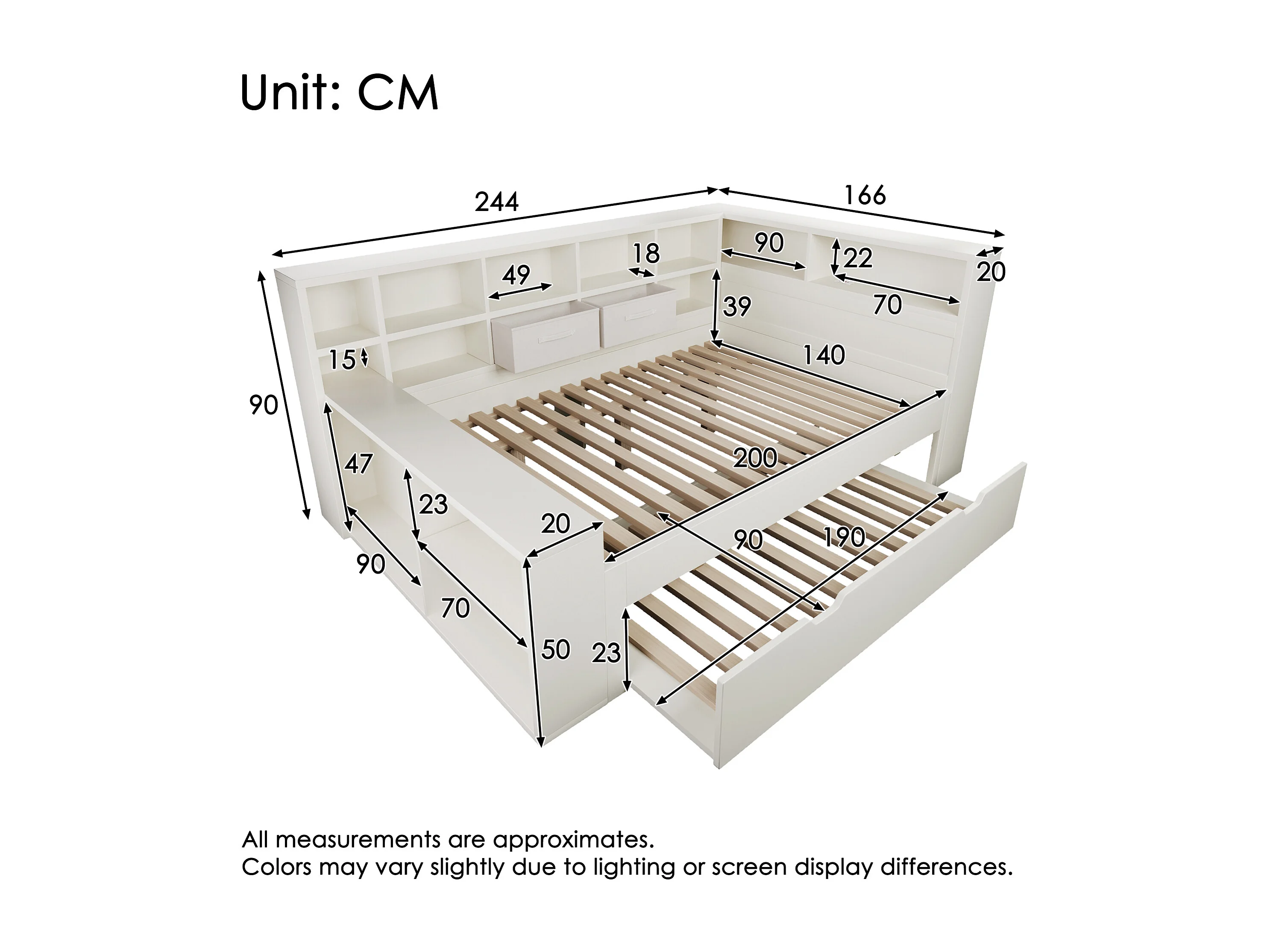Lit gigogne rembourré - 140 x 200 cm - avec lit gigogne 90 x 190 cm + USB + étagère de rangement - bois - blanc