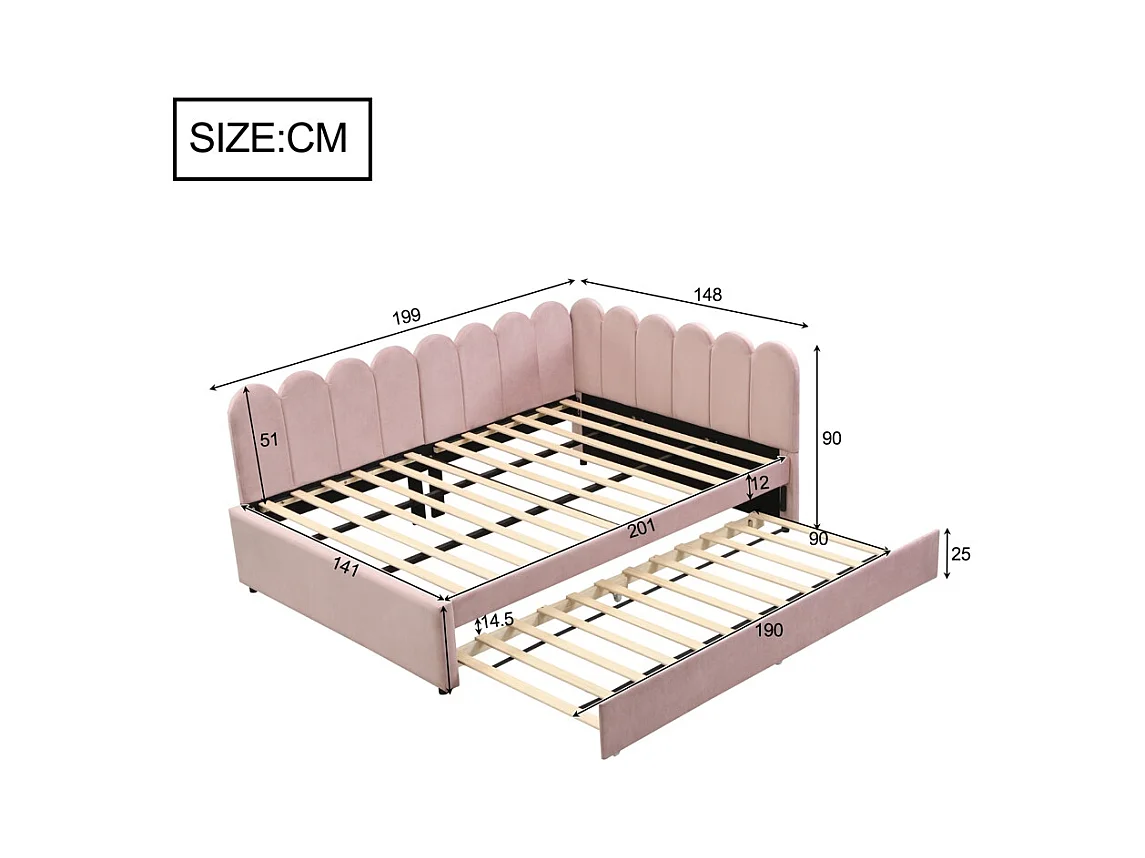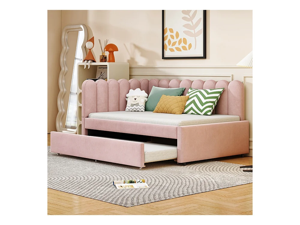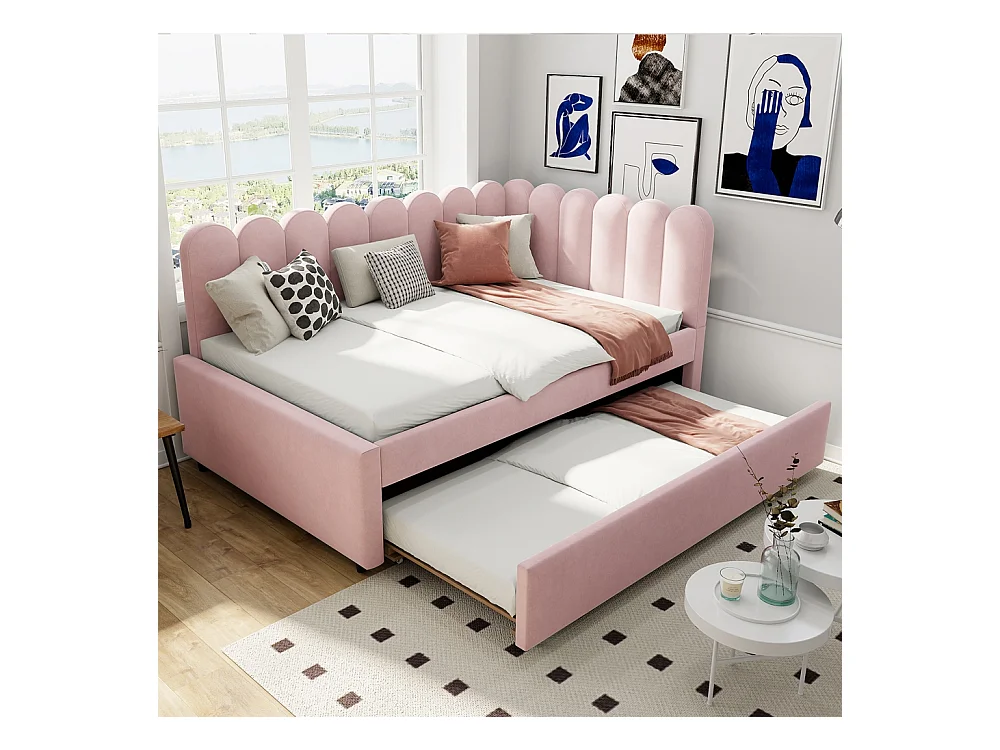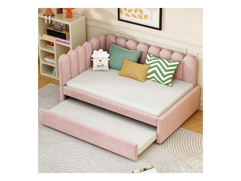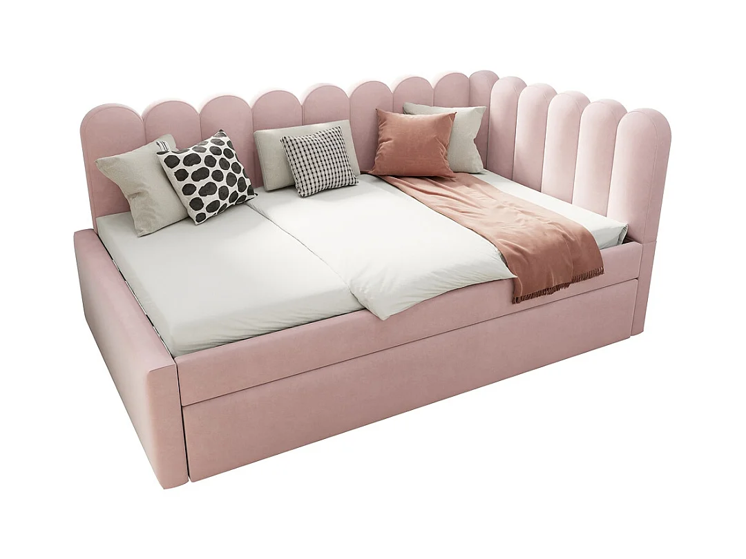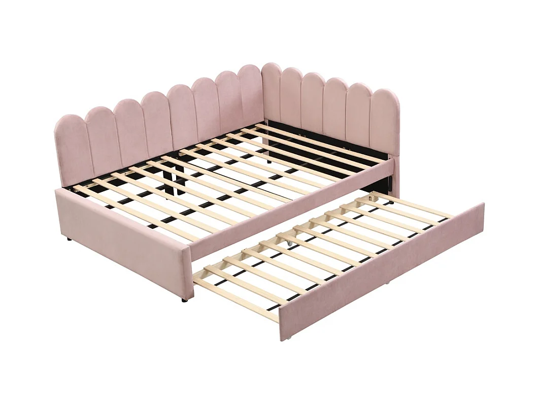 Lit gigogne rembourré en L 140x200 cm avec dossier à fleurs et lit enfant en velours rose
