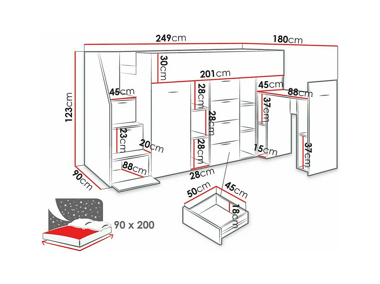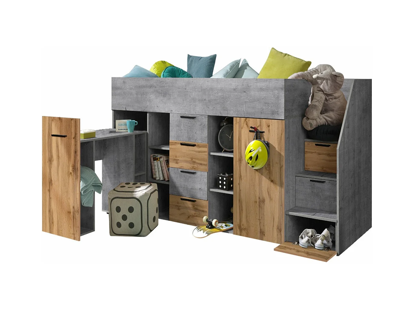 Lit haut Hartford 364, Unique, Gris, 90x200, Stratifié, Sommier à lattes, 180x249x123cm