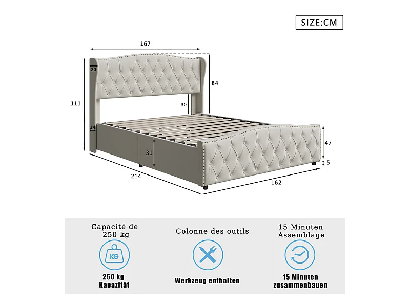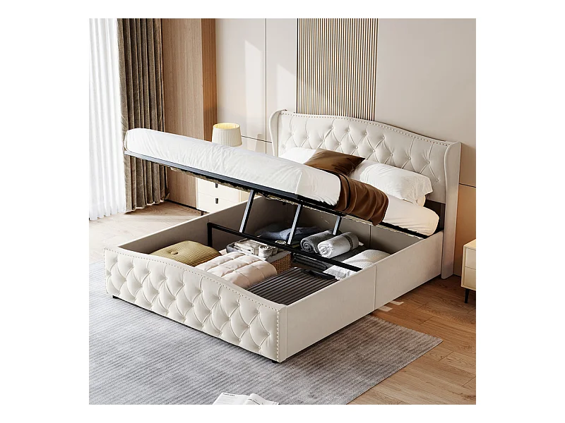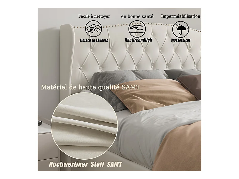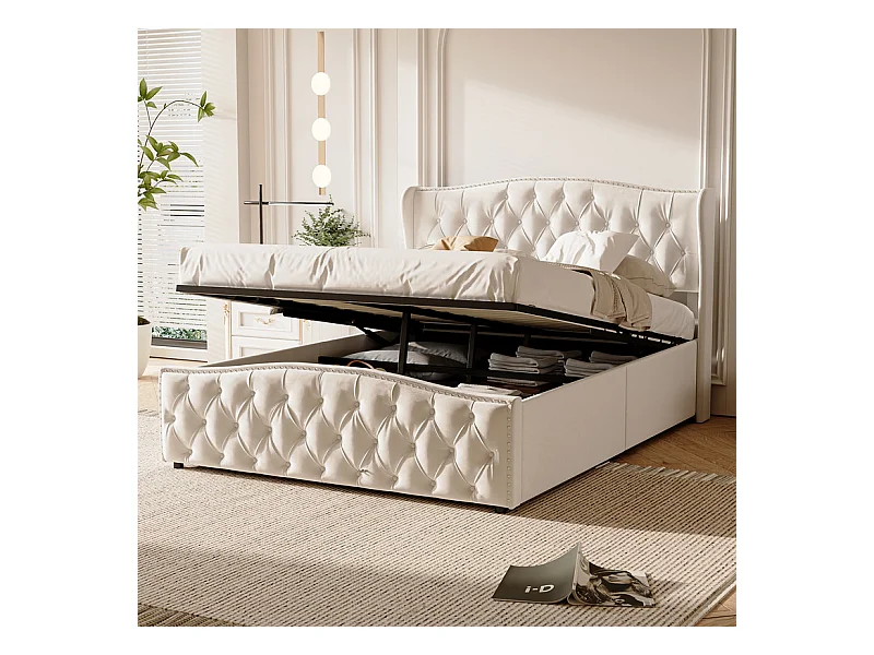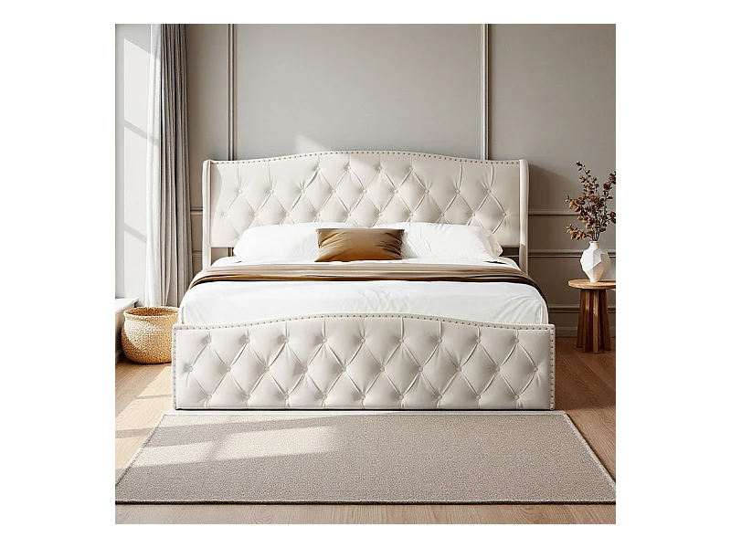 Lit Hydraulique 160x200 avec Rangement - Lit Double Coffre en Tissu SAMT Crème - Tête de Lit Design Vague et Cloutée - Structure 250 kg