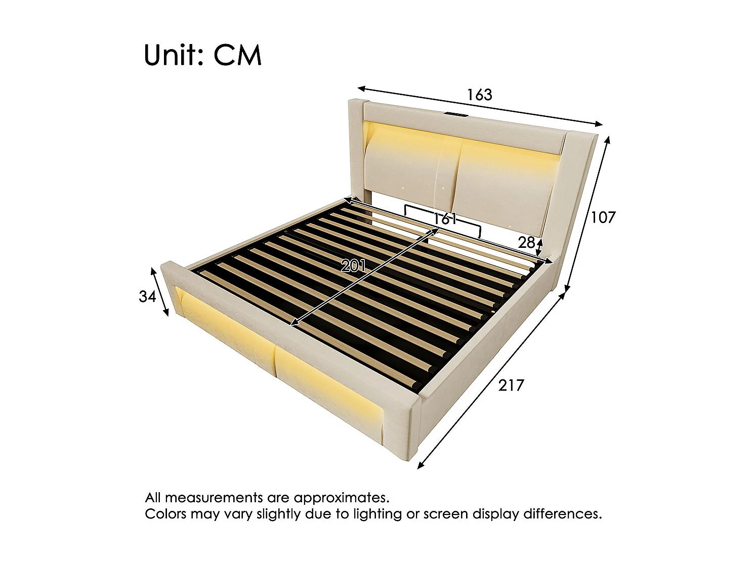 Lit hydraulique avec éclairage LED piloté par application, ports de charge USB et Type-C, velours, beige - 160x200 cm.