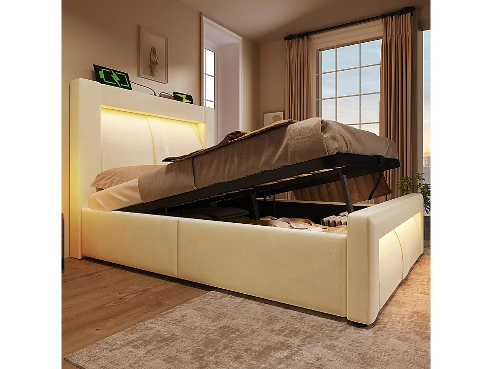 Lit hydraulique avec éclairage LED piloté par application, ports de charge USB et Type-C, velours, beige - 90x200 cm.