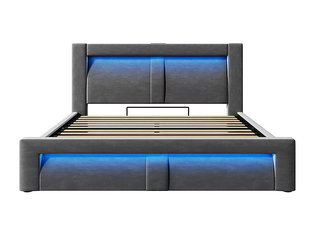 Lit hydraulique avec éclairage LED piloté par application, ports de charge USB et Type-C, velours, gris - 160x200 cm.