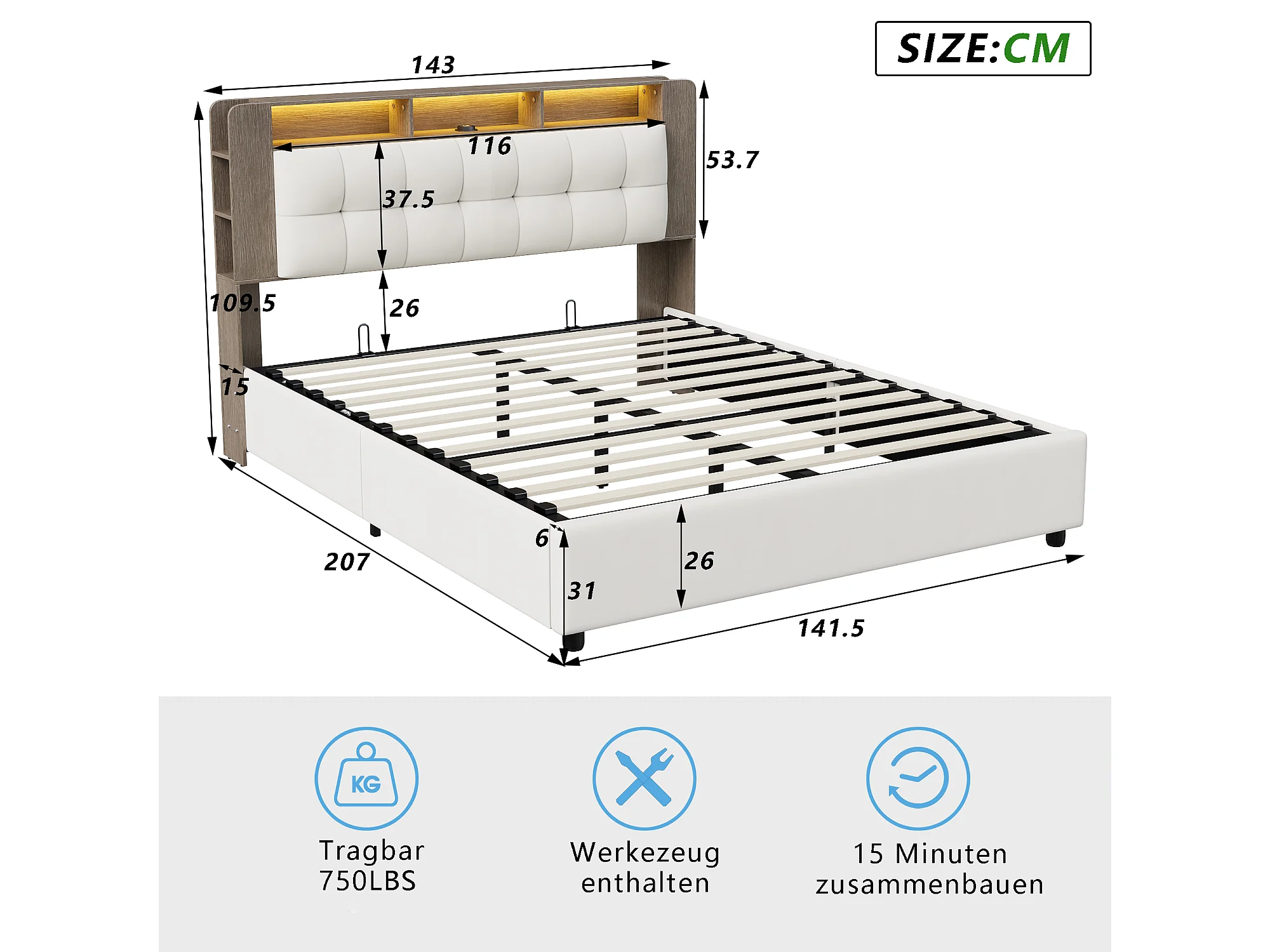 Lit hydraulique avec espace de stockage et lumières LED - lit double rembourré avec charge sans fil - cadre de lit en velours pour adultes - 140x200cm