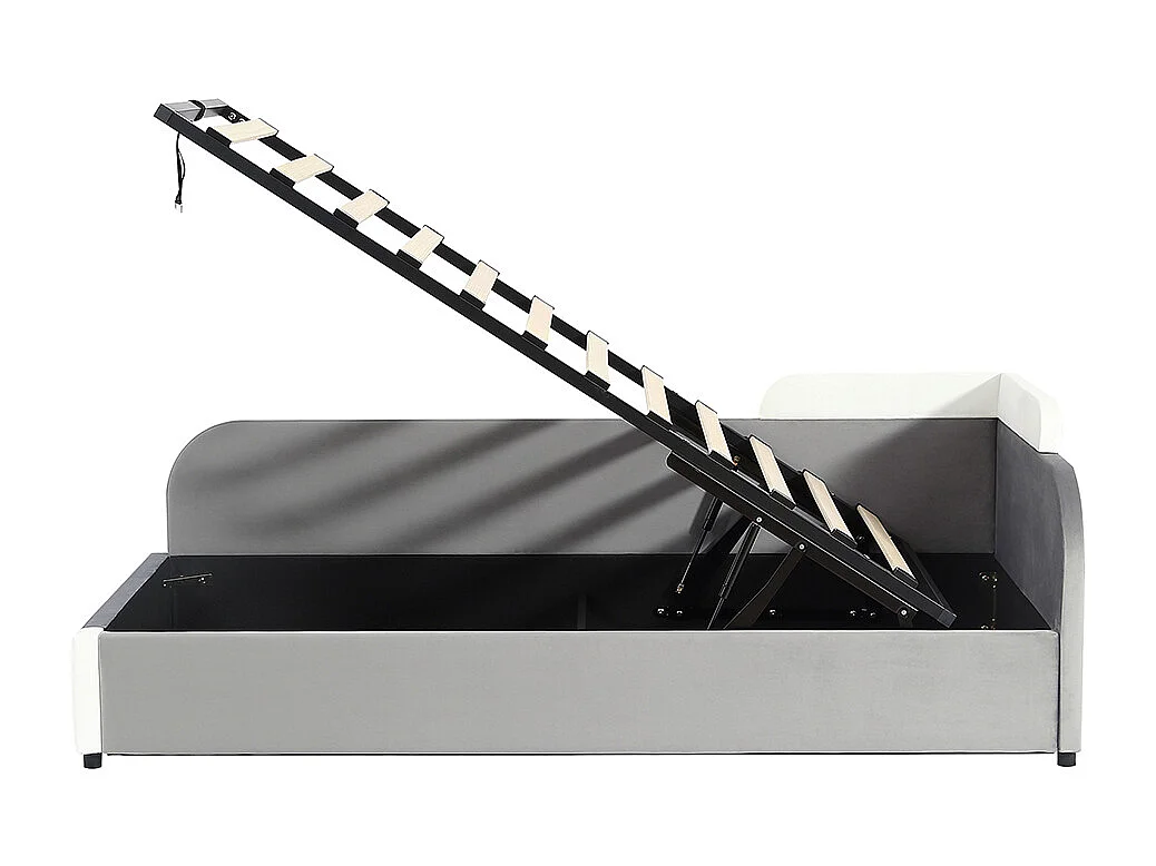 Lit hydraulique pour enfants 90x200cm, barrières souples, panneau latéral gauche, velours + contreplaqué, gris